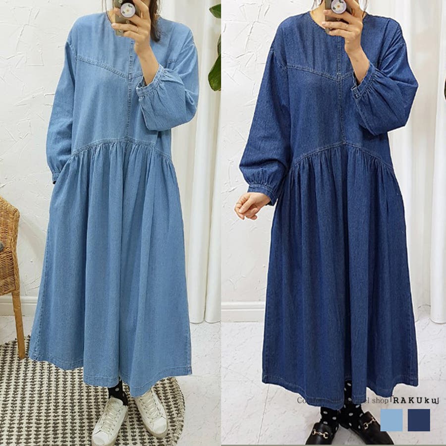 韓国ファッション デニムワンピース ロング丈