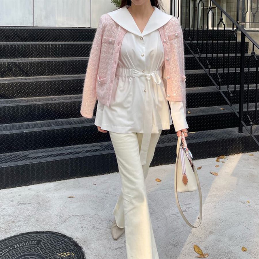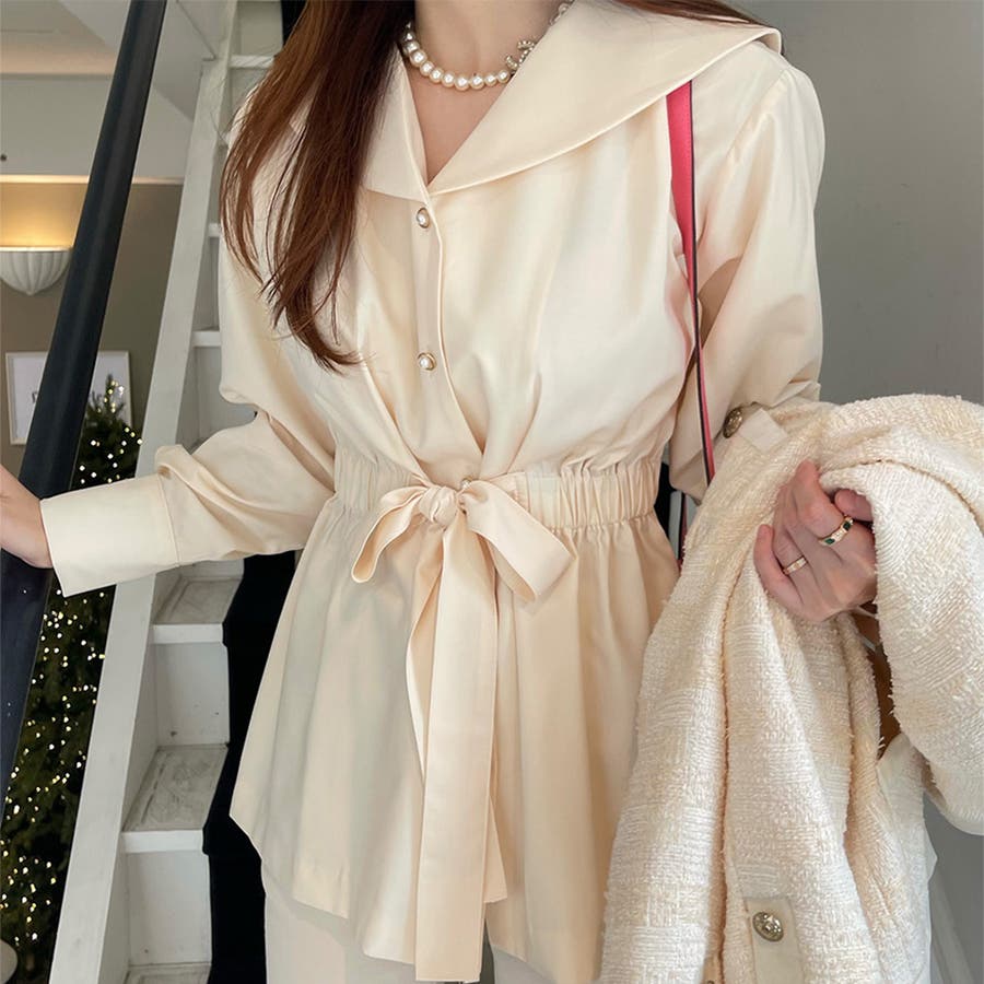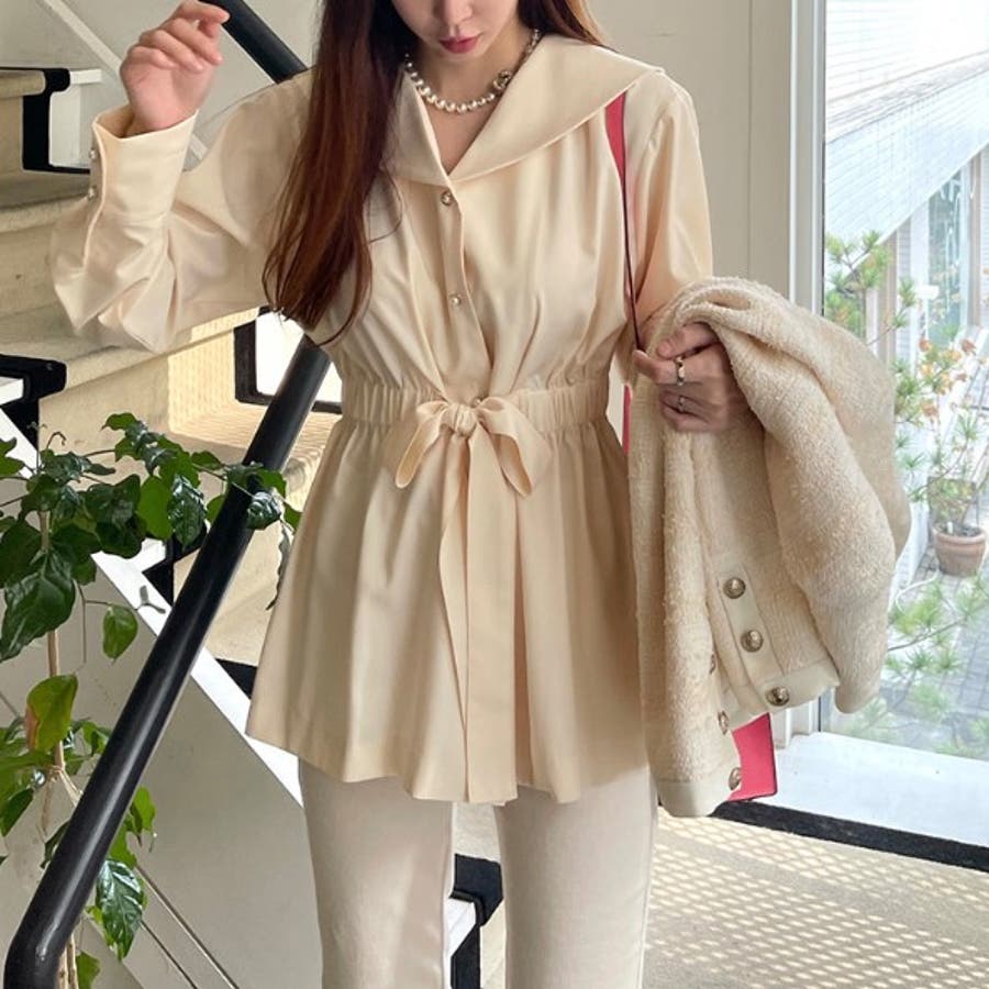 ビッグ襟 セーラーカラー ブラウス 長袖ブラウス シルク風 韓国ファッション