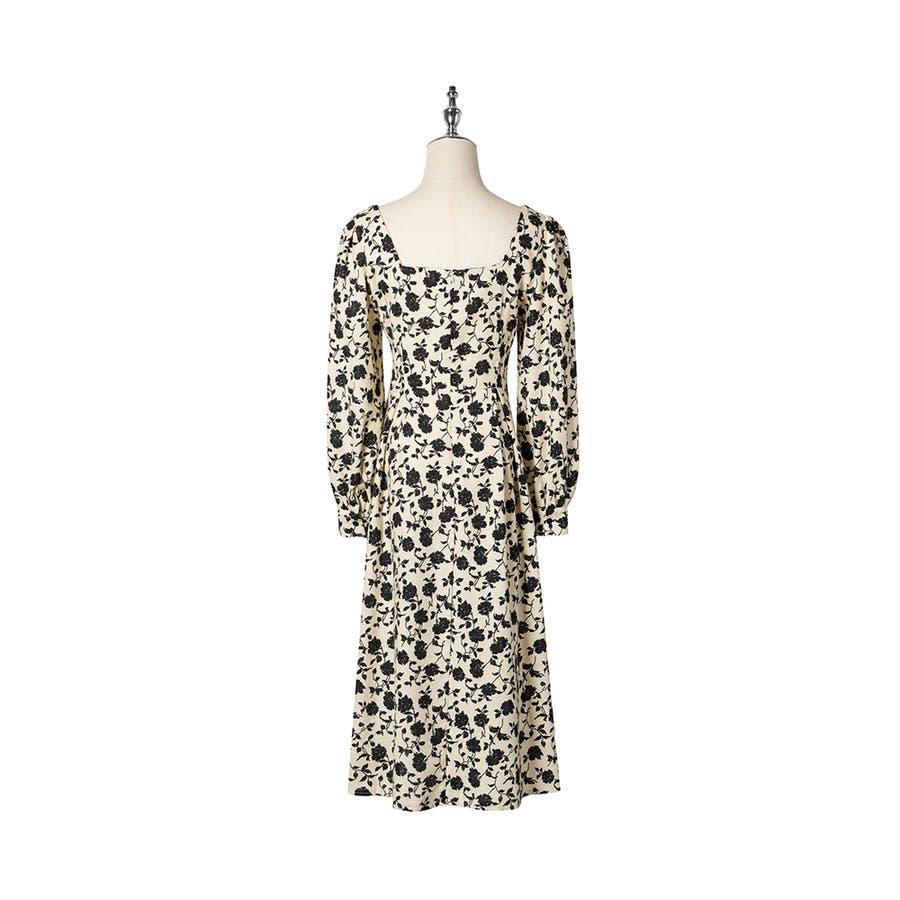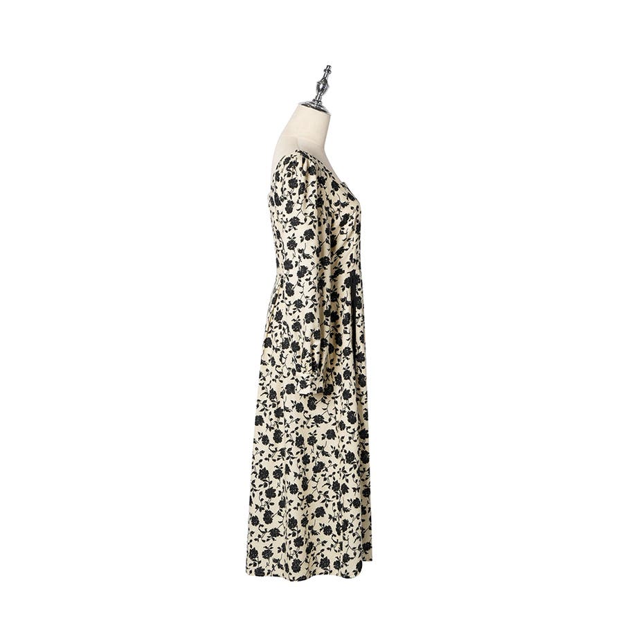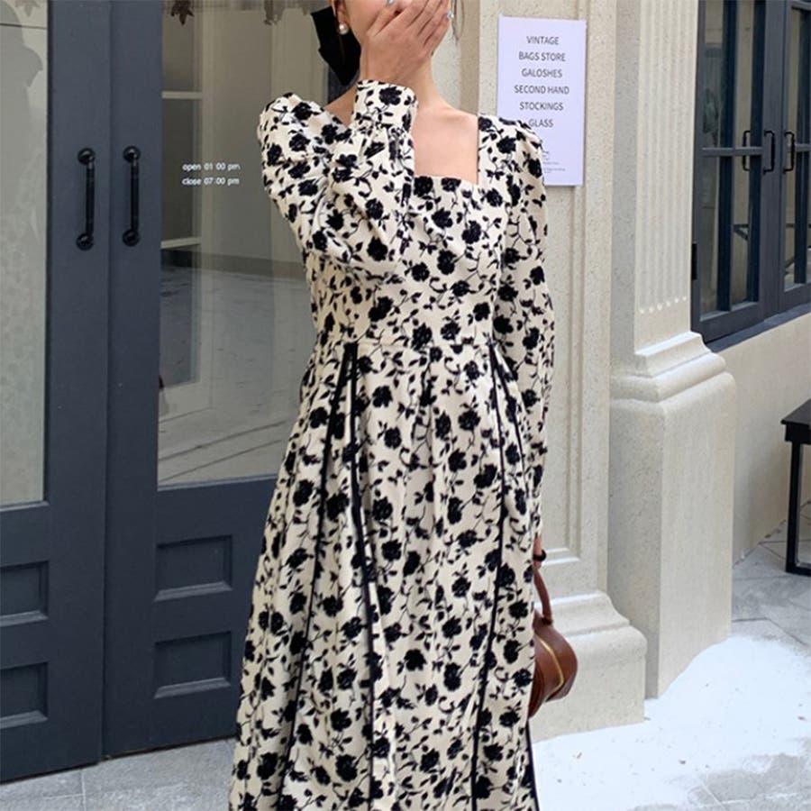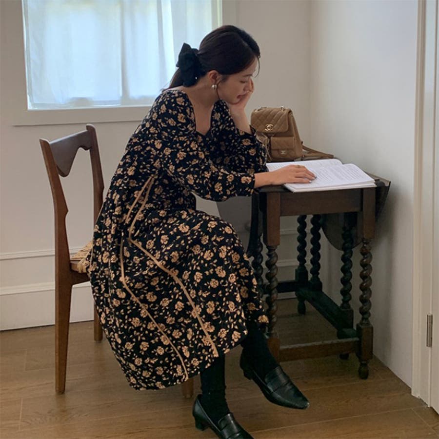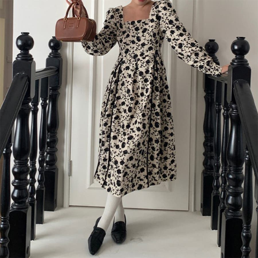 レーディス ワンピース ワンピ 春 長袖 ロング丈 ミモレ丈 ロングワンピース 体型カバー ゆったり 花柄 韓国ファッション rakuku