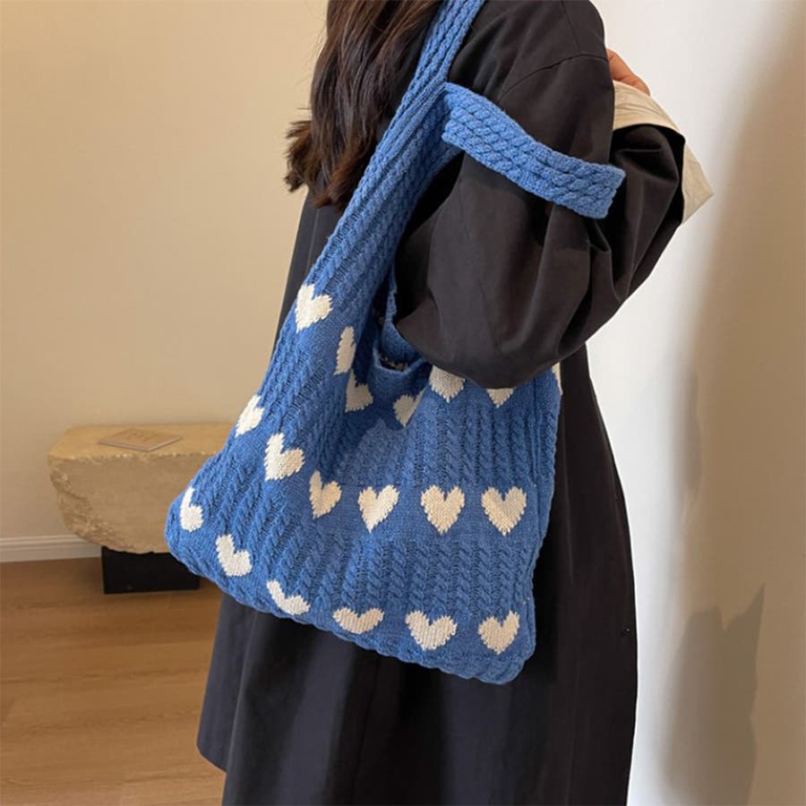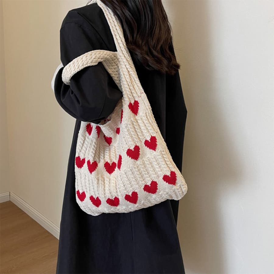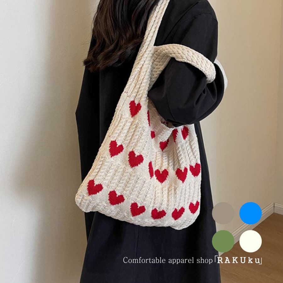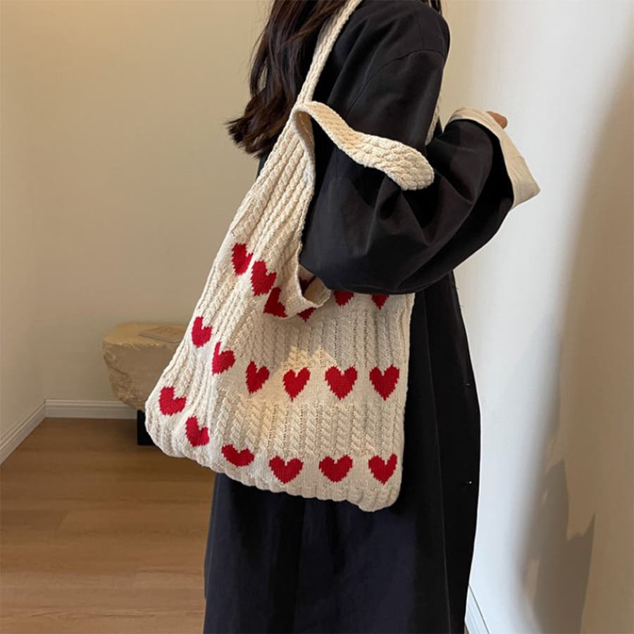 トートバッグ ニットバッグ デイリーバッグ エコバッグ ハート柄 編みニットバッグ 大容量収納 韓国ファッション 軽量 お出かけ Rakuku