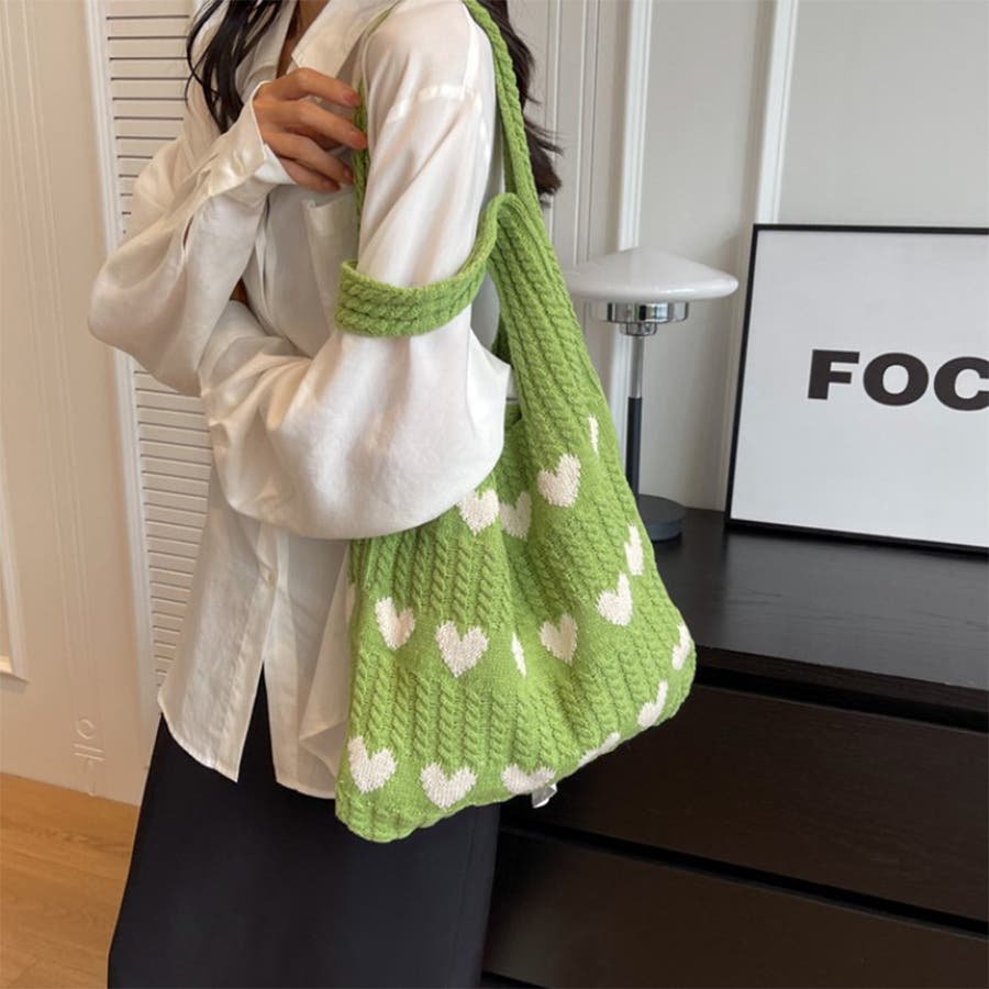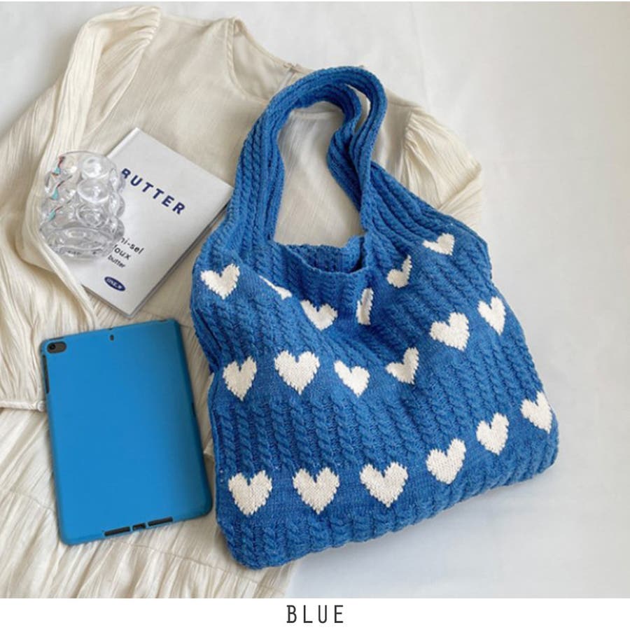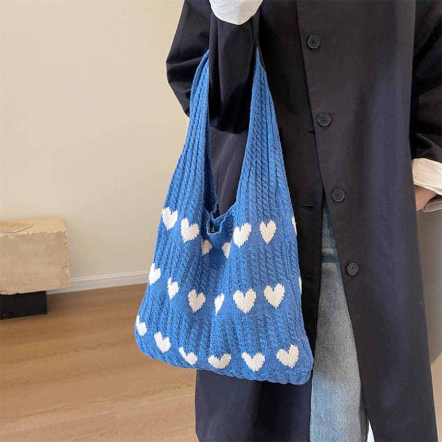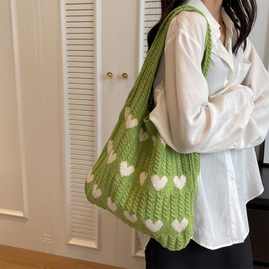 トートバッグ ニットバッグ デイリーバッグ エコバッグ ハート柄 編みニットバッグ 大容量収納 韓国ファッション 軽量 お出かけ Rakuku