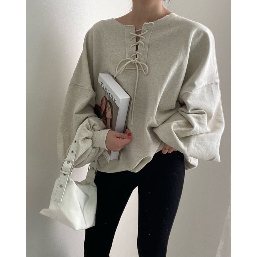 2color ラウンドレースアップ ランタンスリーブスウェット