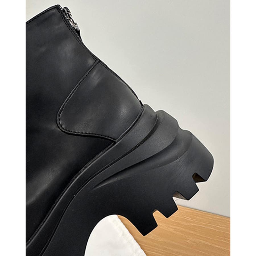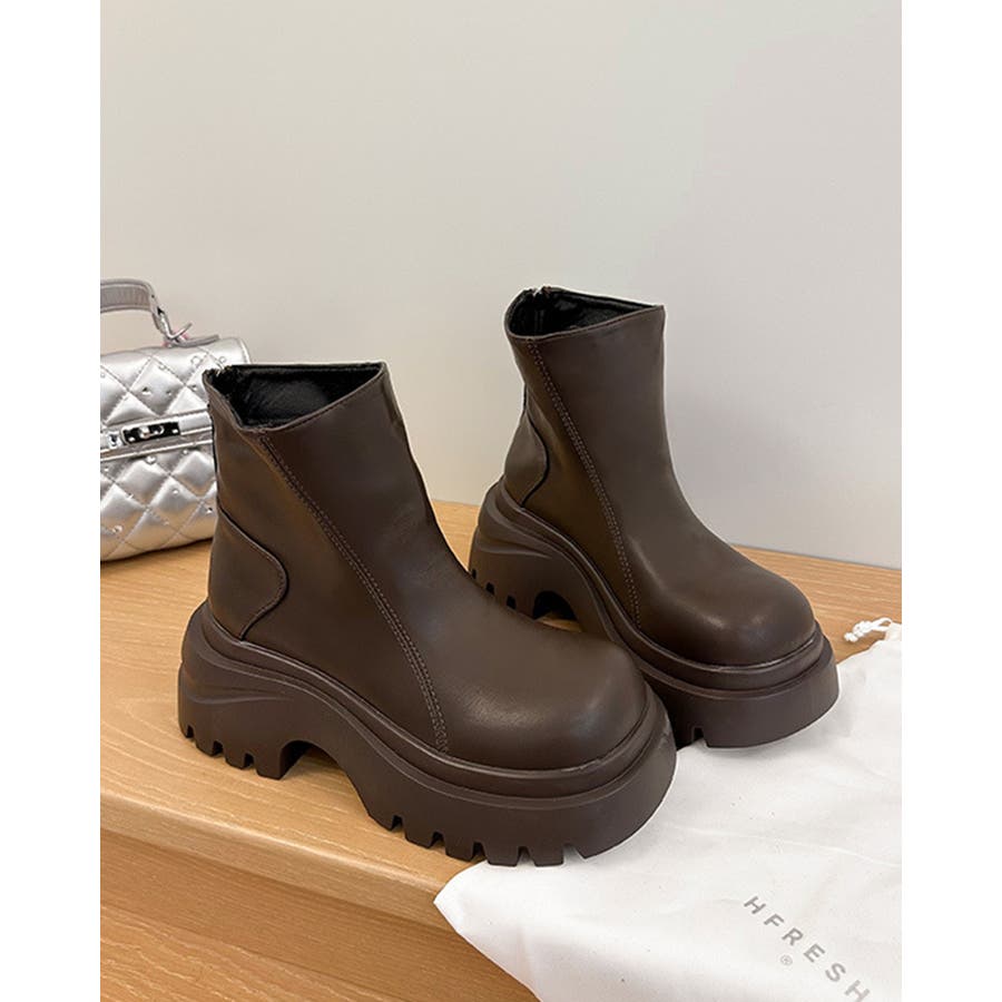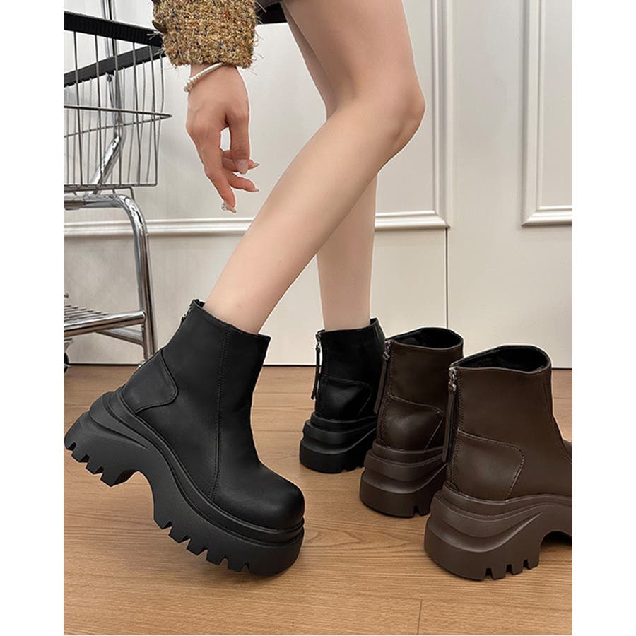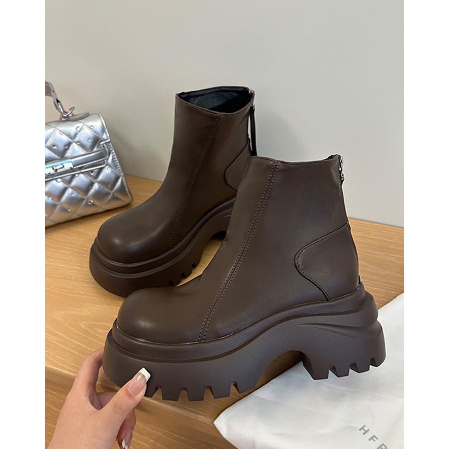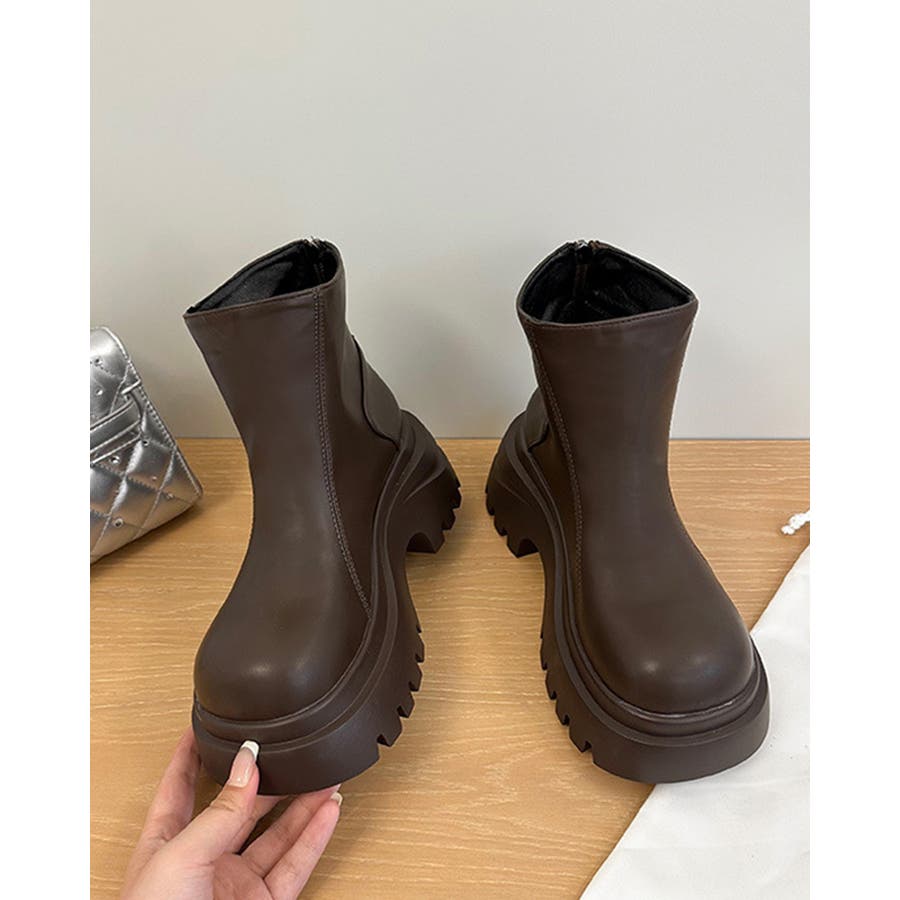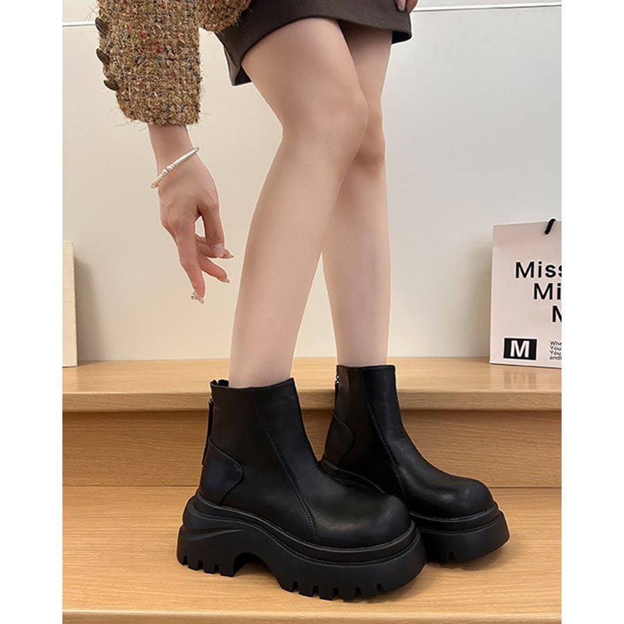 ボリューム感たっぷりの厚底ソールで、履くだけでスタイルアップが叶うショートブーツ。シンプルなデザインながら、丸みのあるフォルムがトレンド感をプラス。柔らかいレザー調素材で履き心地も抜群。後ろファスナーで脱ぎ履きもラクちん◎デニムやスカートにも合わせやすく、秋冬コーデの主役アイテムにおすすめです。