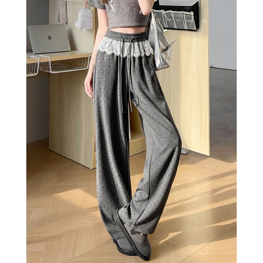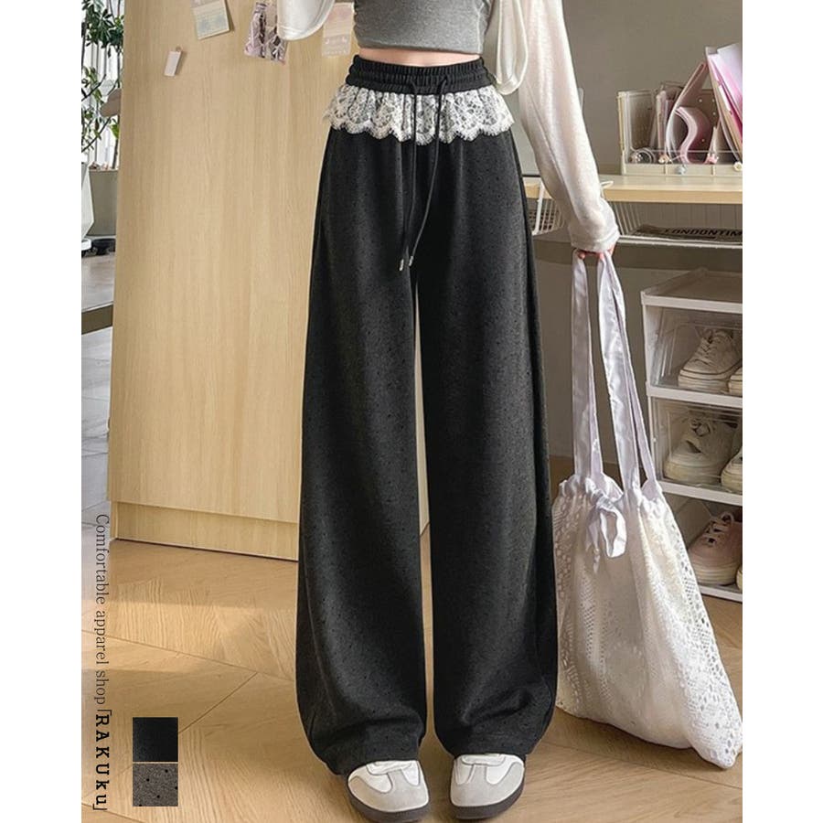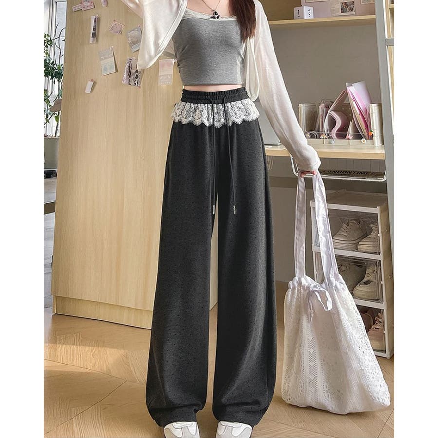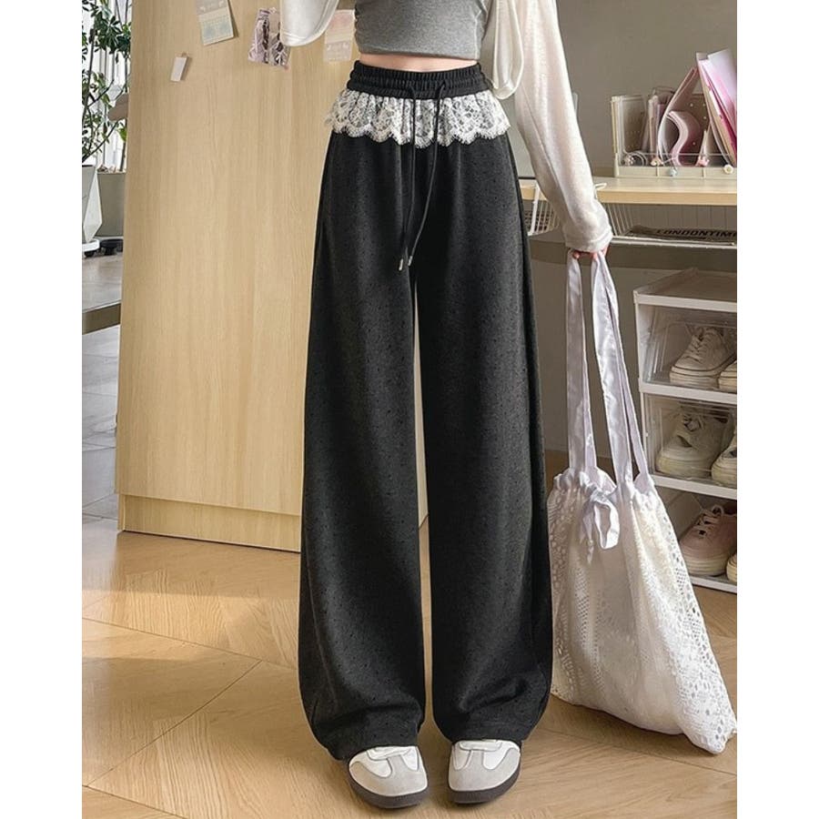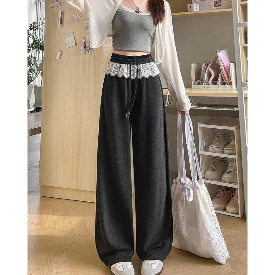 ボトムス パンツ レース付きパンツ ウエストゴム ワイドパンツ スウェットパンツ 韓国ファッション