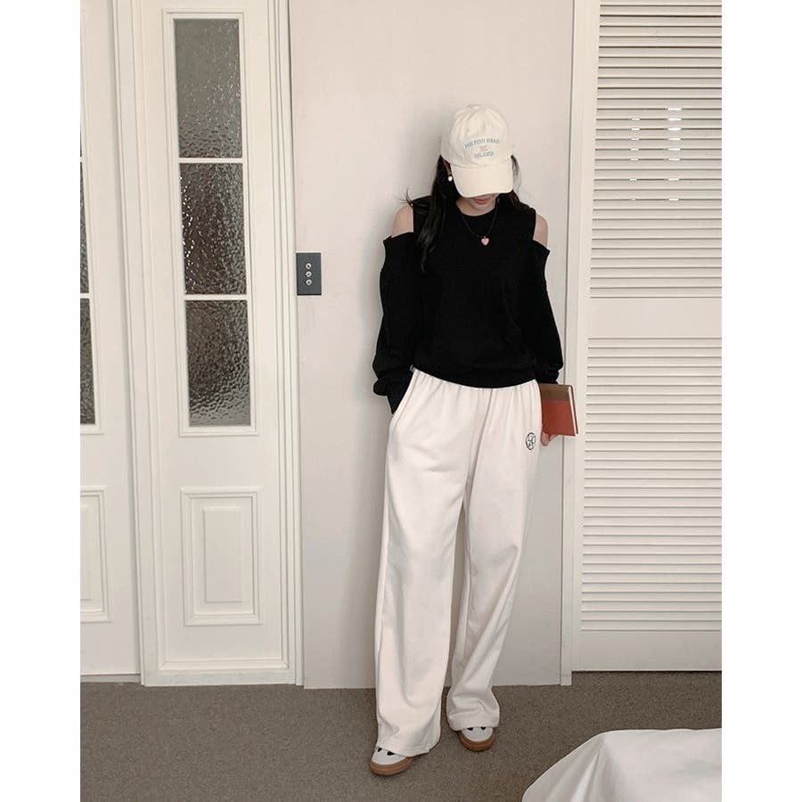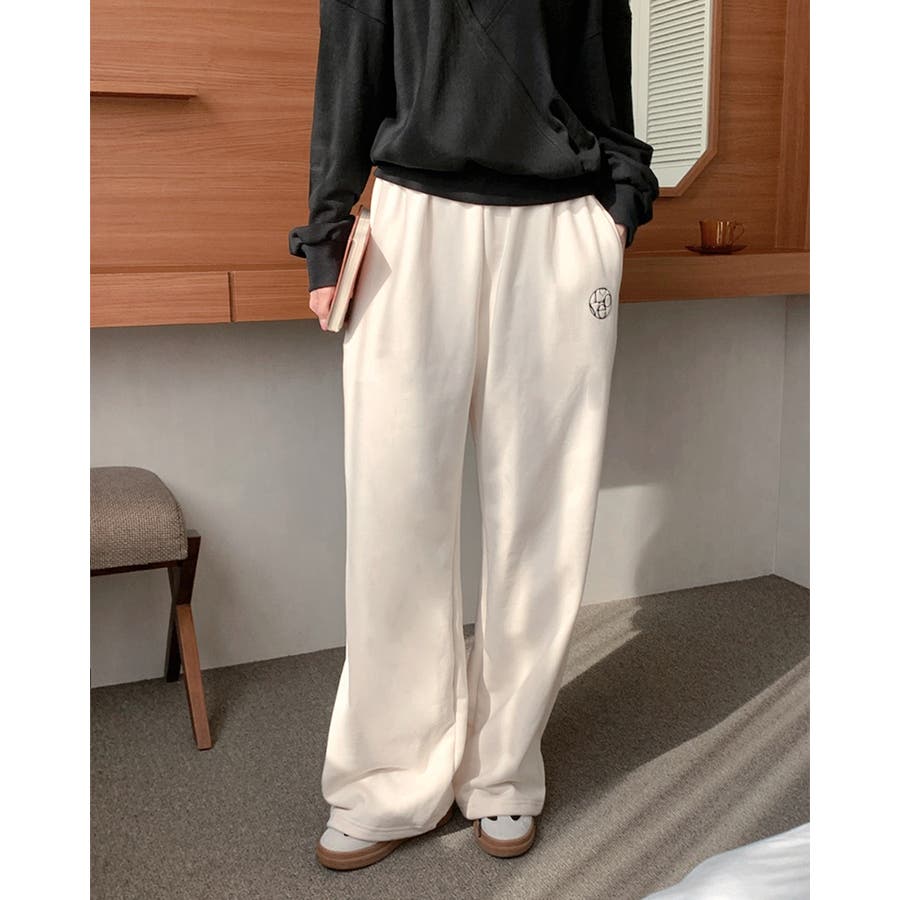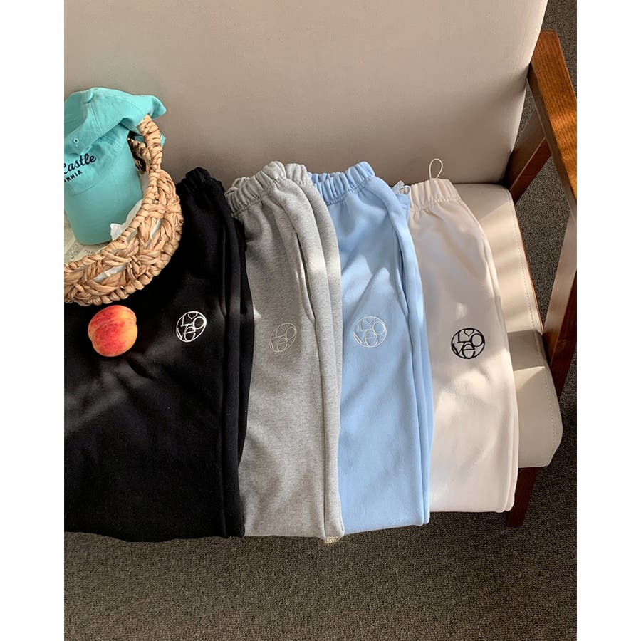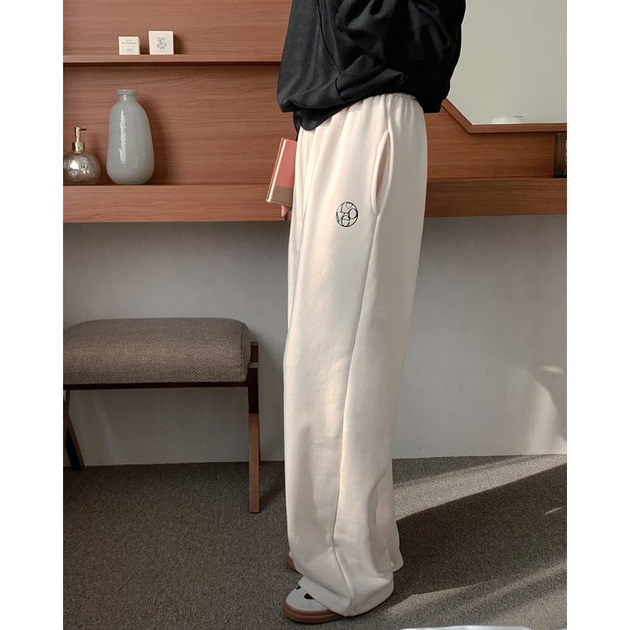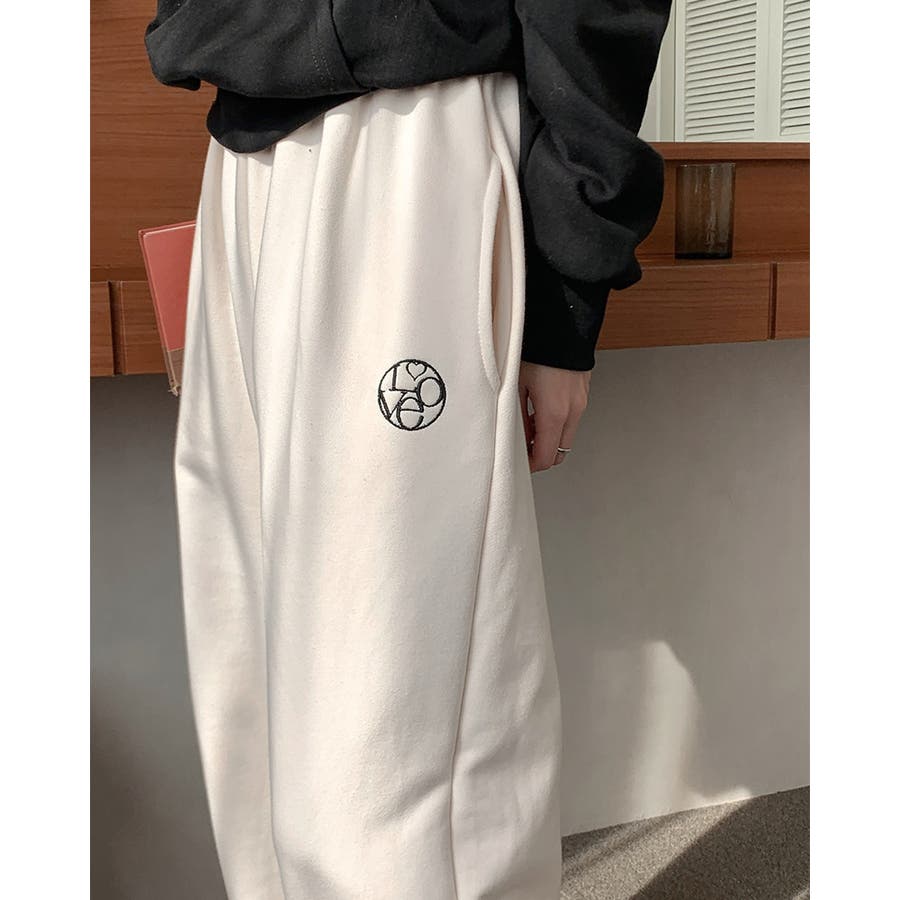 左脚のさりげない「LOVE」の刺繍が大人可愛い2WAYドロストスウェットパンツ。