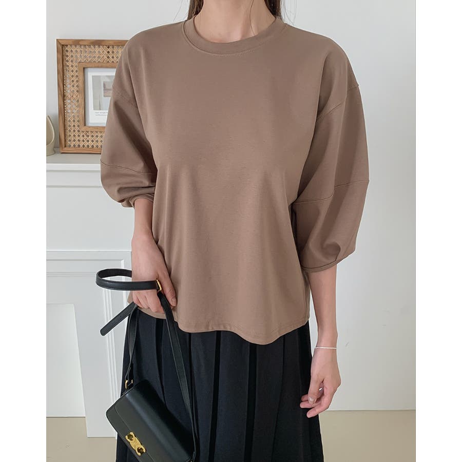 ステッチパフスリーブラウンドトップス 7分袖 オフィス