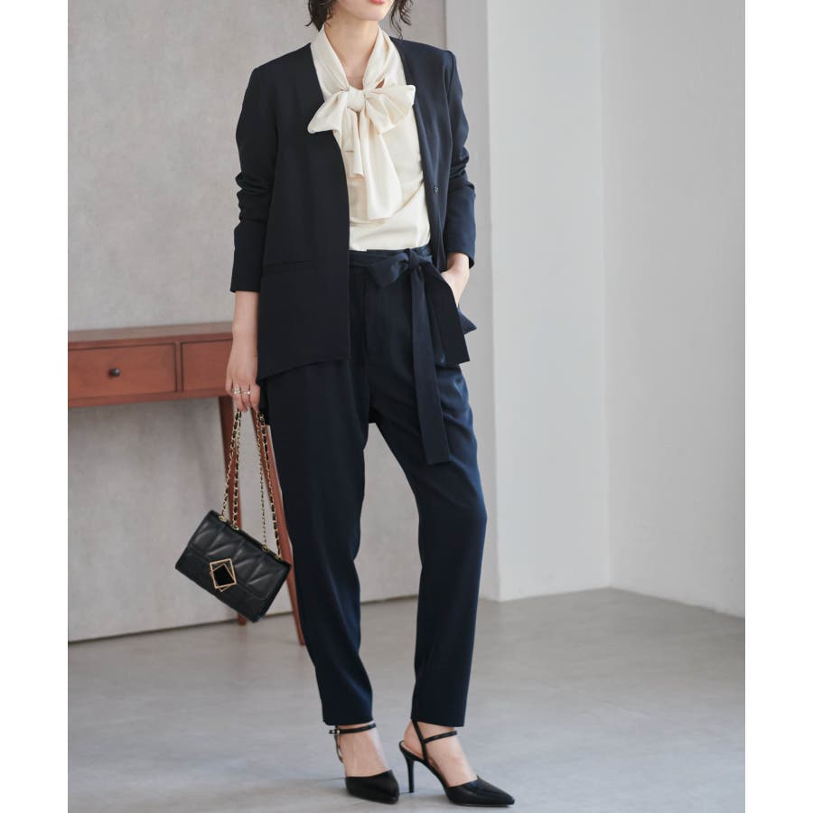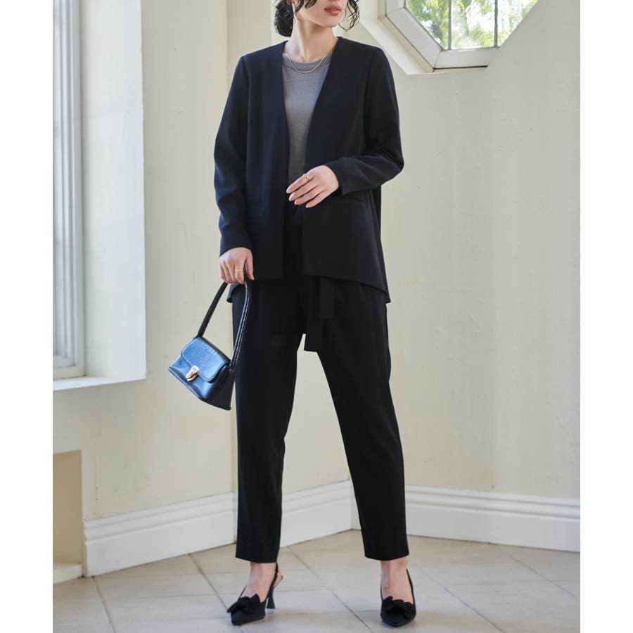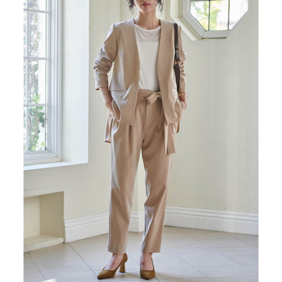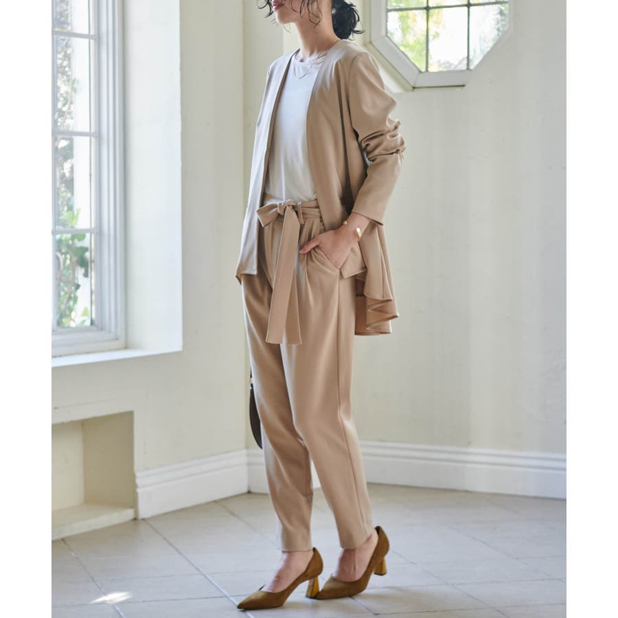 ■point ・フレア・Aラインシルエットが印象的なジャケットは、長めの後ろ丈がヒップまわりをすっきりカバー ・テーパードパンツはき心地と美脚見せシルエットを両立 ・共布ベルト付きでスタイルチェンジも