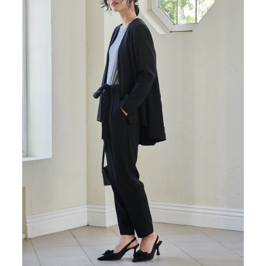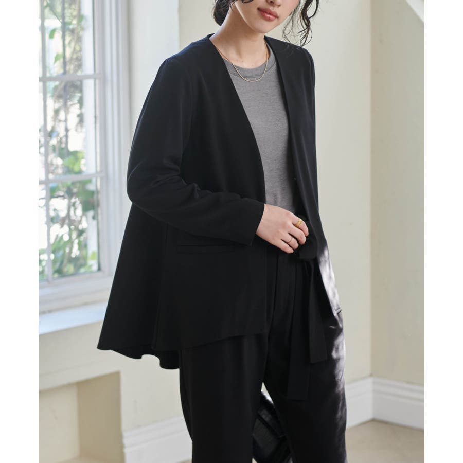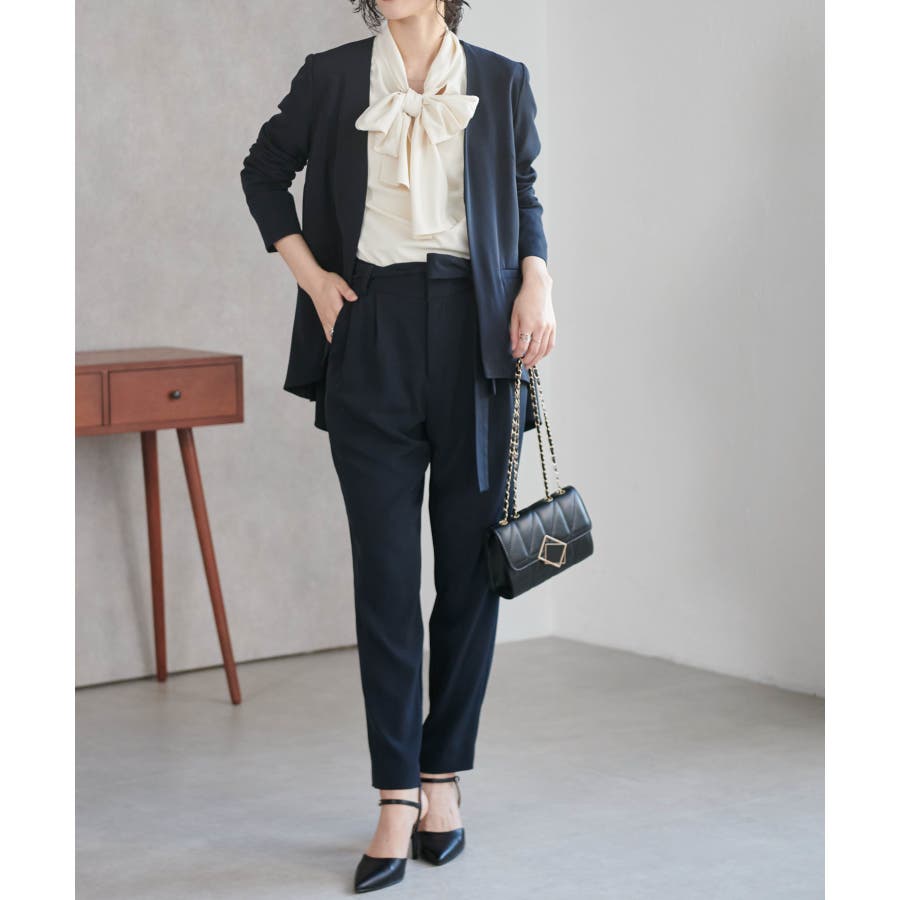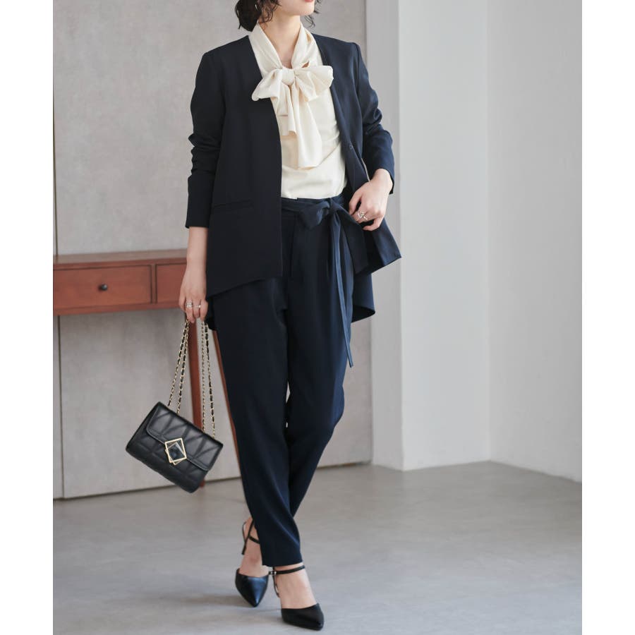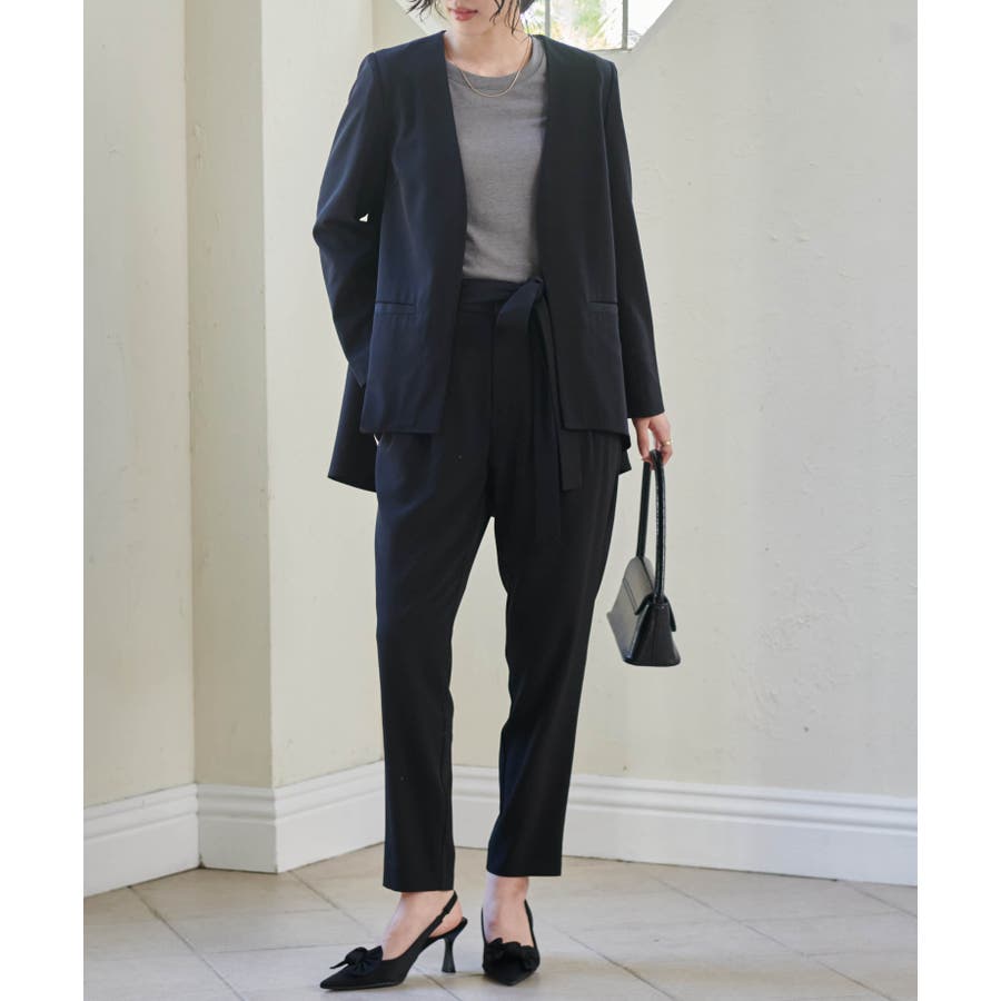 ■point ・フレア・Aラインシルエットが印象的なジャケットは、長めの後ろ丈がヒップまわりをすっきりカバー ・テーパードパンツはき心地と美脚見せシルエットを両立 ・共布ベルト付きでスタイルチェンジも