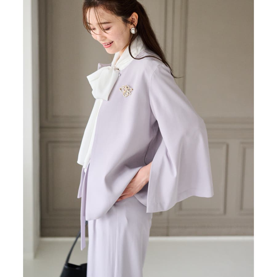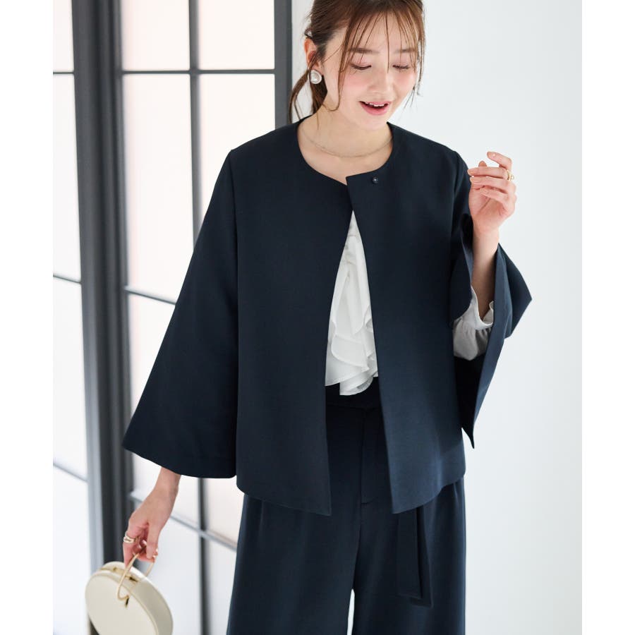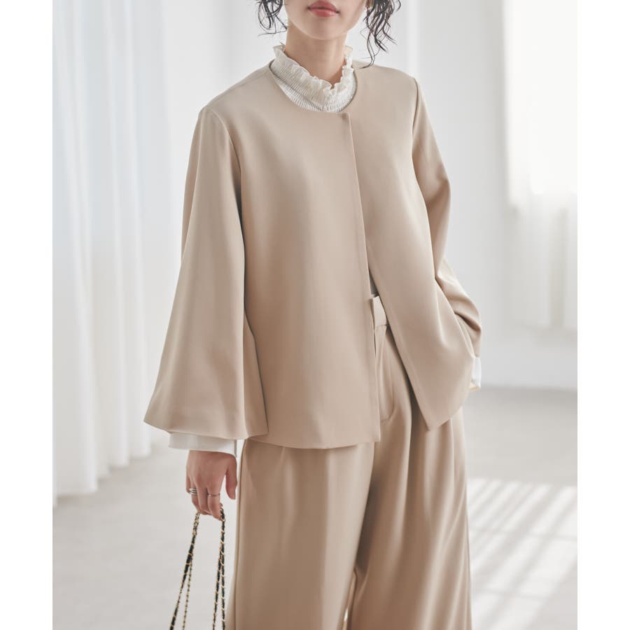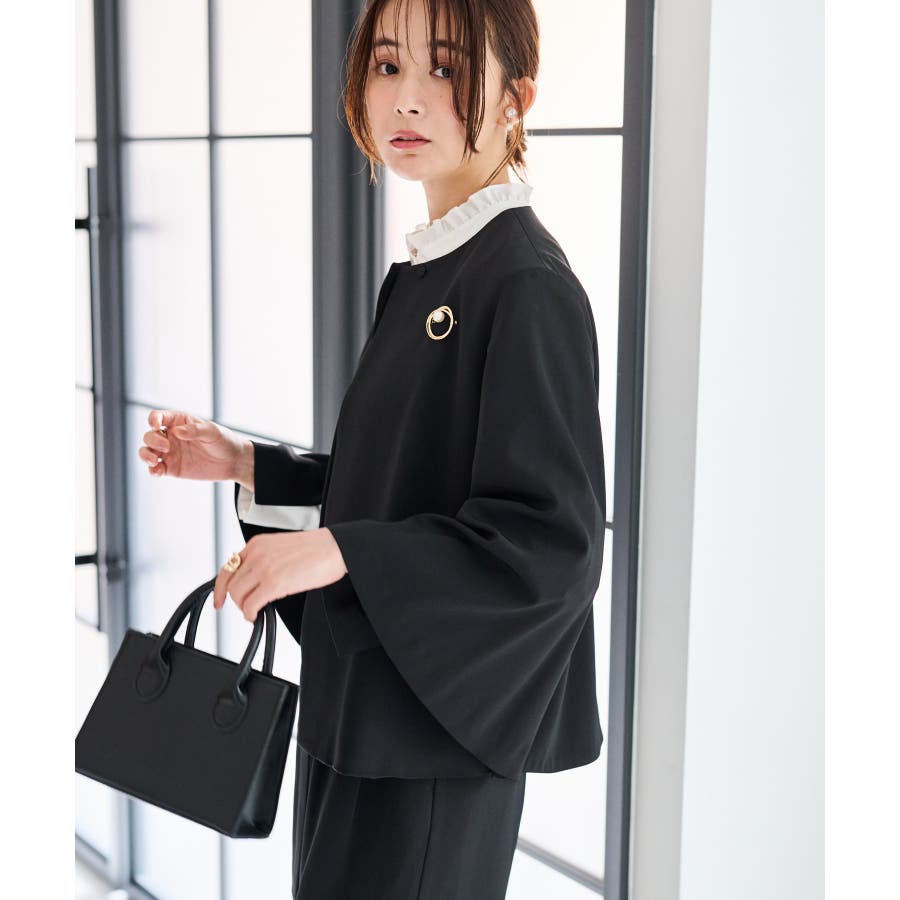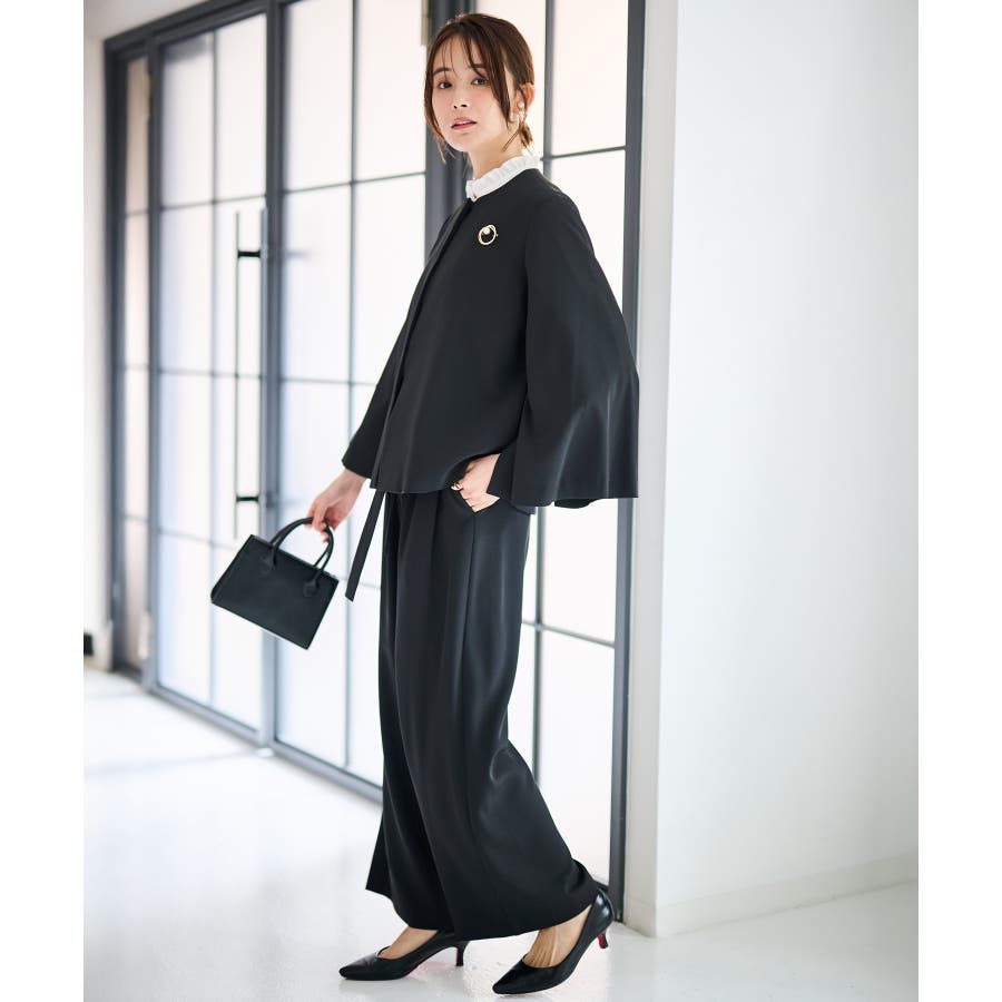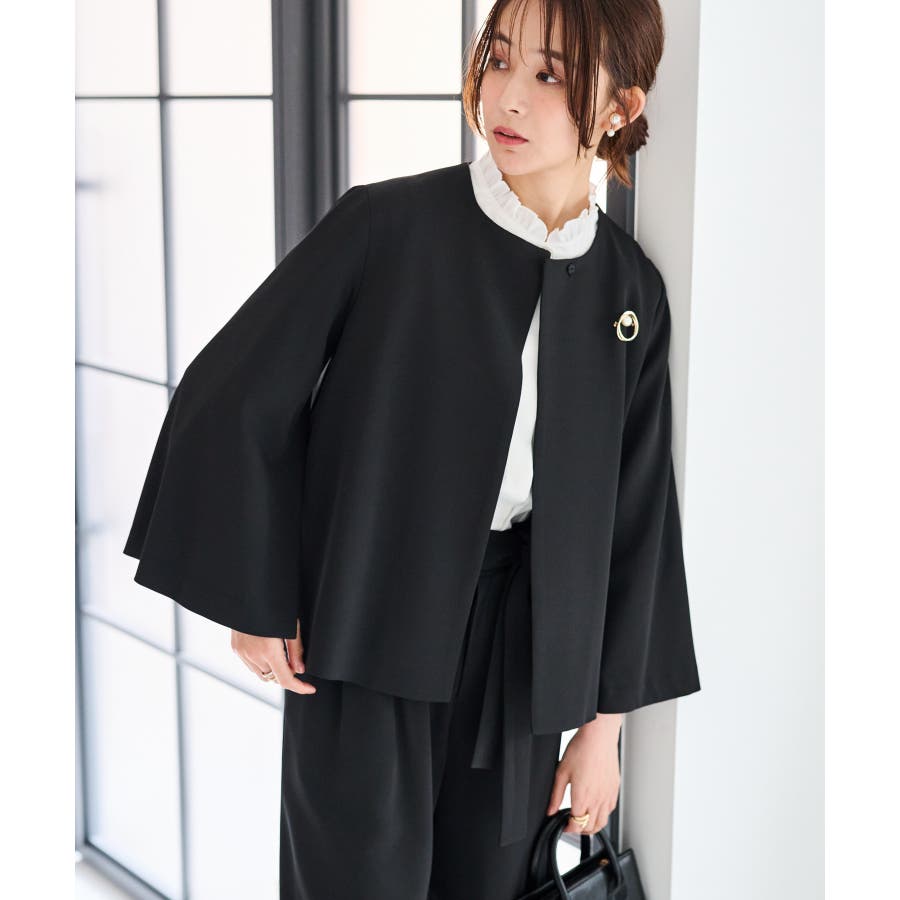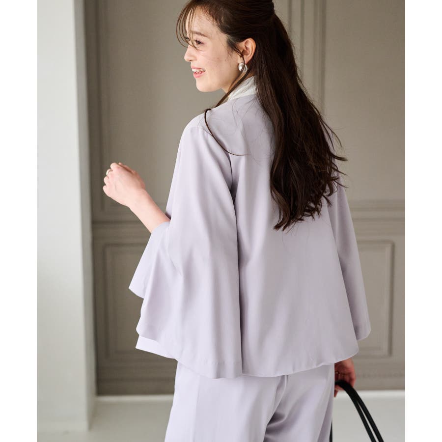 トレンド感のあるケープ風シルエットで女性らしいおしゃれ見えスーツ