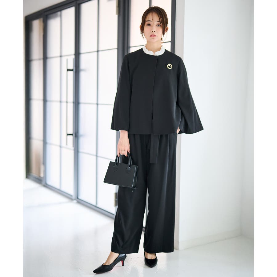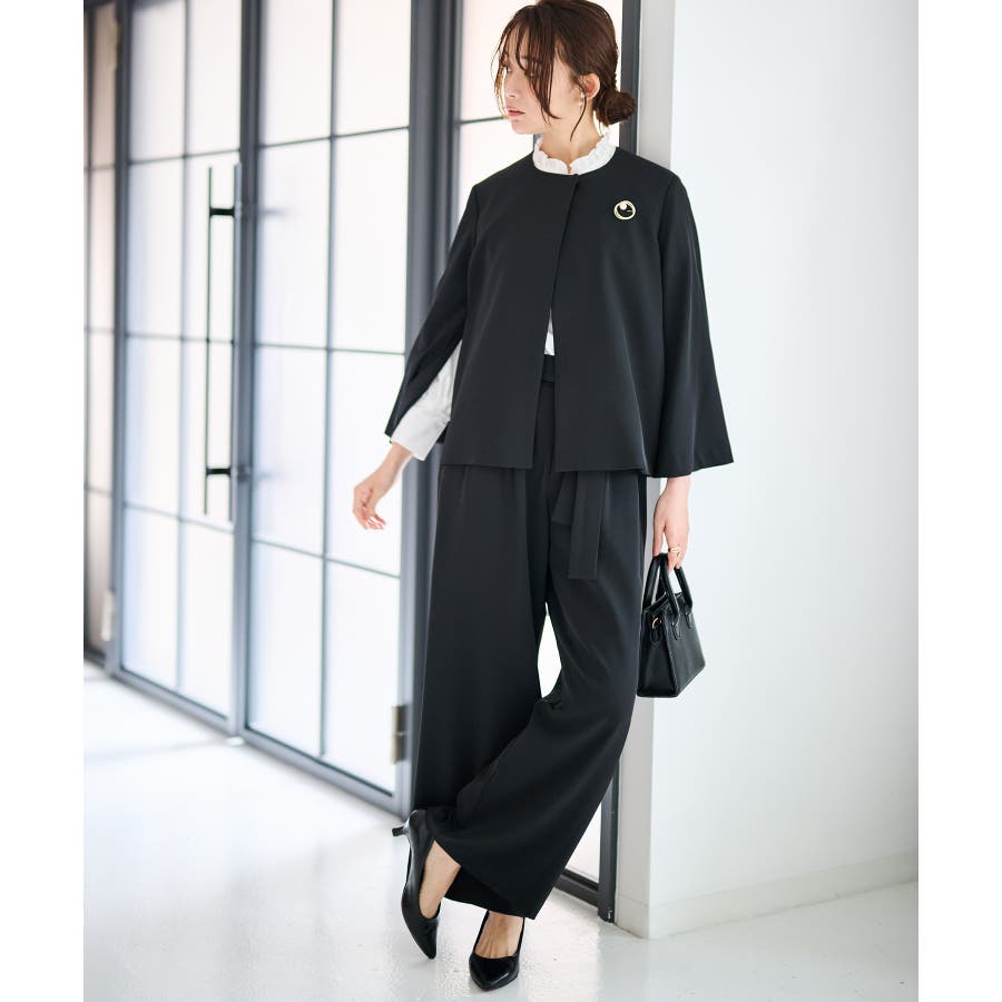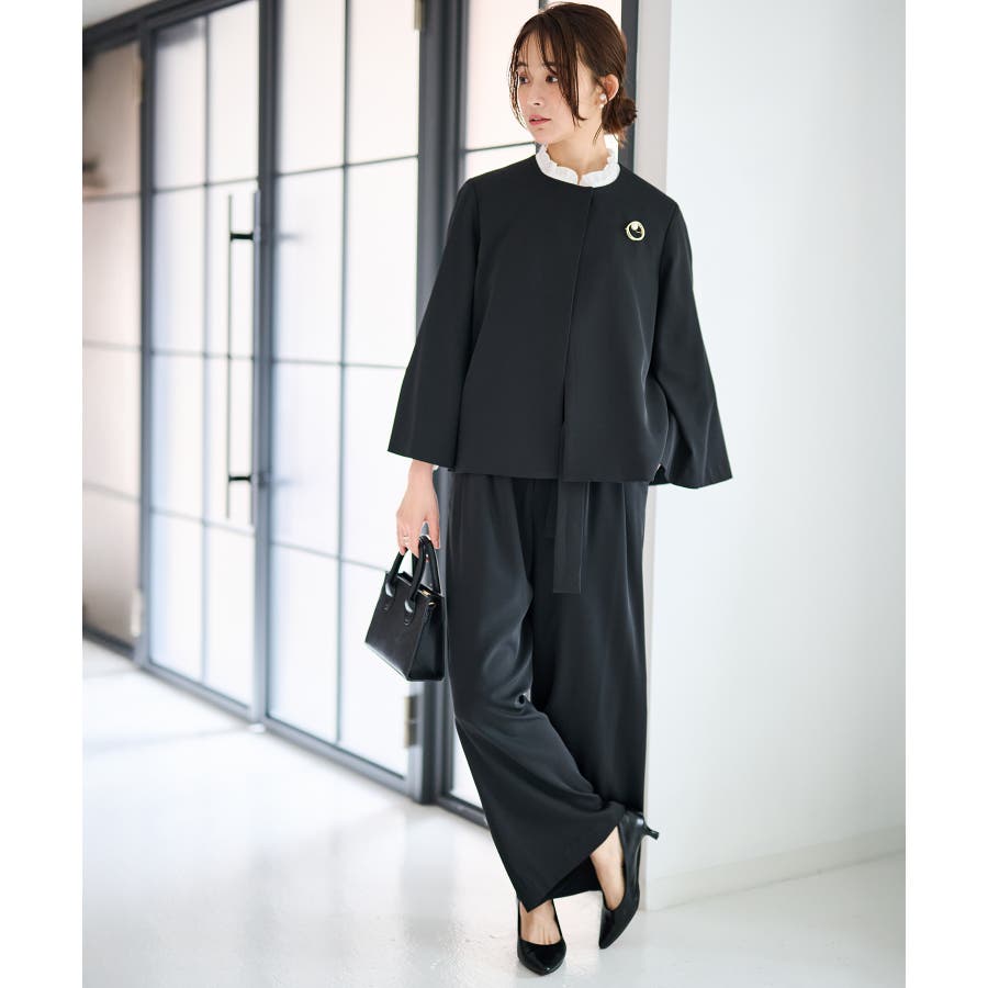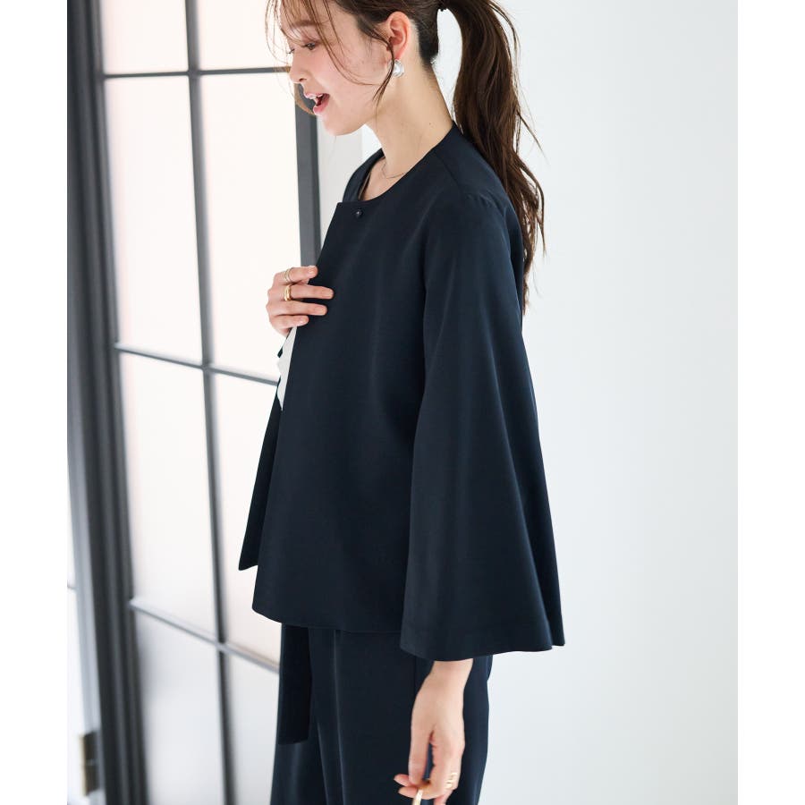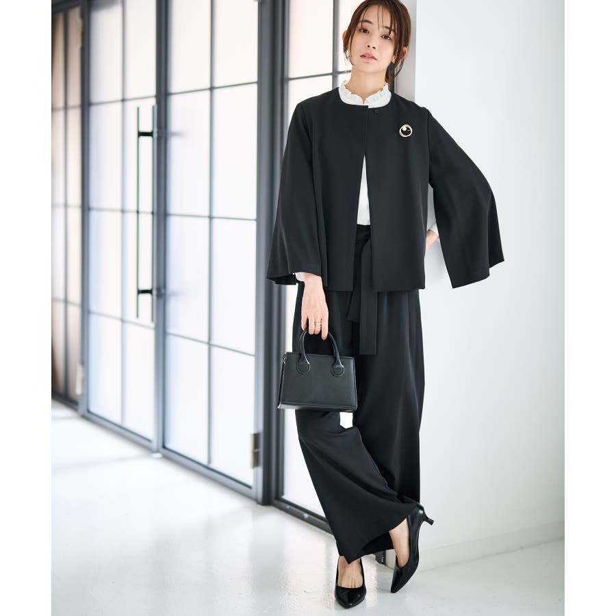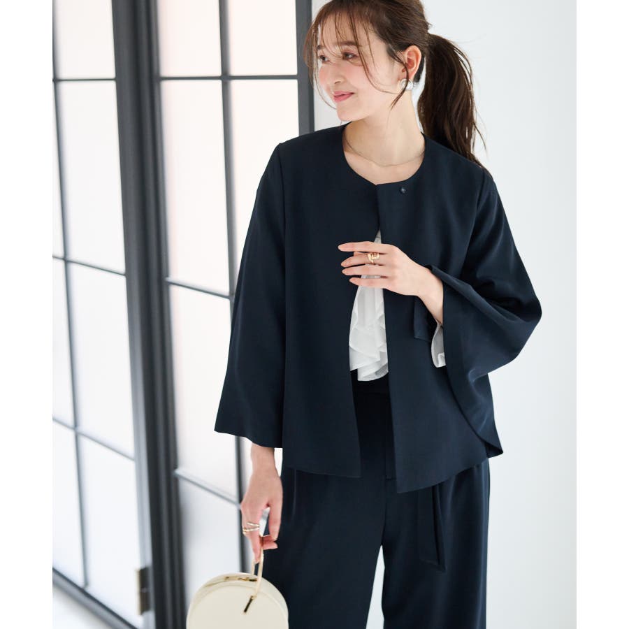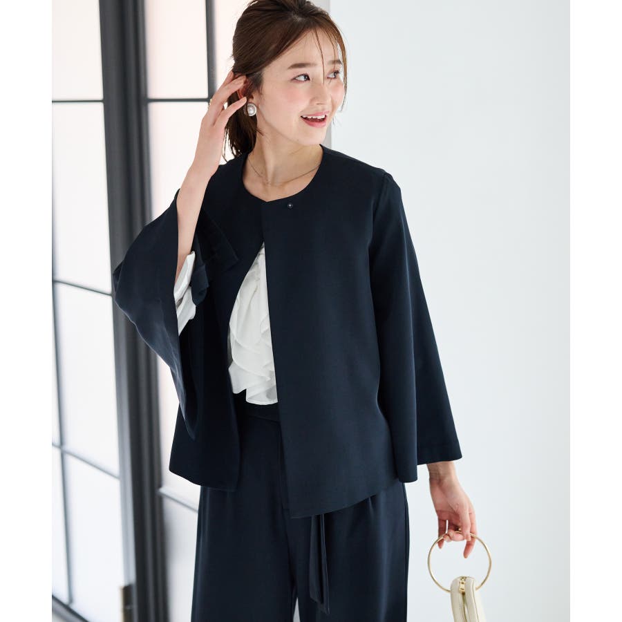 トレンド感のあるケープ風シルエットで女性らしいおしゃれ見えスーツ