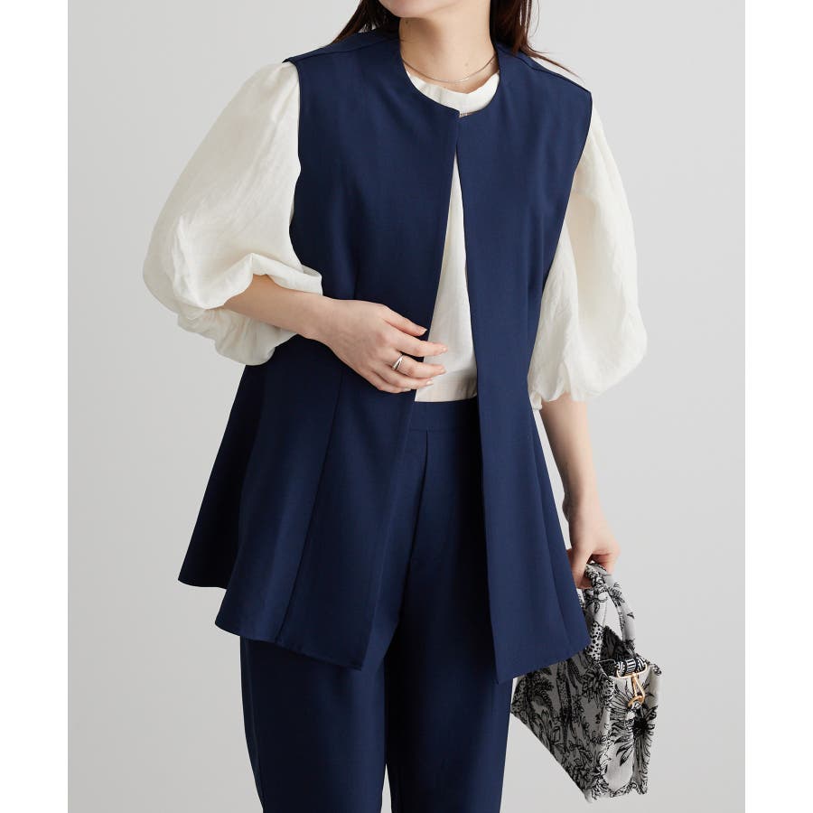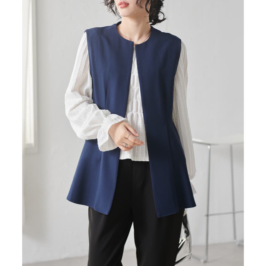 きれいめコーデにぴったりのペプラムデザインのシンプルジレベストフロントのホックを閉めると深めのVネックやキーネックのように見せられるのもポイント!