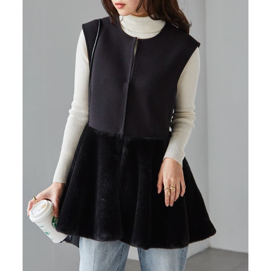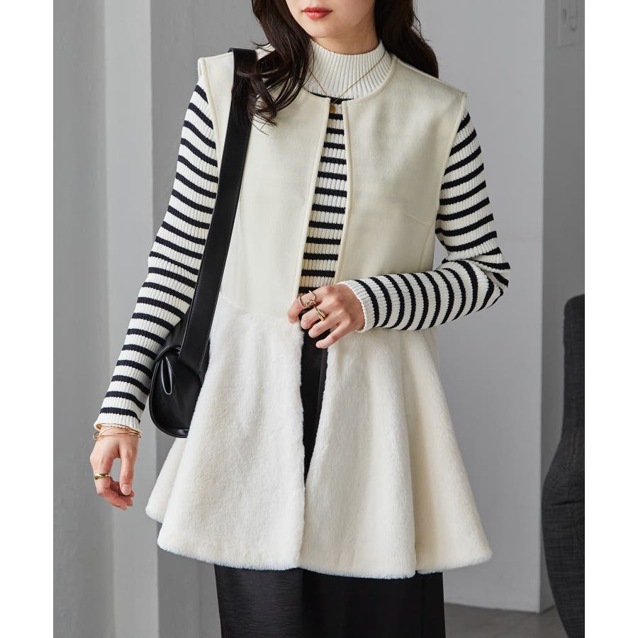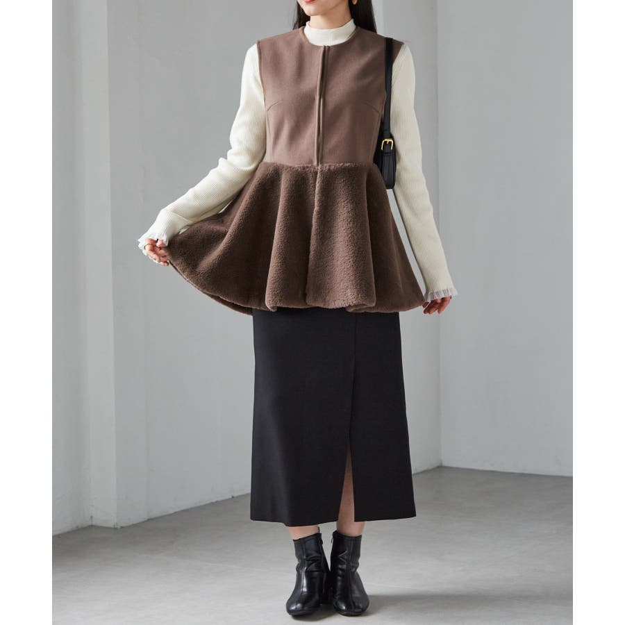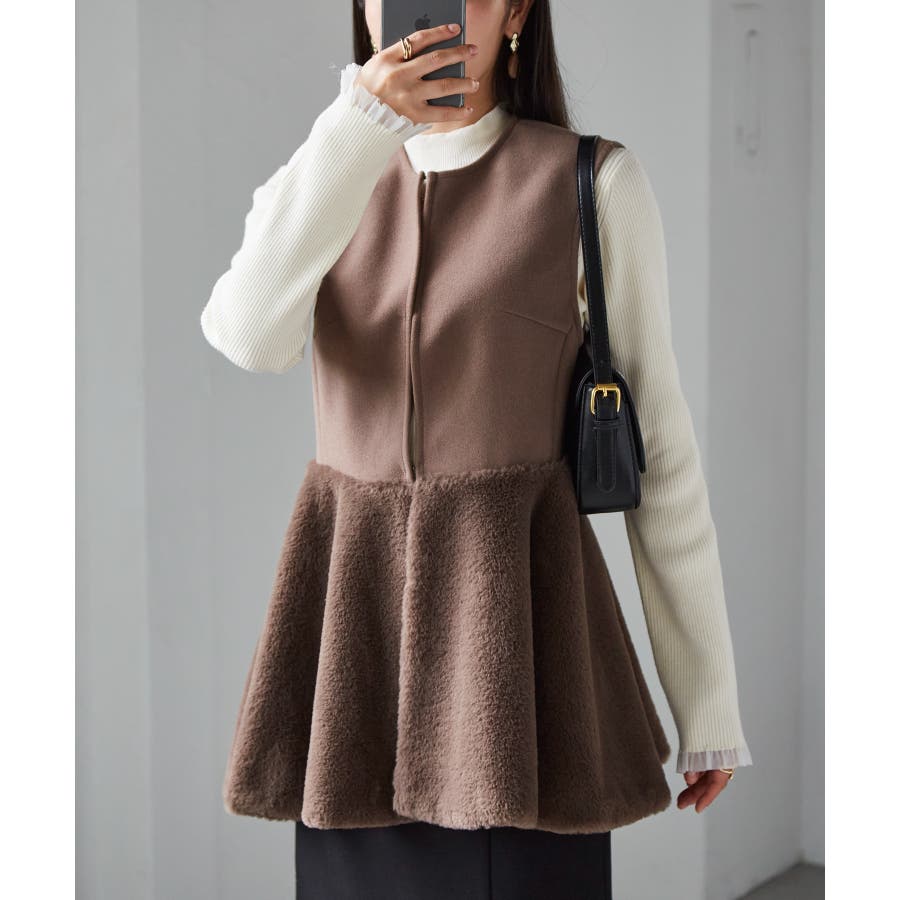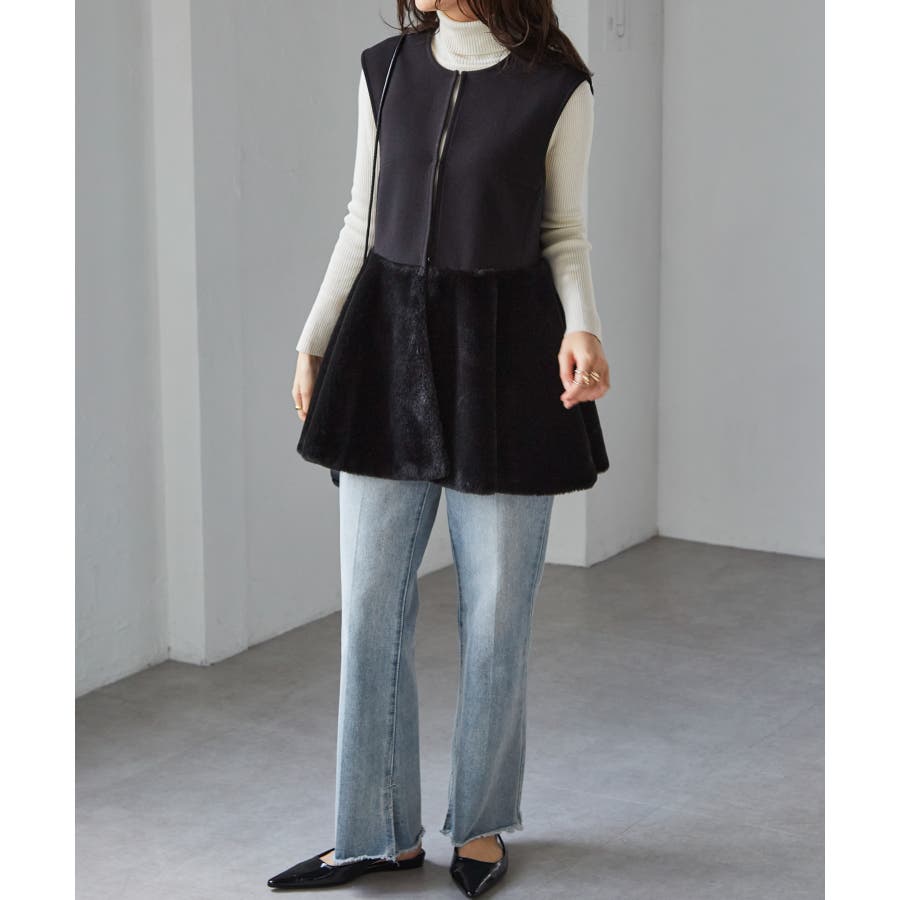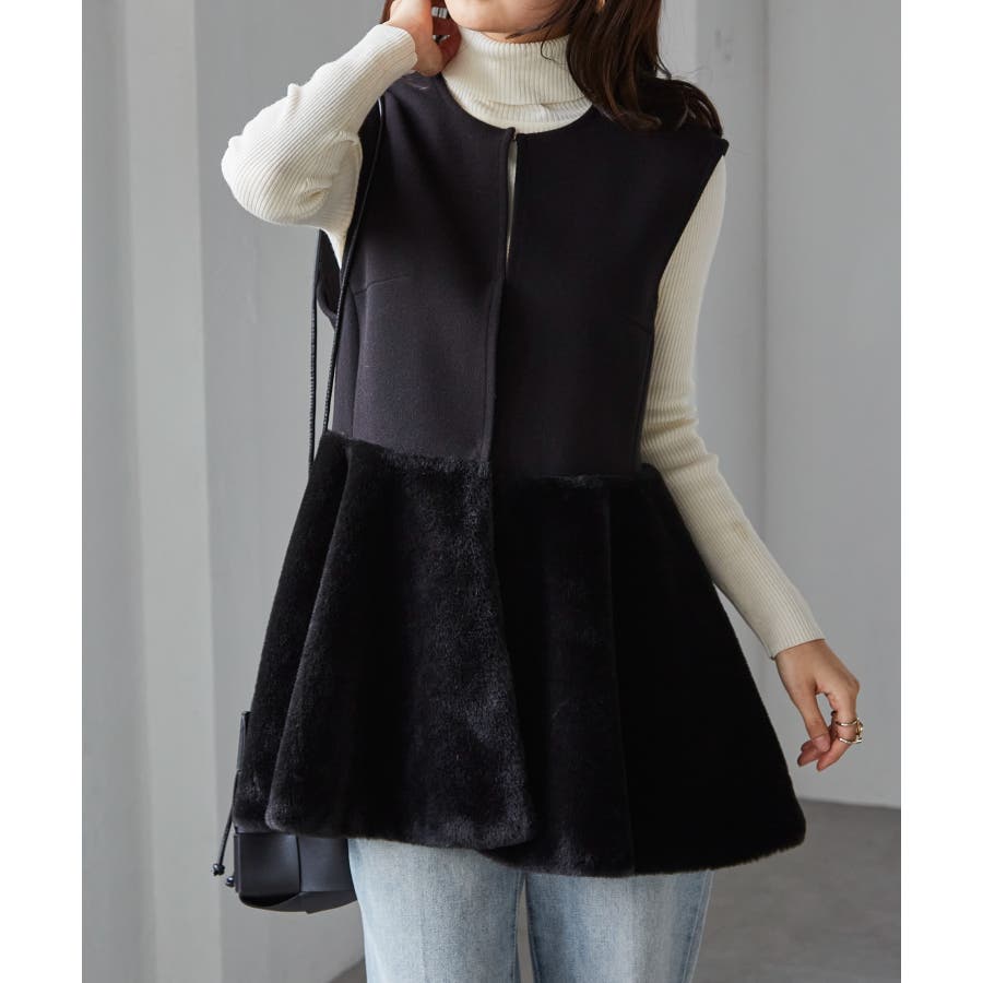 秋冬コーデにニュアンスを生む女らしいペプラムファー切替ジレでトレンドコーデに♪