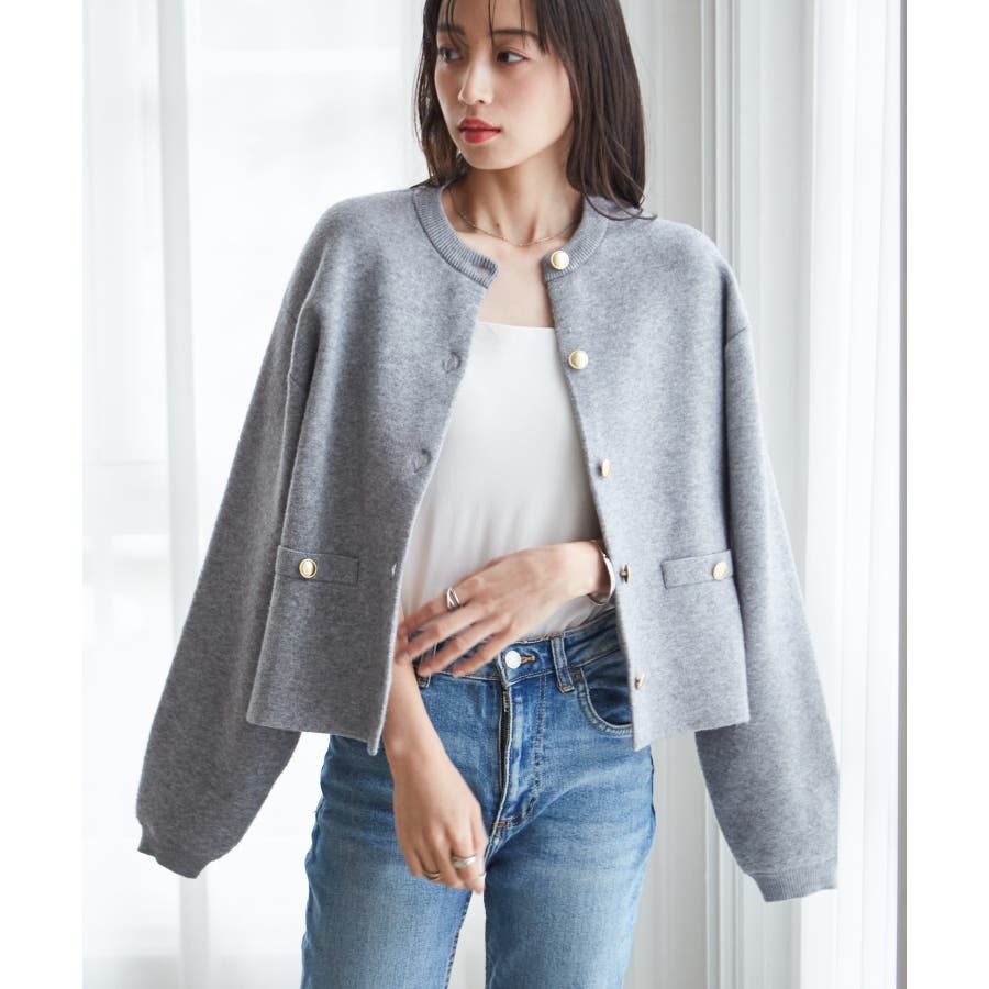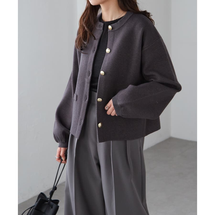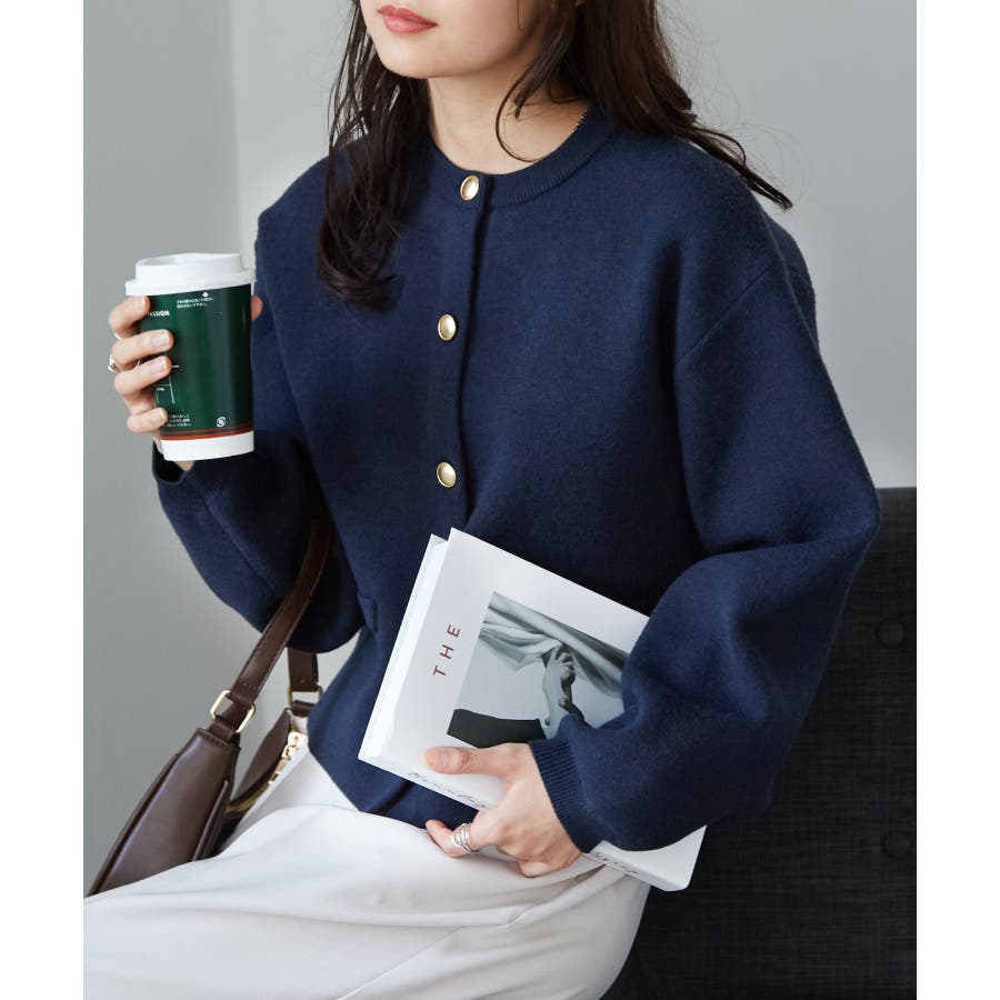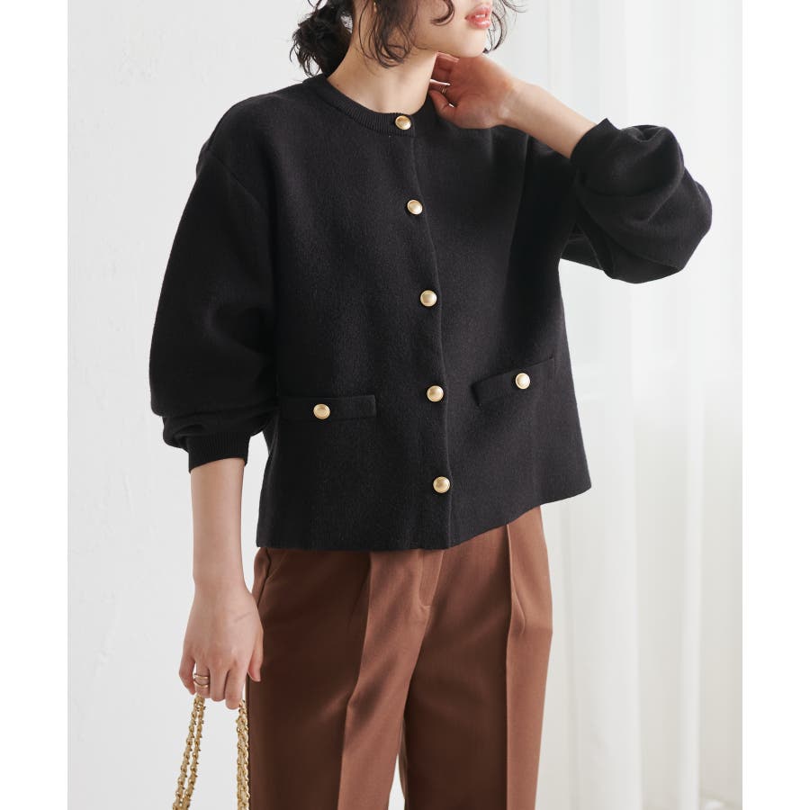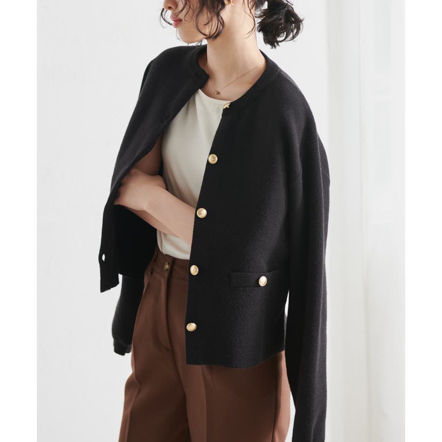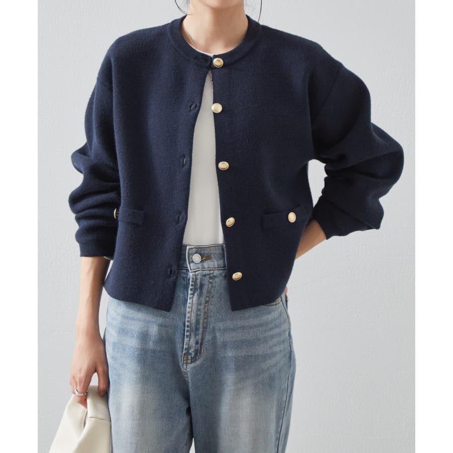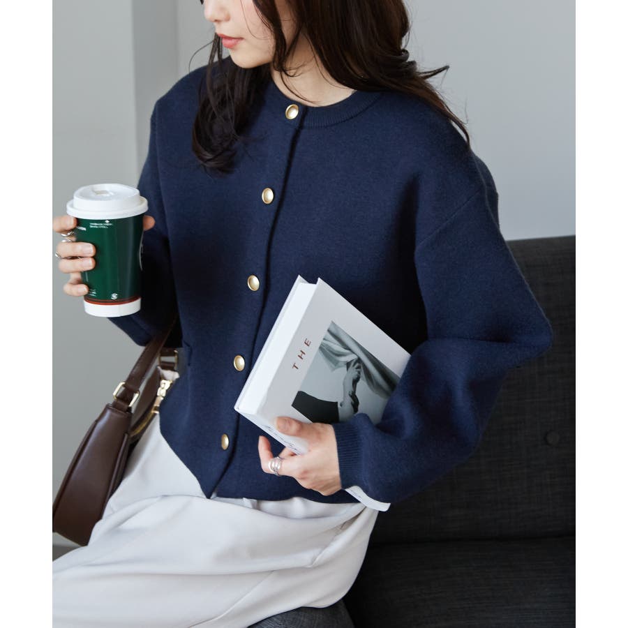 ゴールド調ボタンがアクセントになり、ジャケットのようにも着用できる優秀カーディガン。