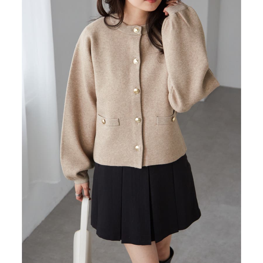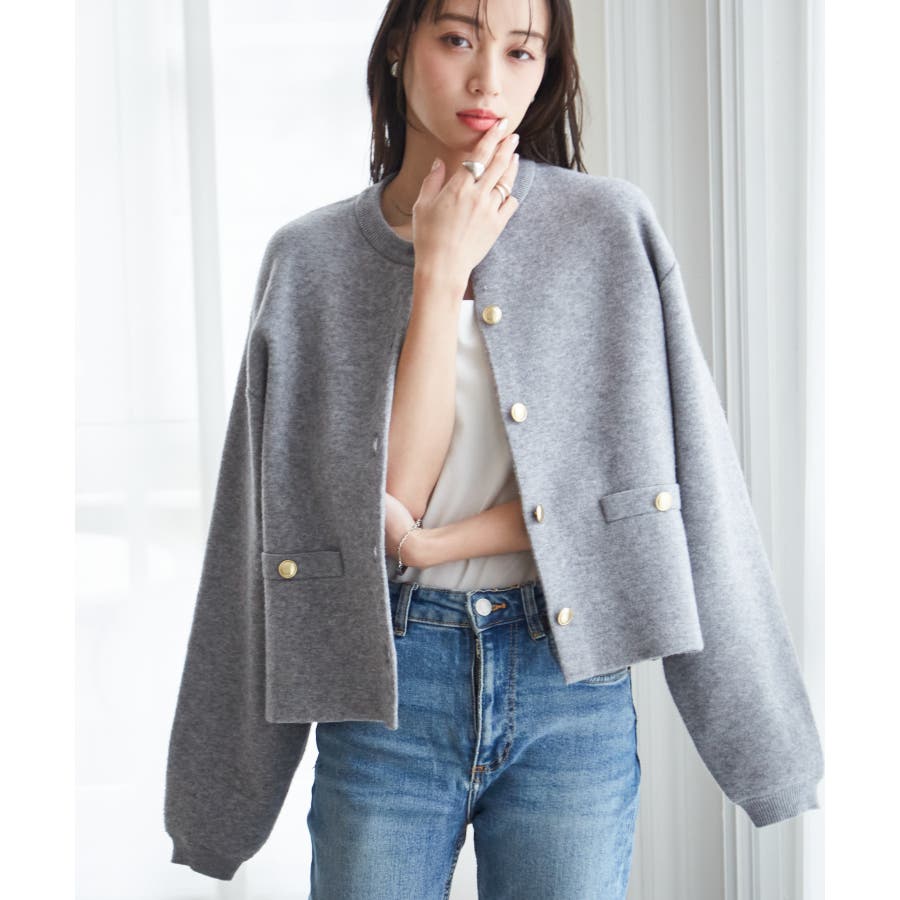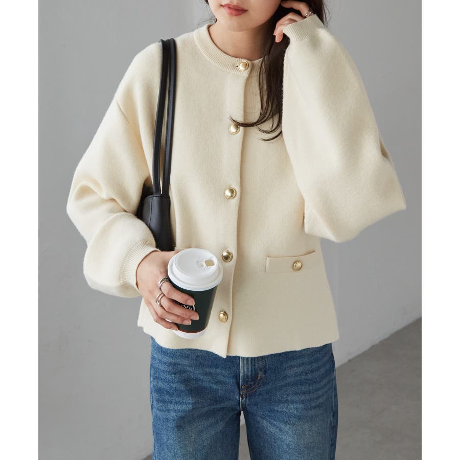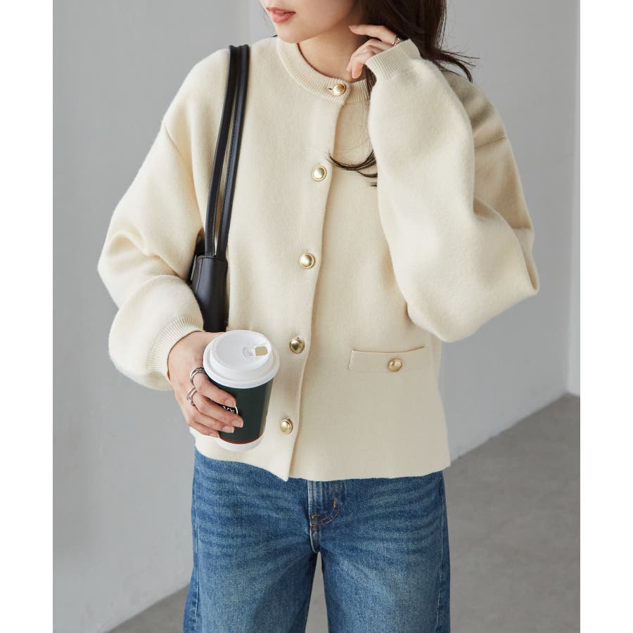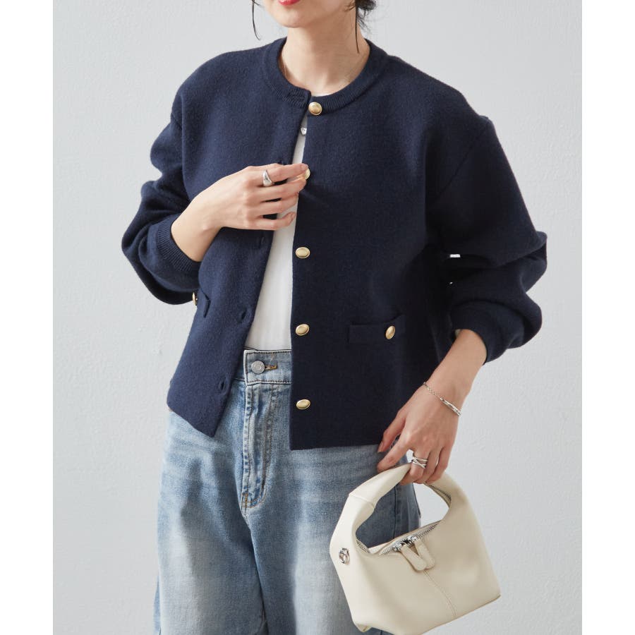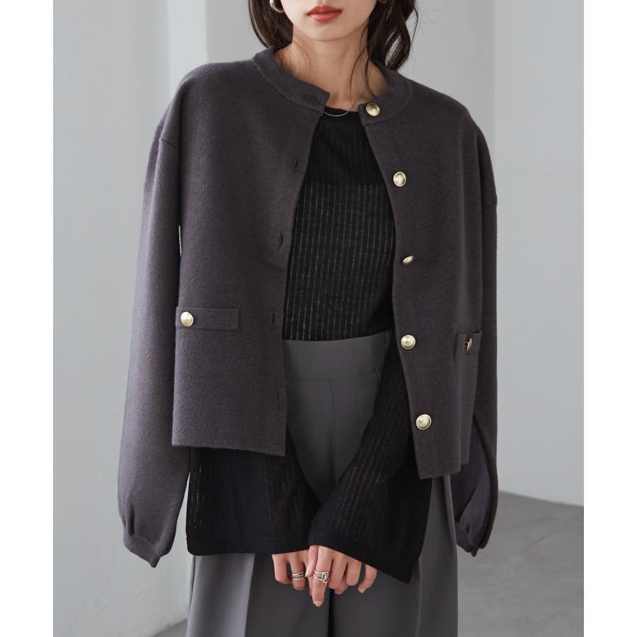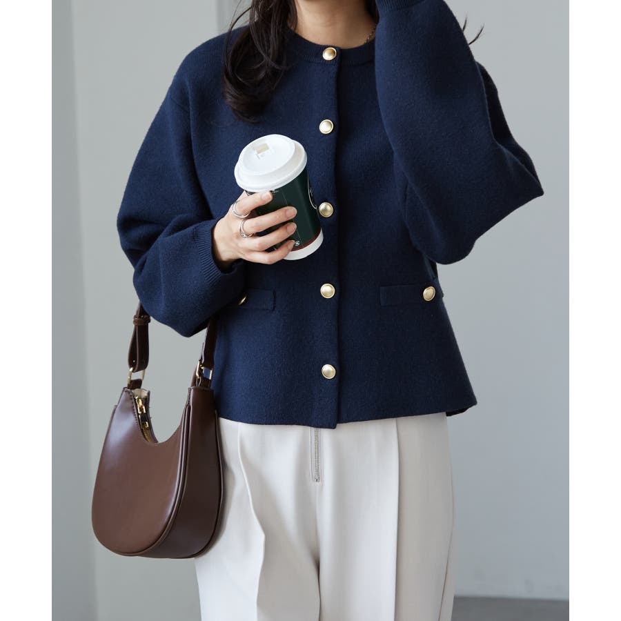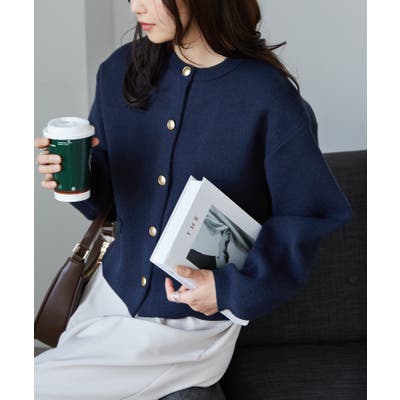 ゴールド調ボタンがアクセントになり、ジャケットのようにも着用できる優秀カーディガン。