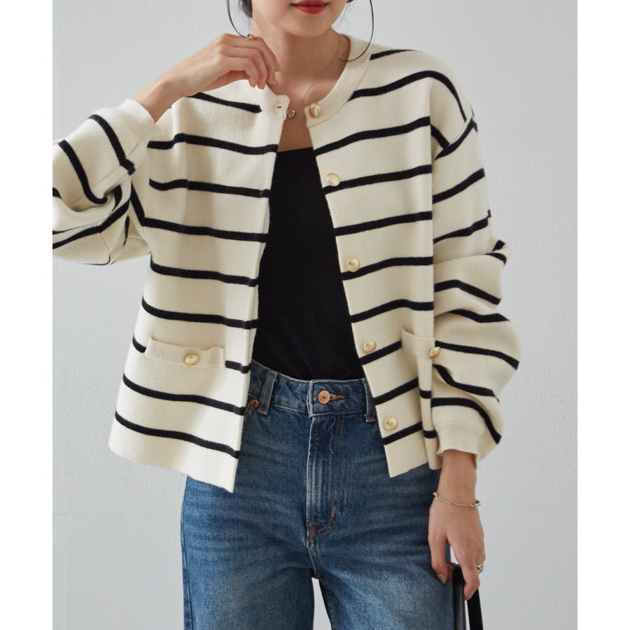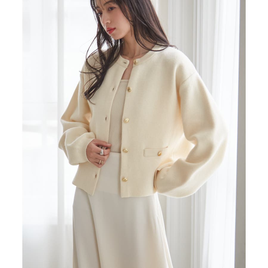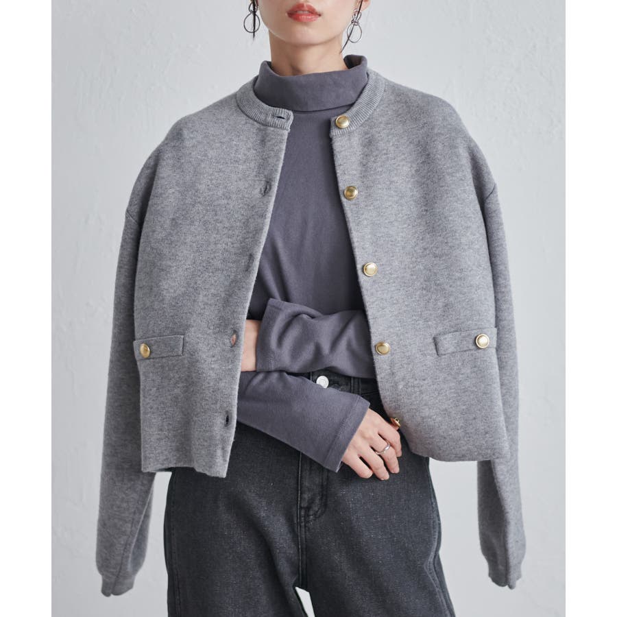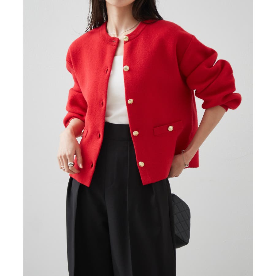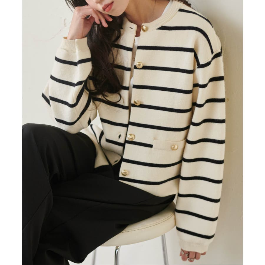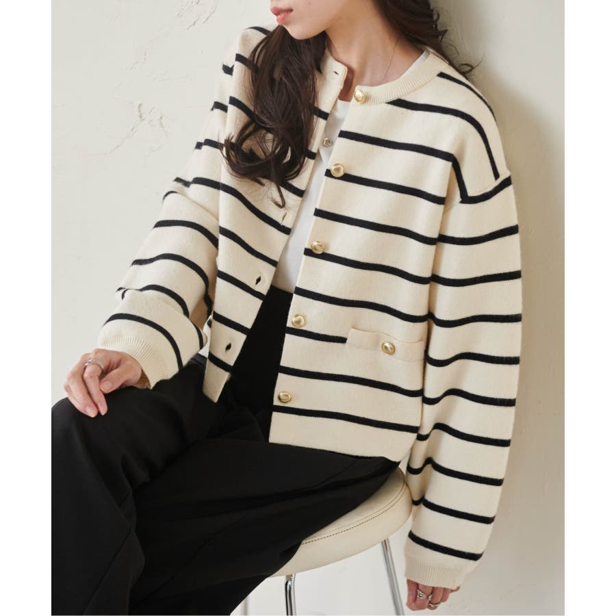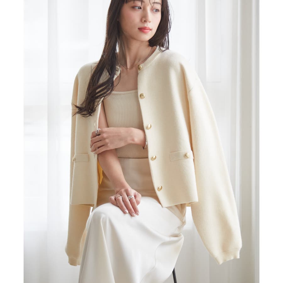 ゴールド調ボタンがアクセントになり、ジャケットのようにも着用できる優秀カーディガン。