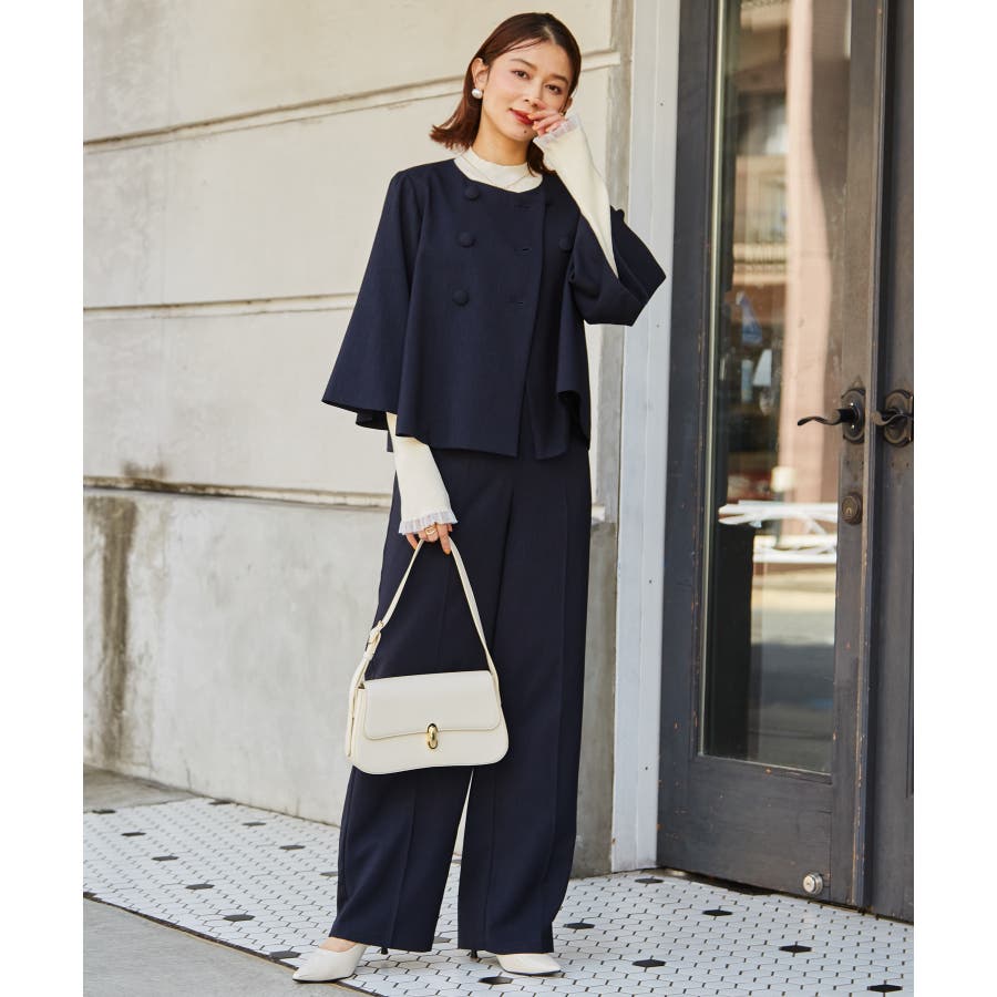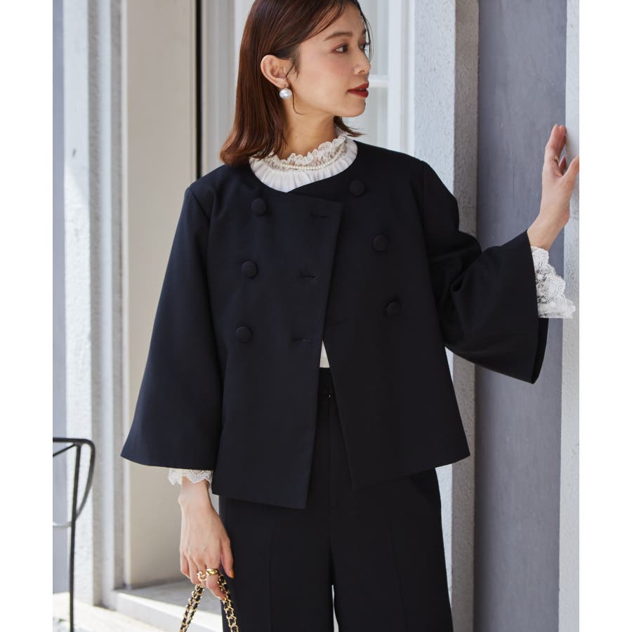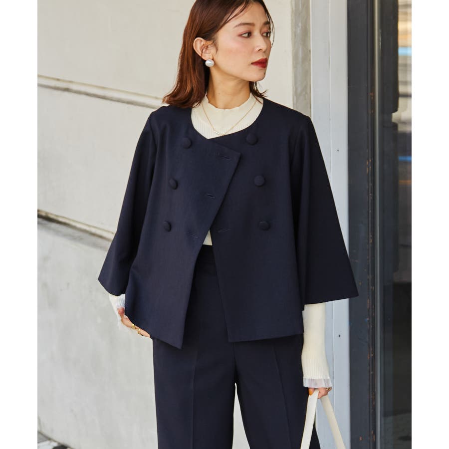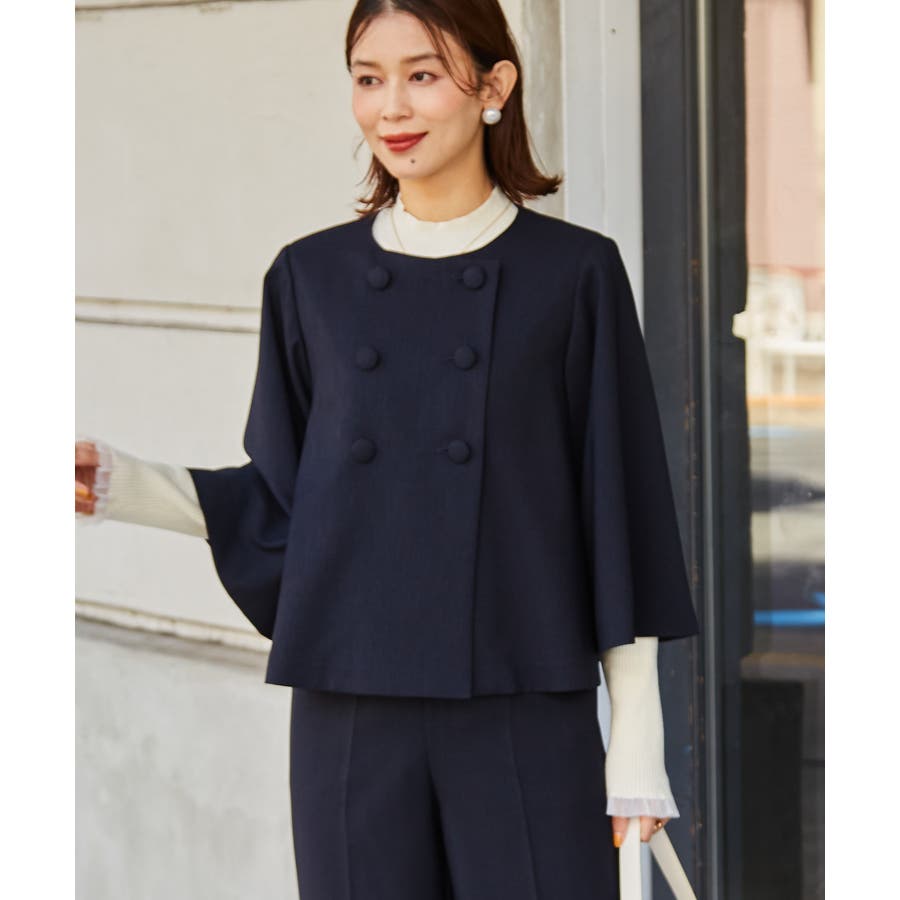・ノーカラーなのでボウタイブラウスやハイネックインにも合わせやすい。