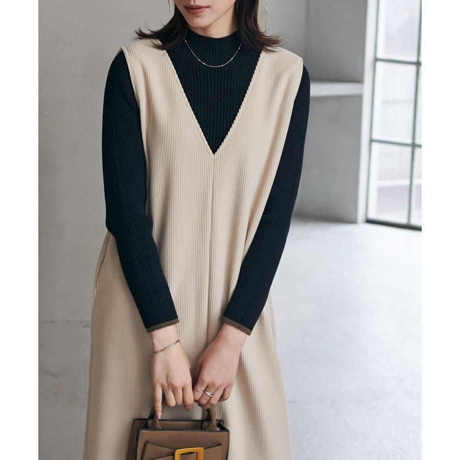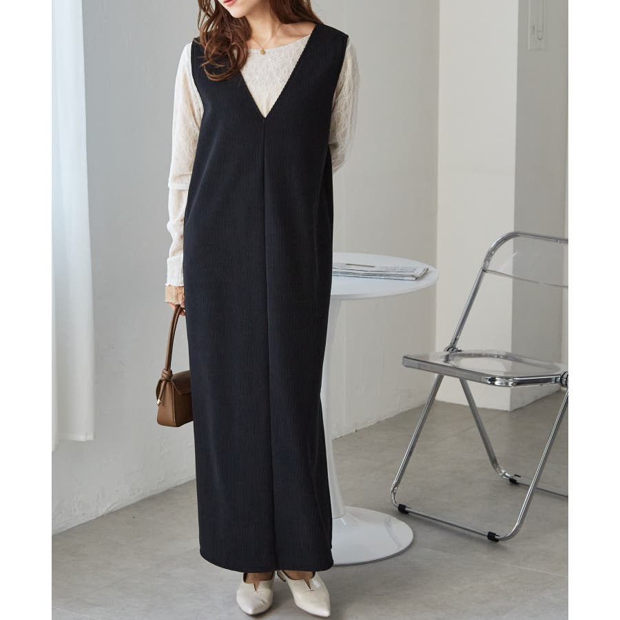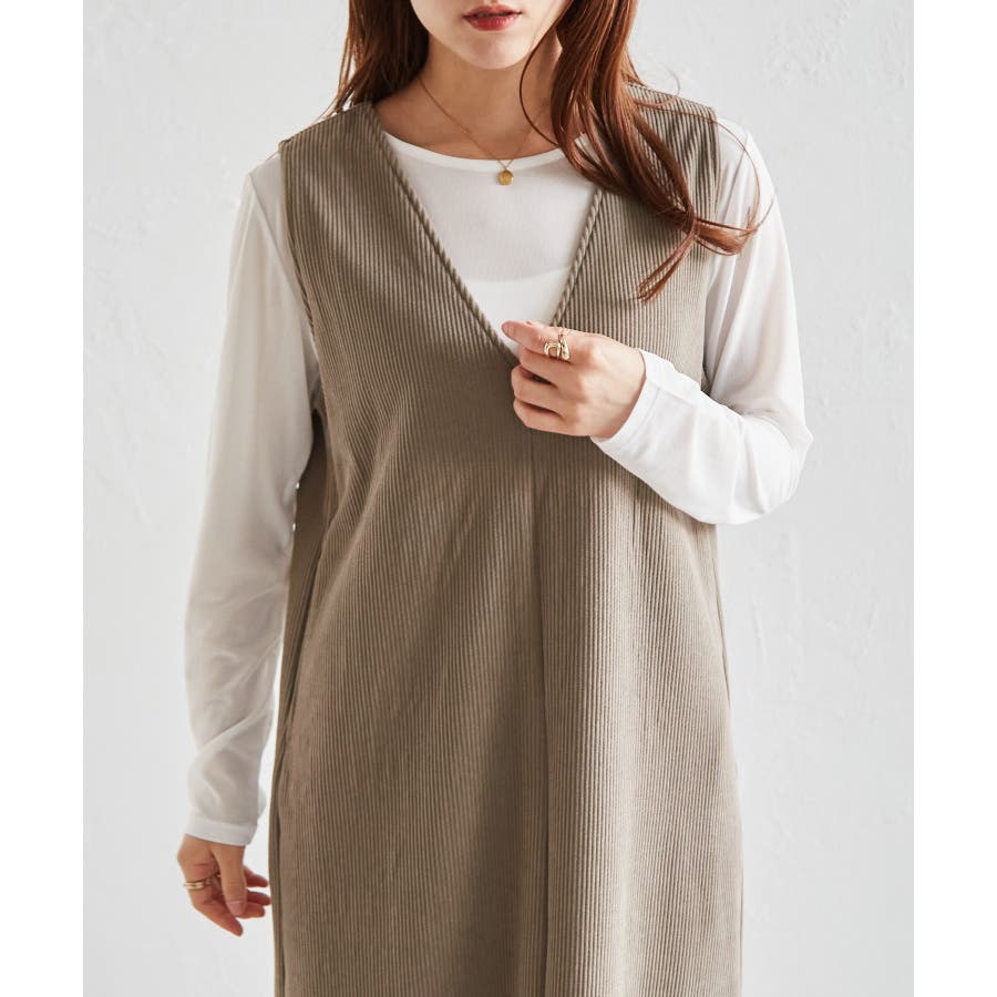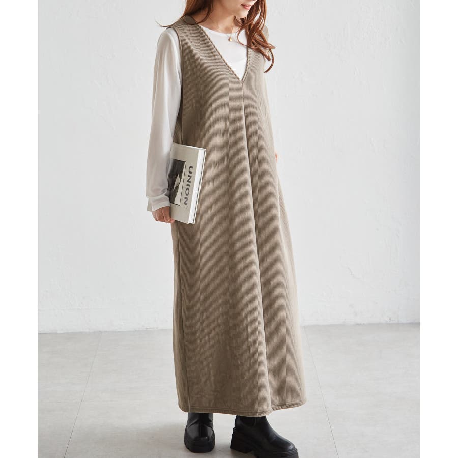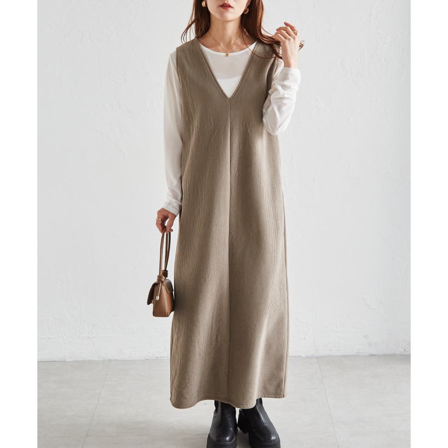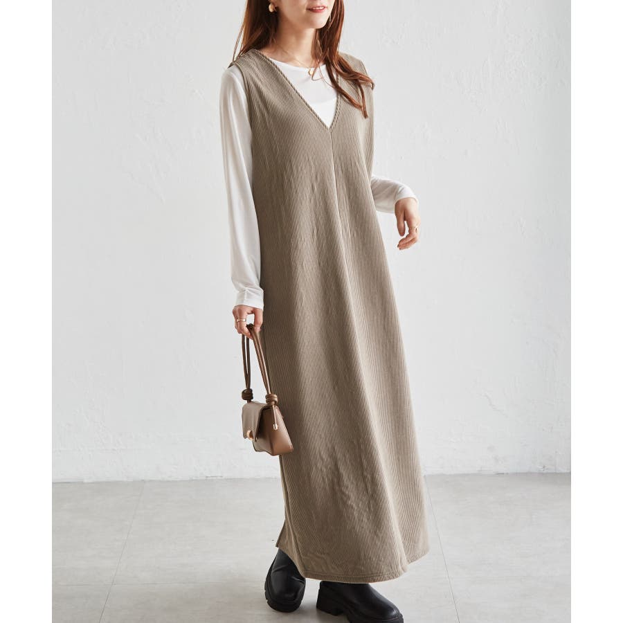 ・ニットコールの太ウネが可愛い縦ラインでスッキリ見える深Vネックのジャンパースカート。