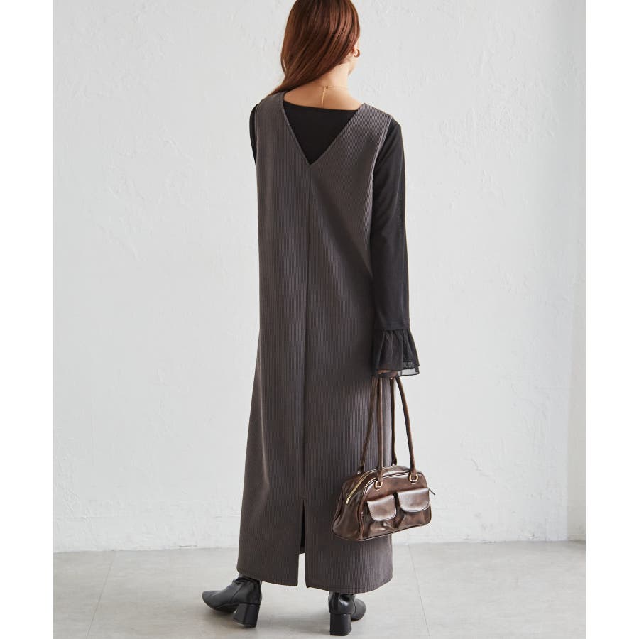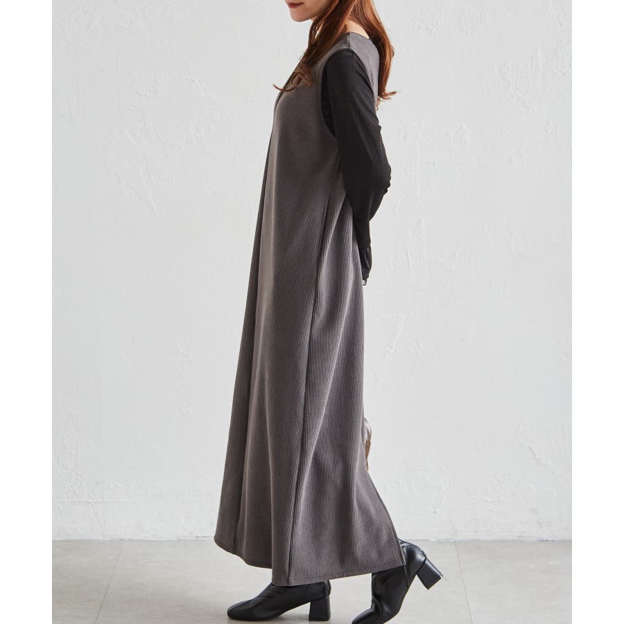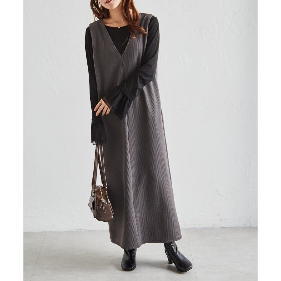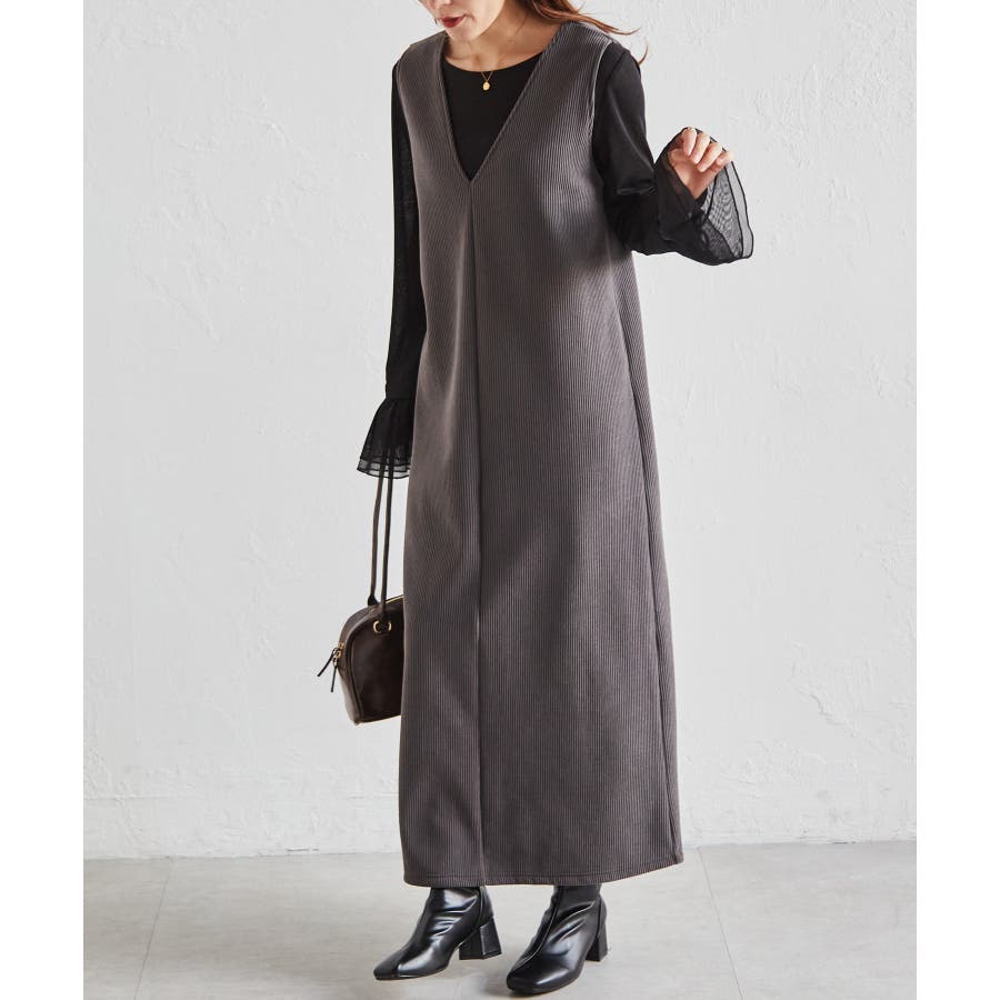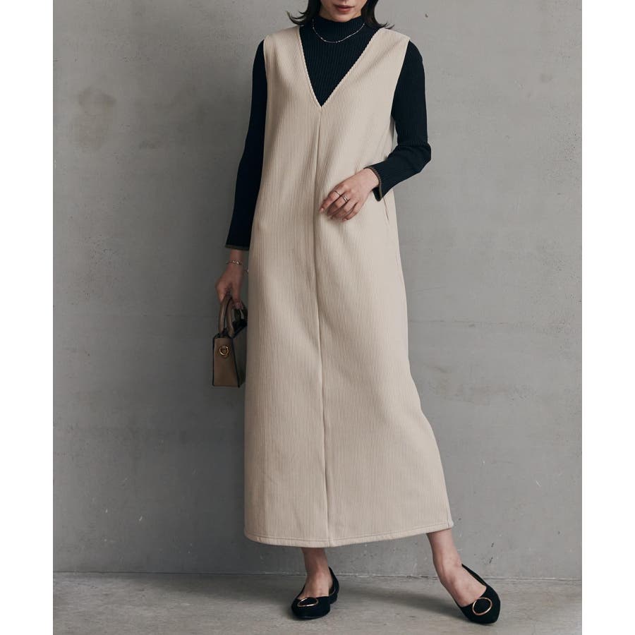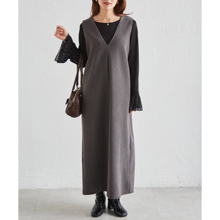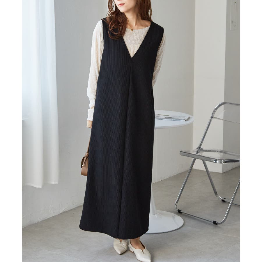 ・ニットコールの太ウネが可愛い縦ラインでスッキリ見える深Vネックのジャンパースカート。