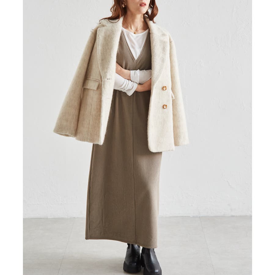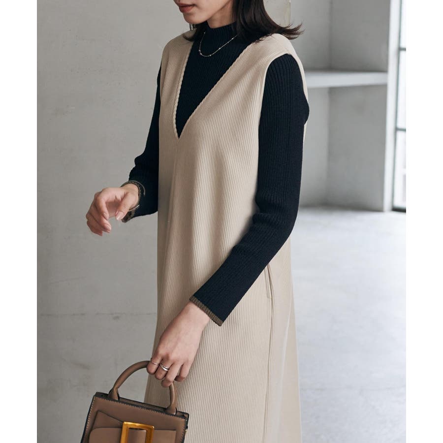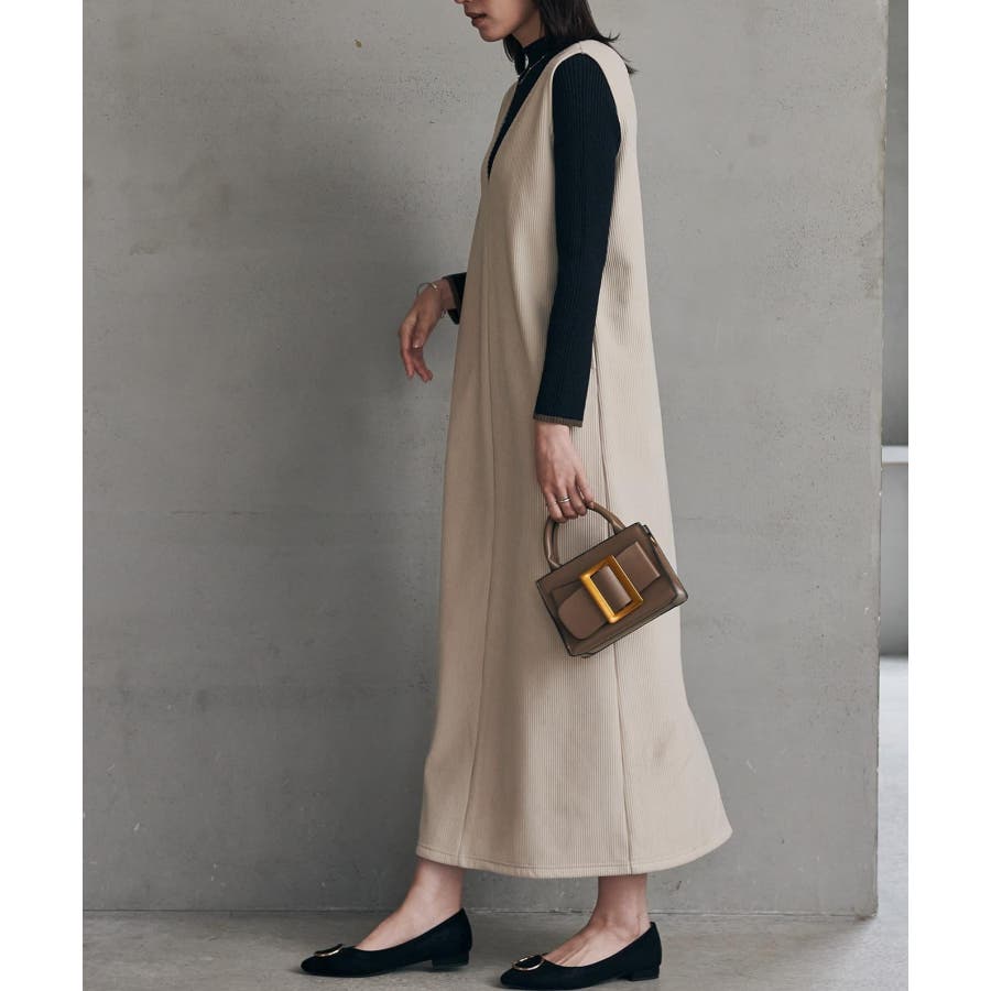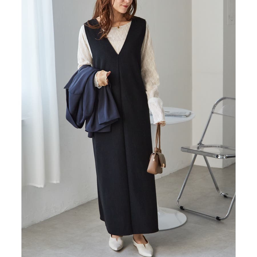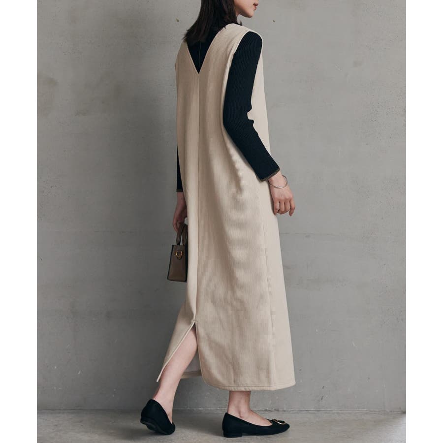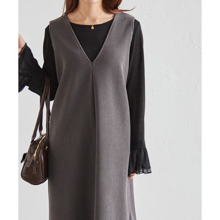・ニットコールの太ウネが可愛い縦ラインでスッキリ見える深Vネックのジャンパースカート。