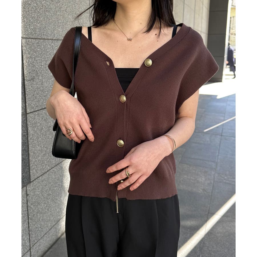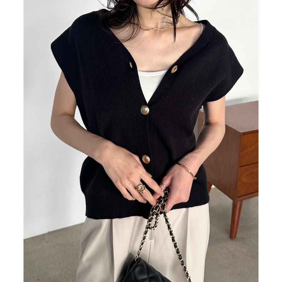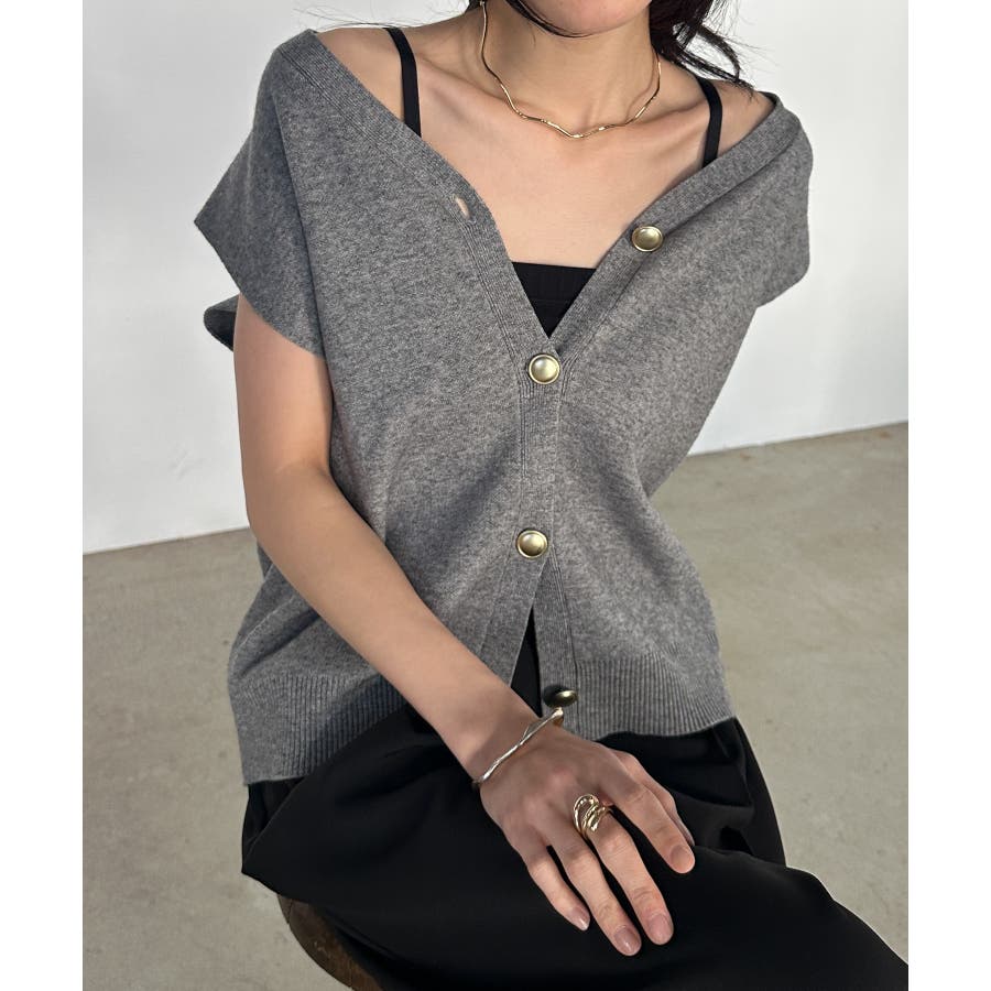 程よい開きのVネックでヘルシーな大人スタイルに。ゴールド調の大きなボタンがコーデのアクセント。プルオーバーのようにも着用できる着回し力の高さもポイント。短め丈でコンパクトに見せつつ、ゆったりシルエットで着心地も◎ボクシーシルエットで体型カバーが叶います。ムースのようななめらかタッチで、肌心地の良い素材を使用。