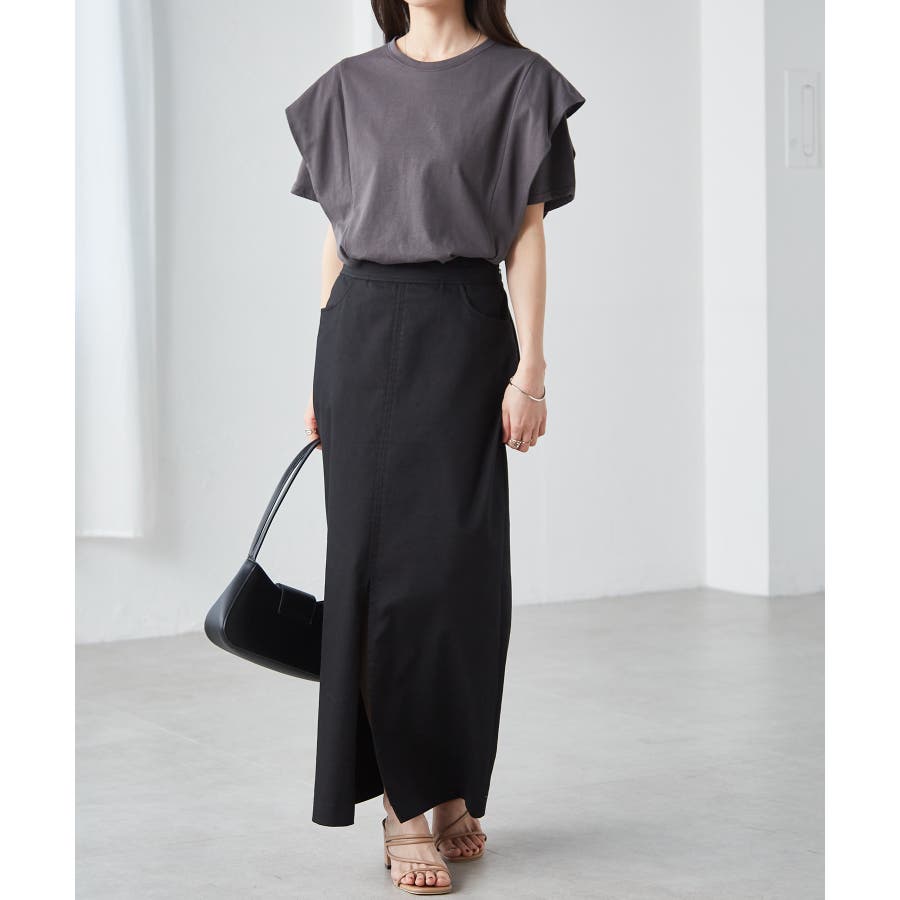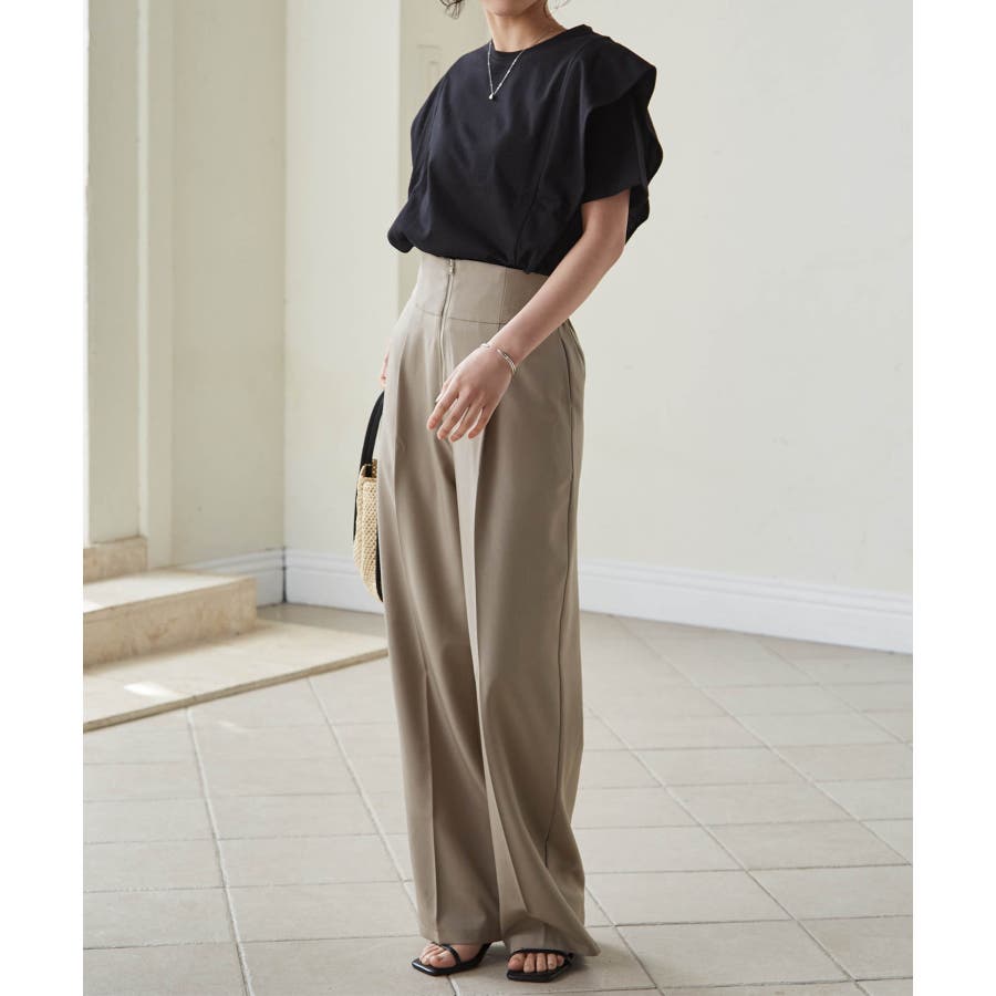 フレアデザインのラッフルショルダーが、肩周りのシルエットを華奢見えするトップス。
