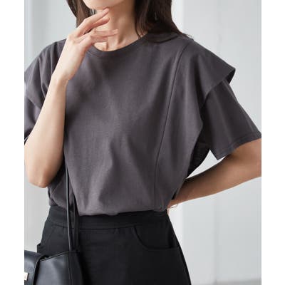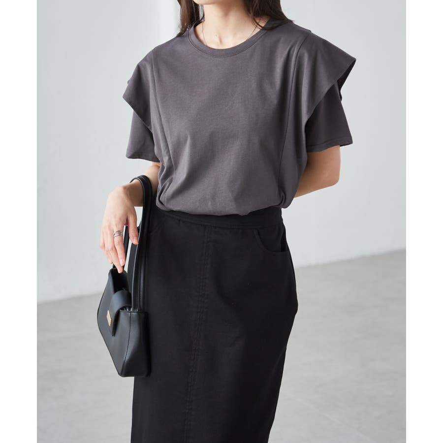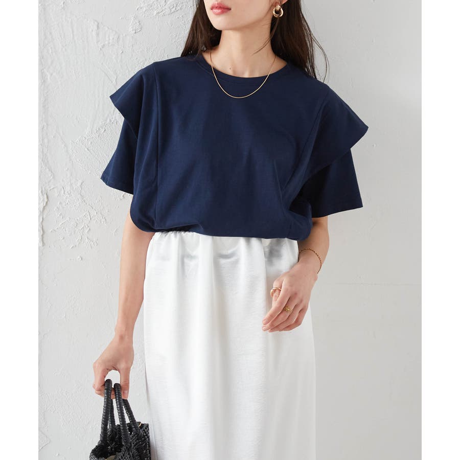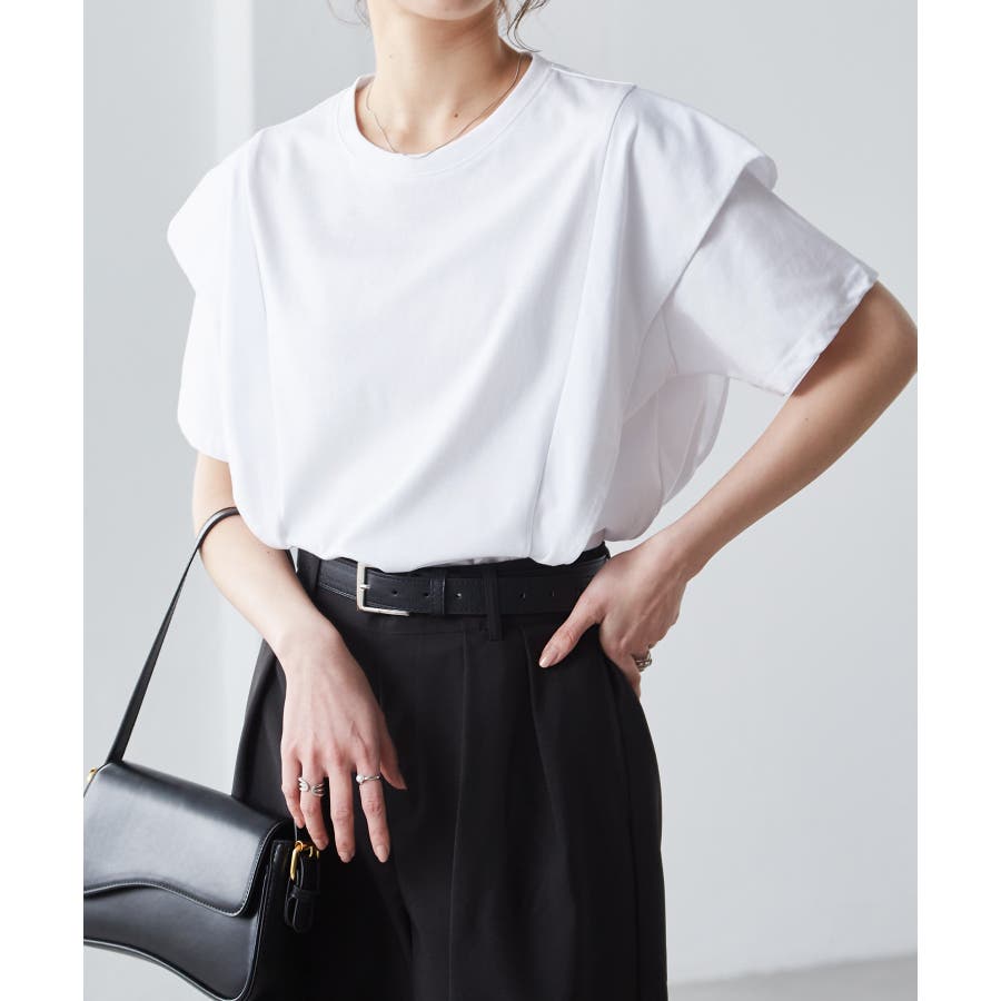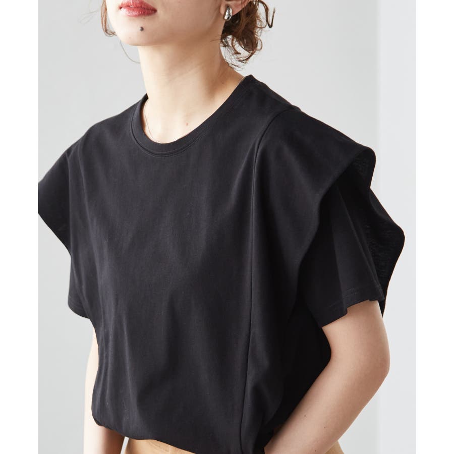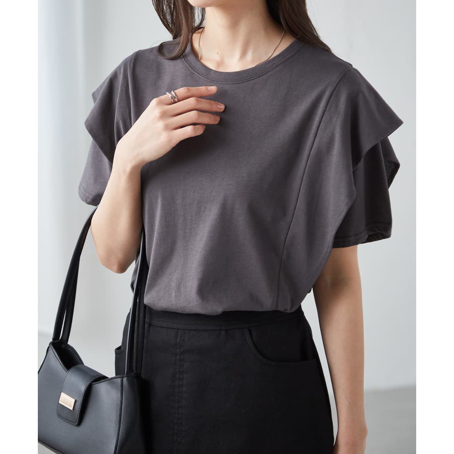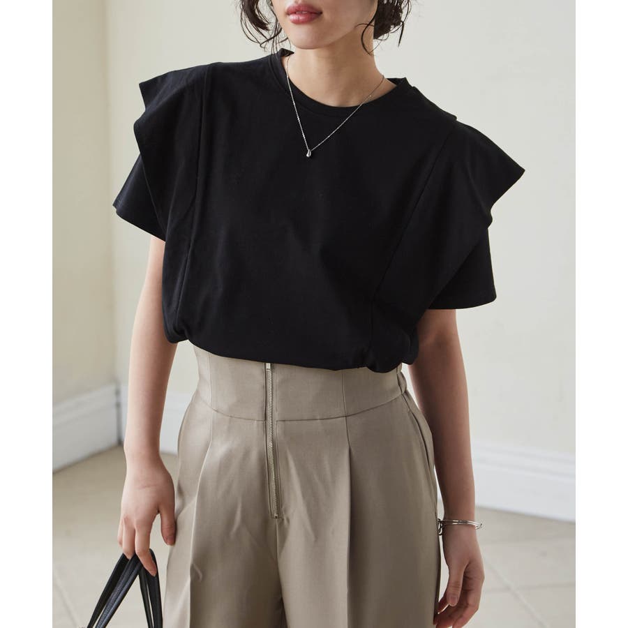 ・トレンドのラッフルショルダーがワンポイントのTシャツ。