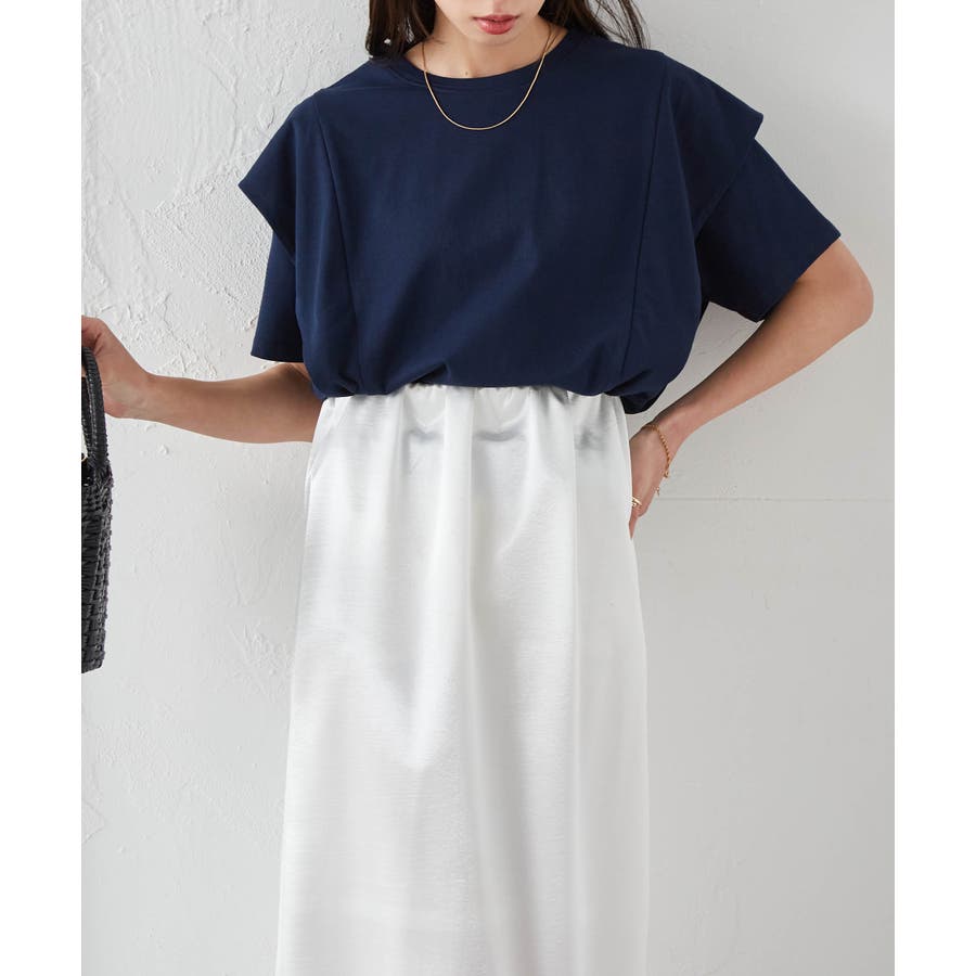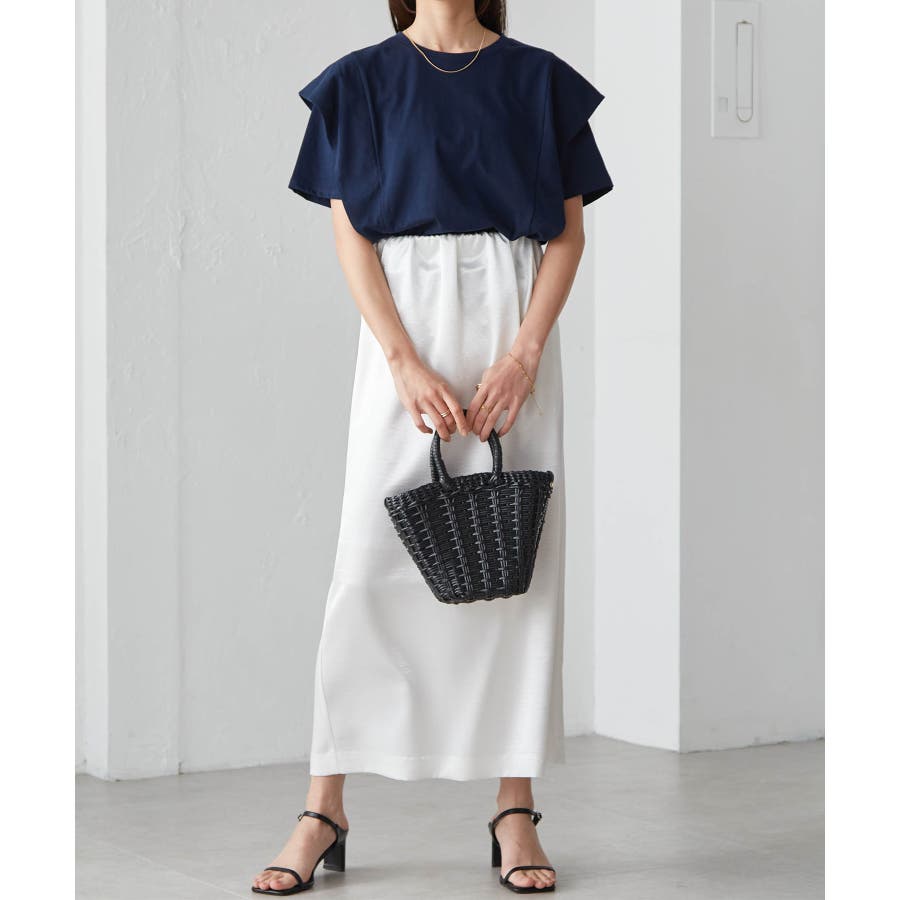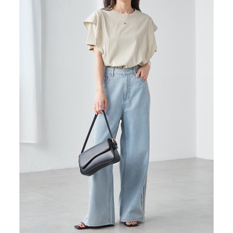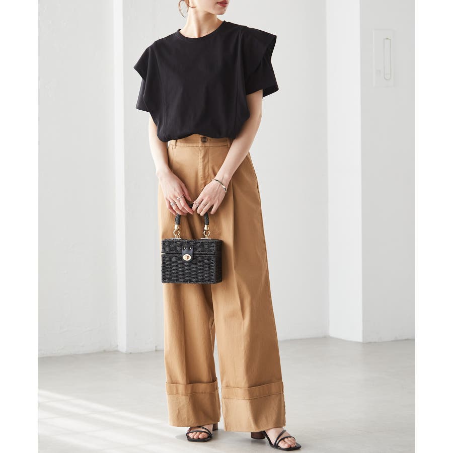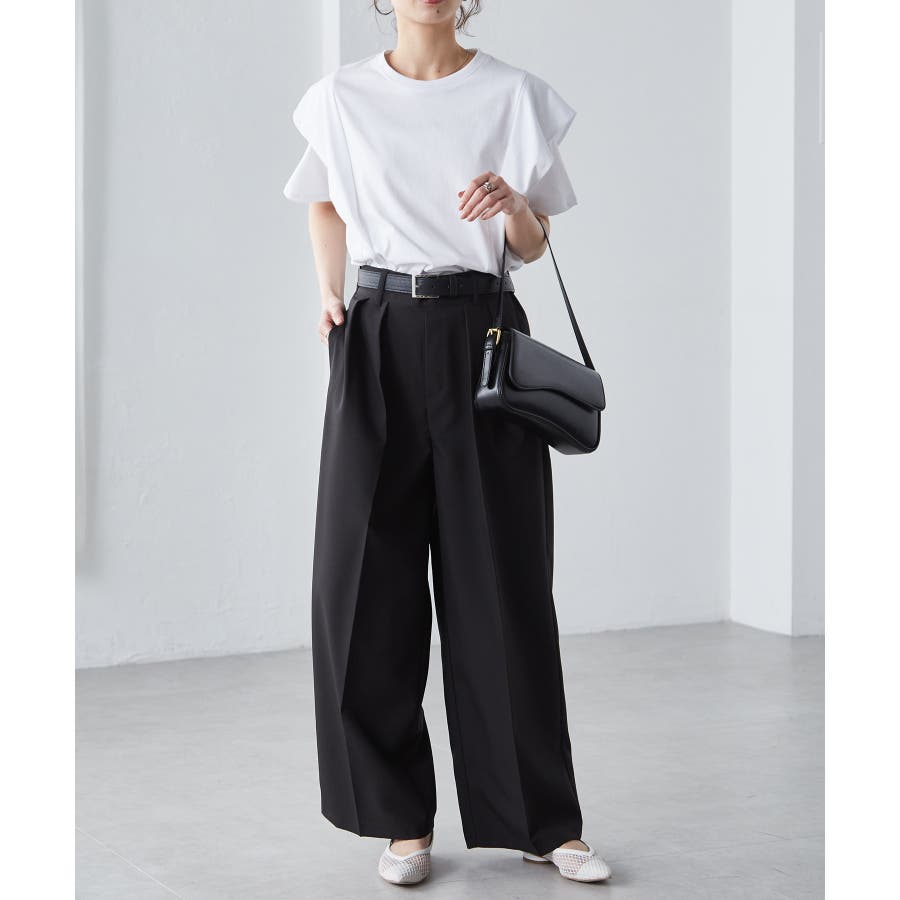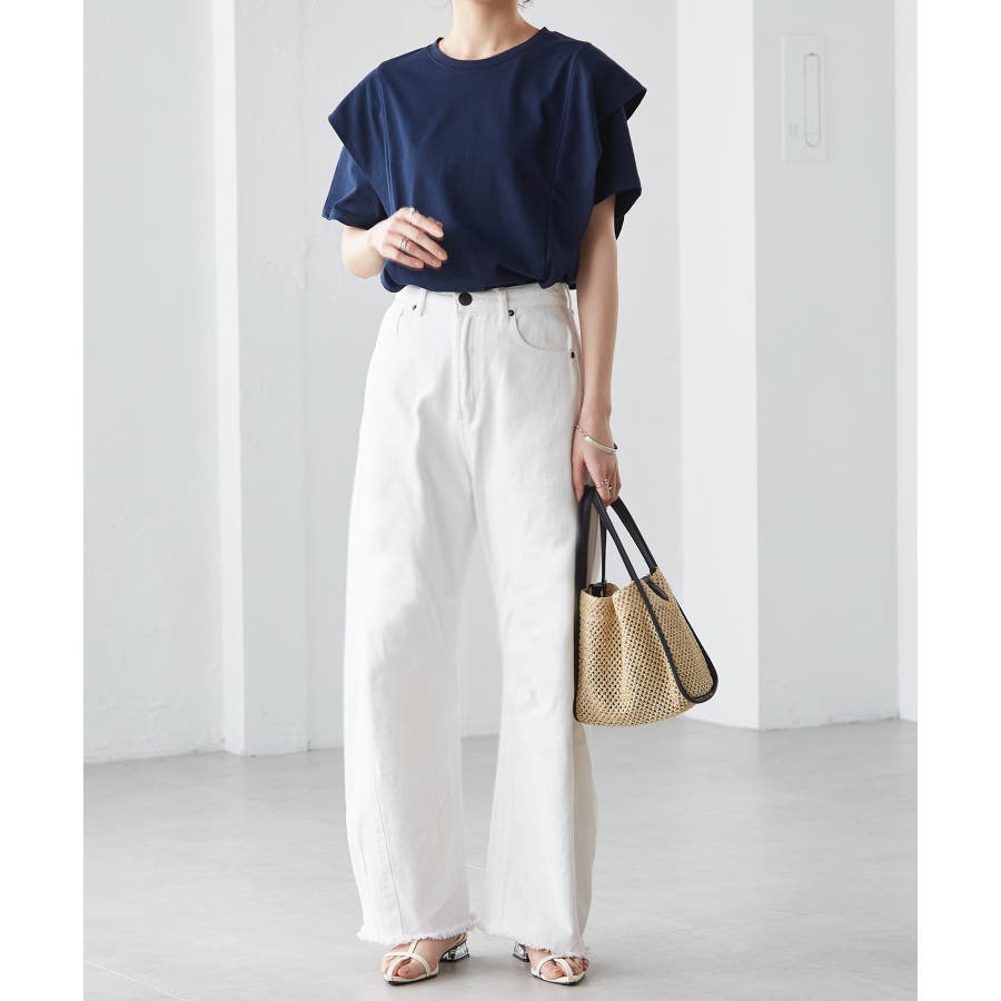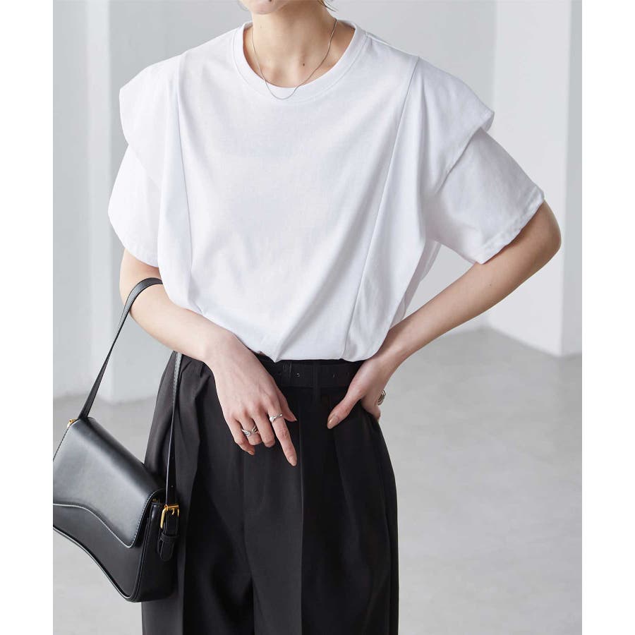 ・トレンドのラッフルショルダーがワンポイントのTシャツ。
