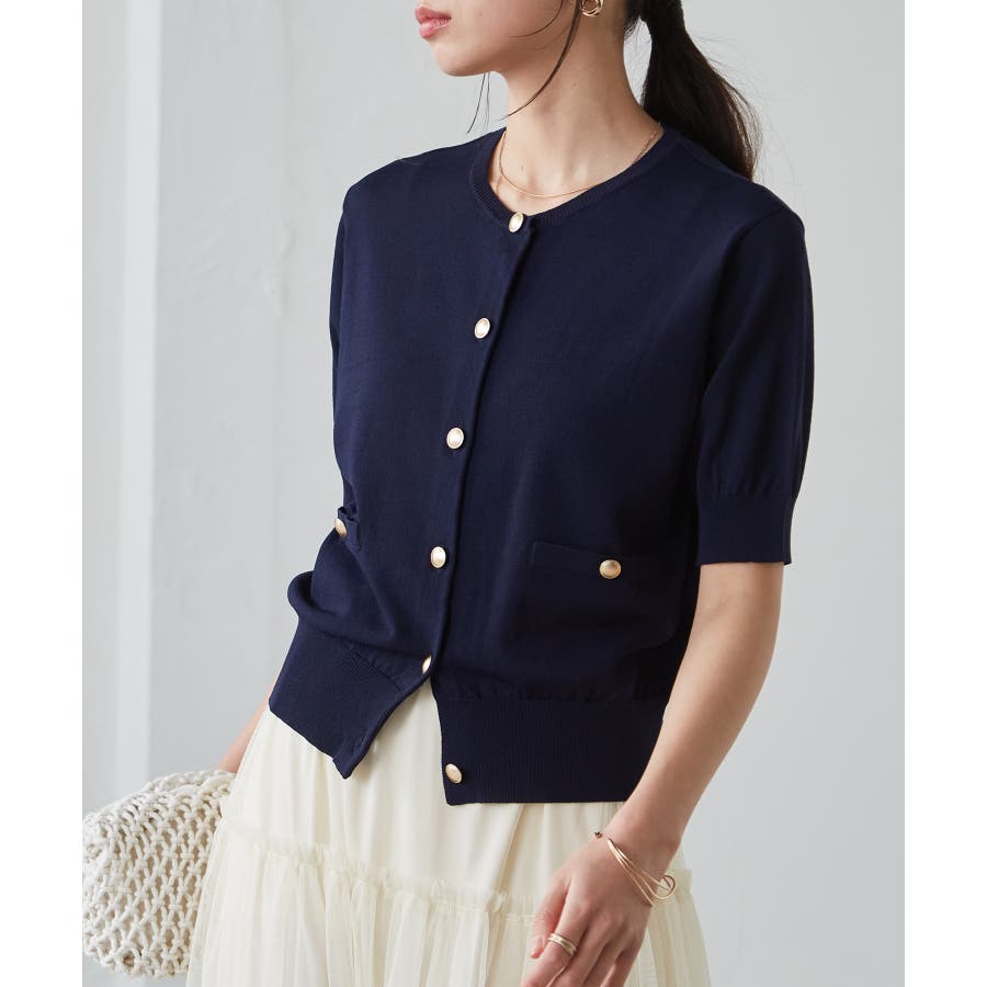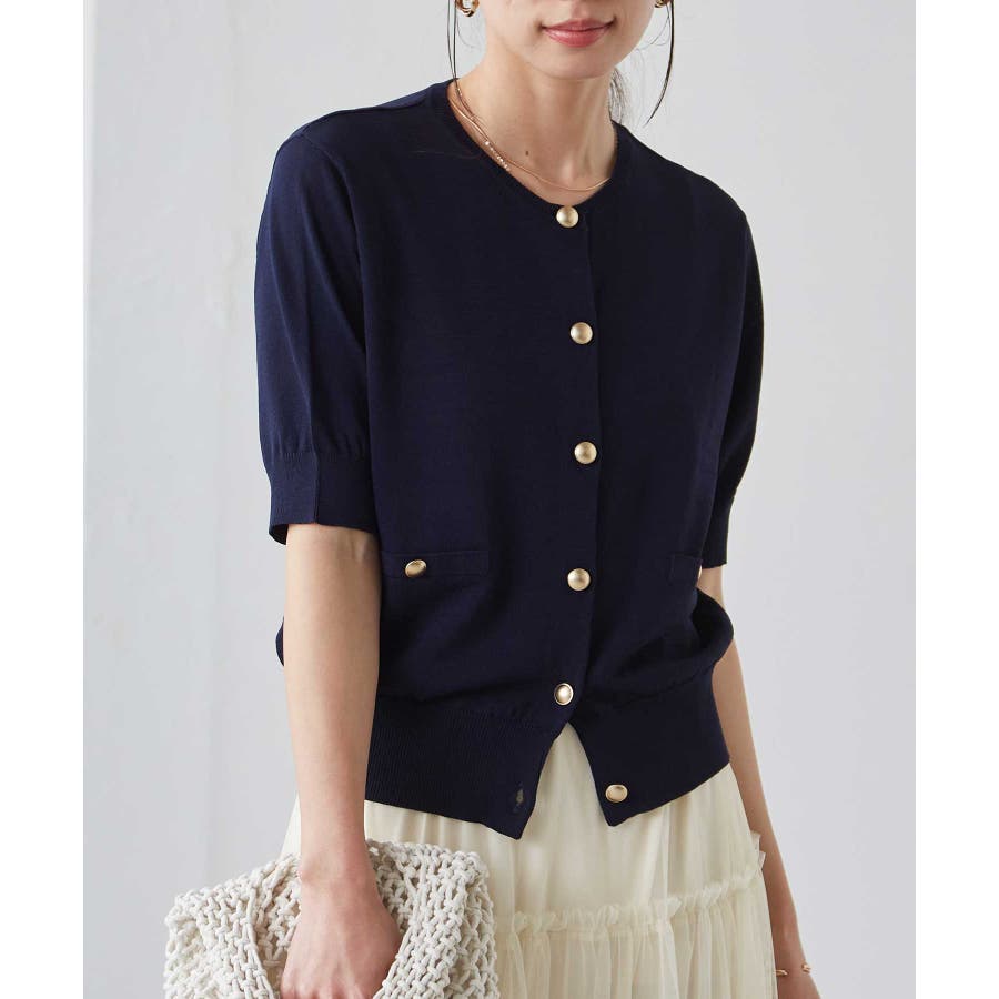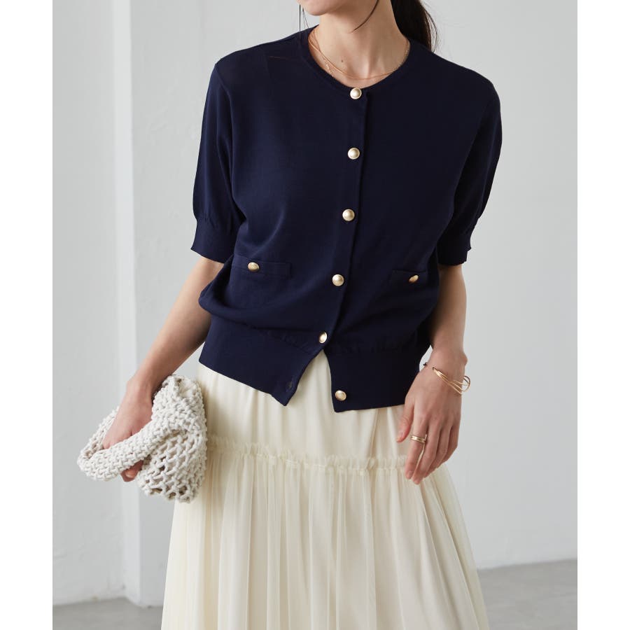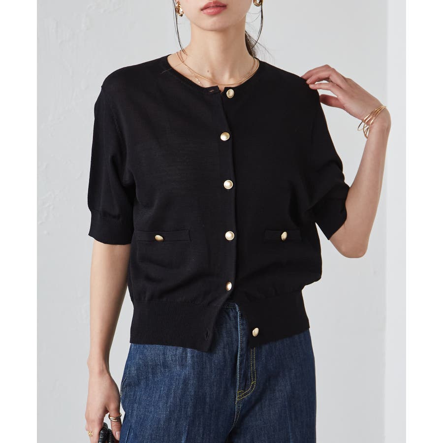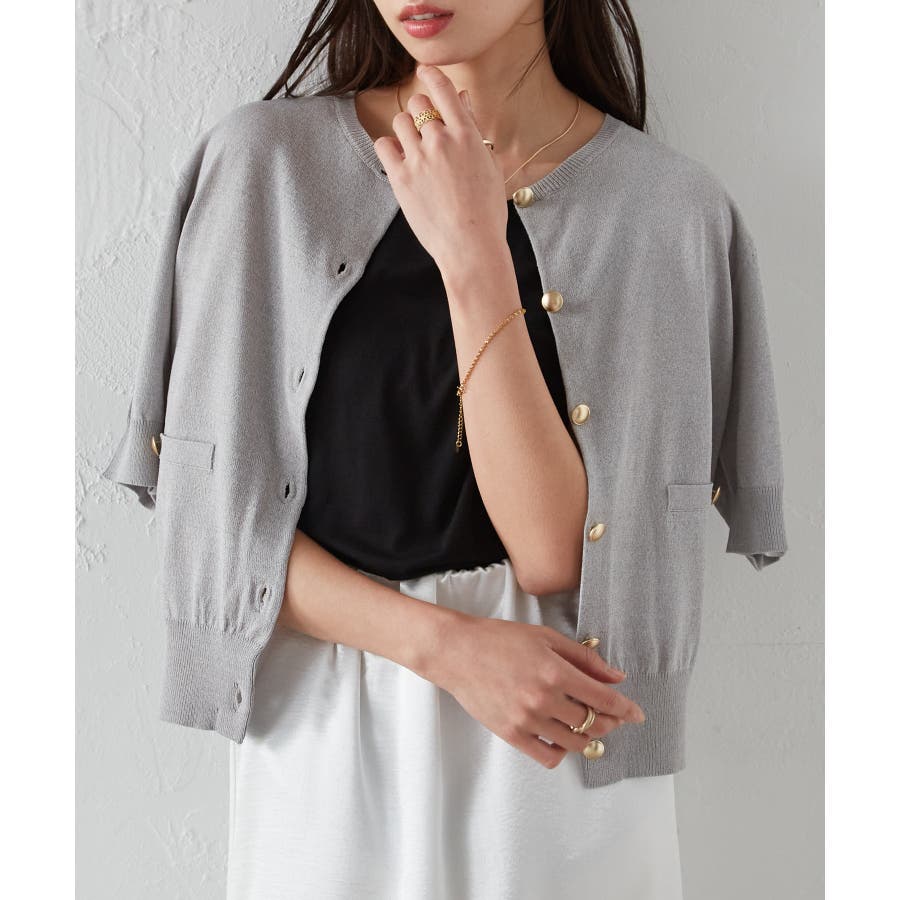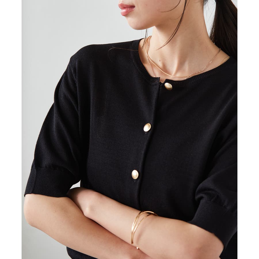 【洗える・ひんやり】ゴールド調ボタン5分袖ニットカーデ