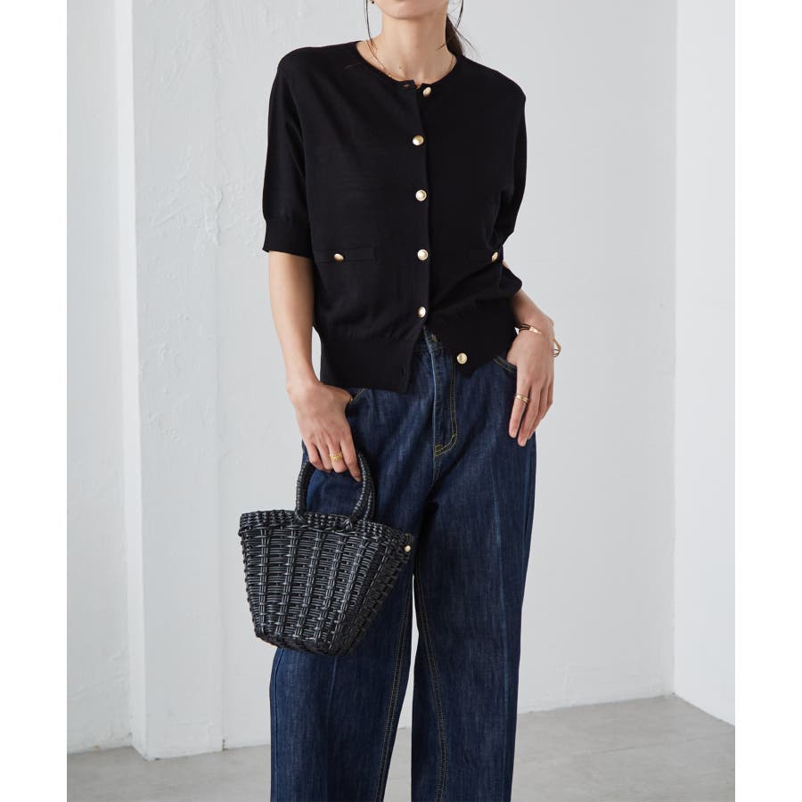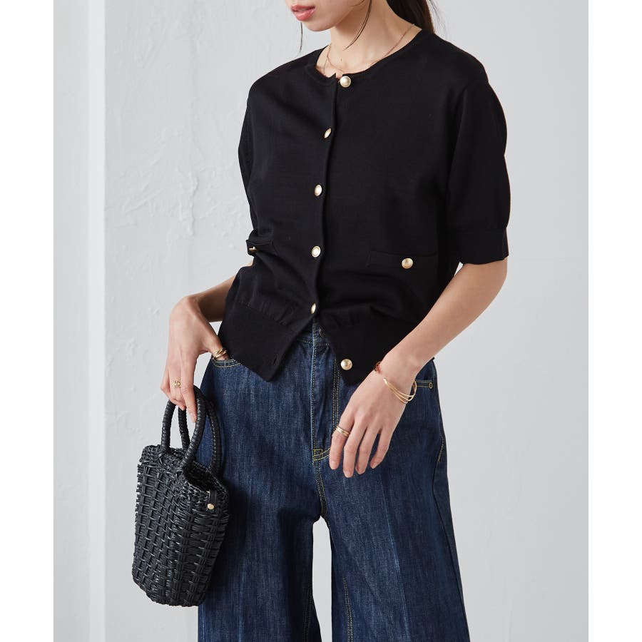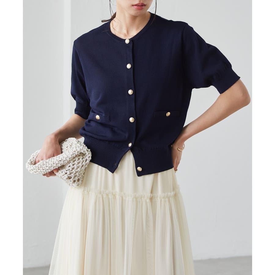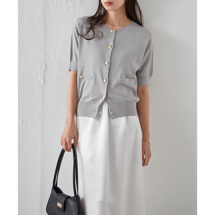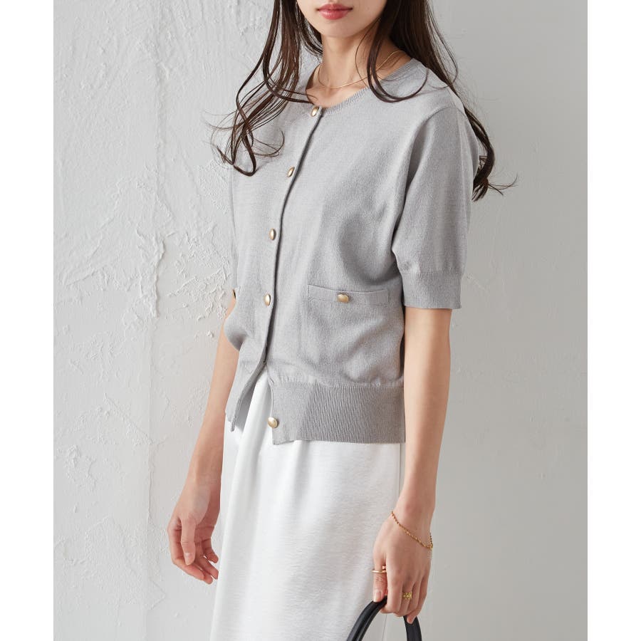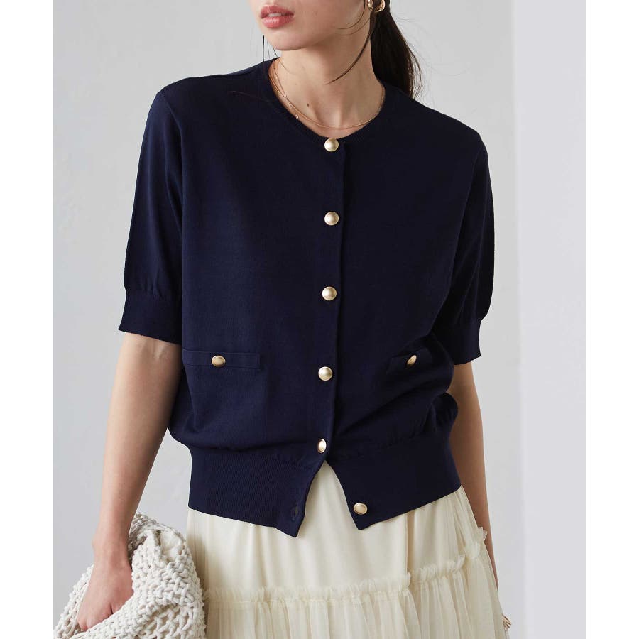 【洗える・ひんやり】ゴールド調ボタン5分袖ニットカーデ