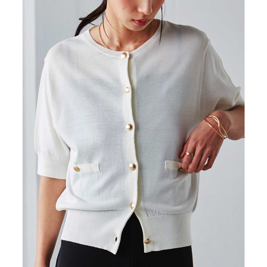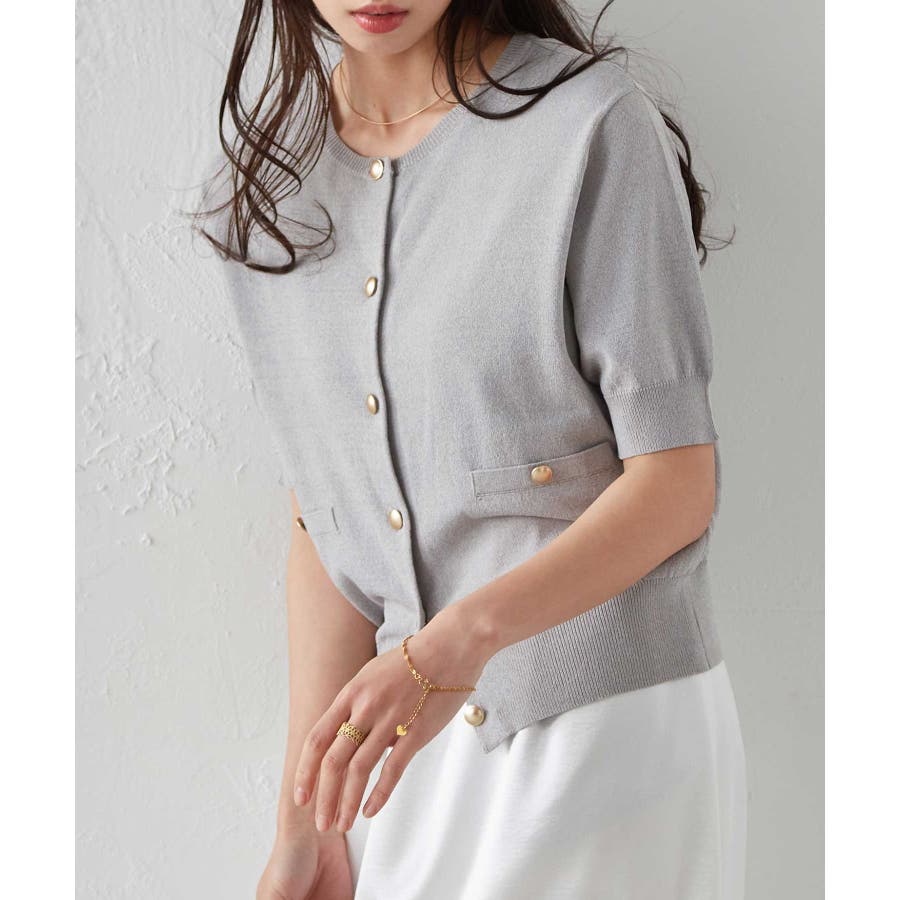 ゴールド調ボタンがアクセントになった、夏の華やかニットカーディガン。