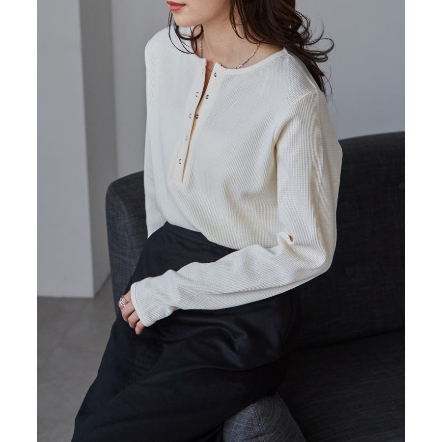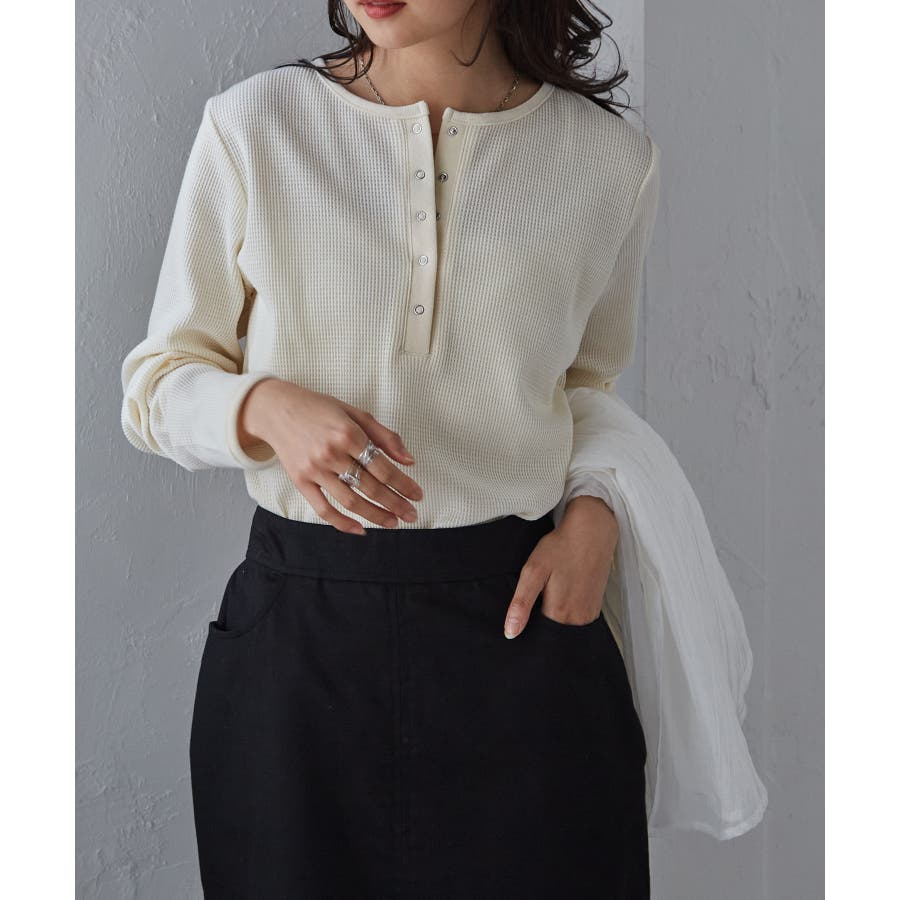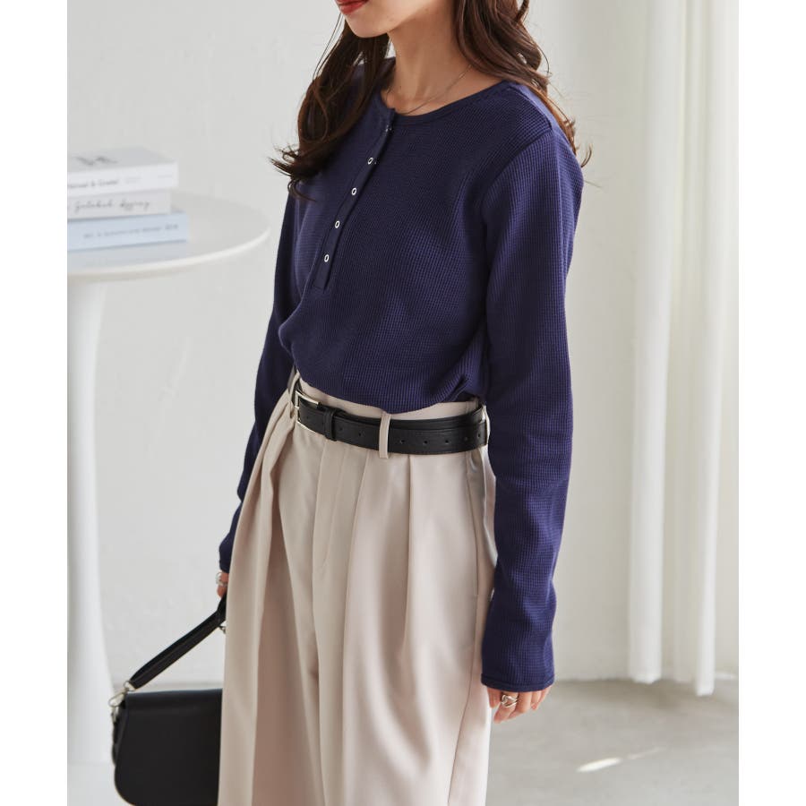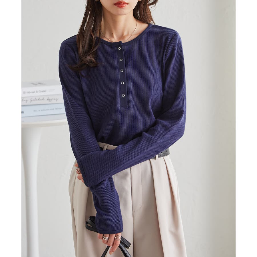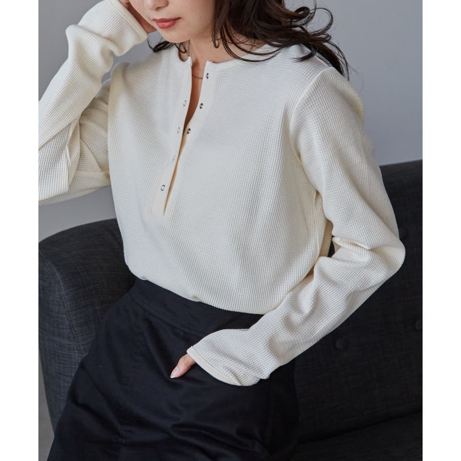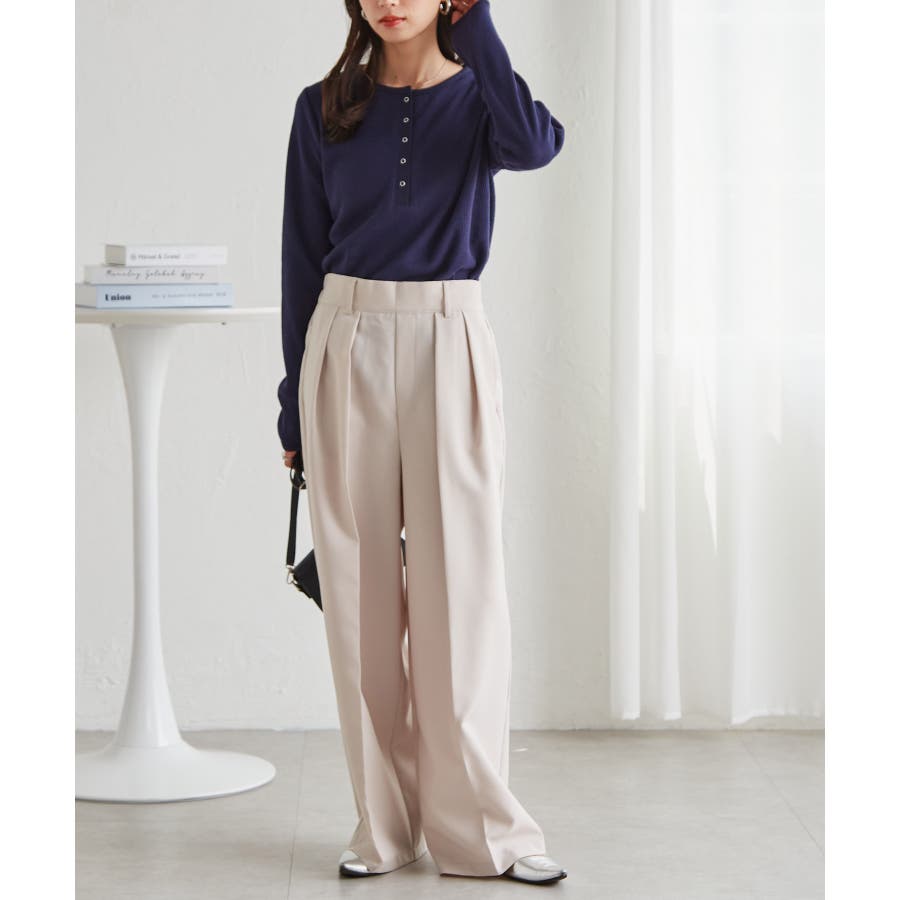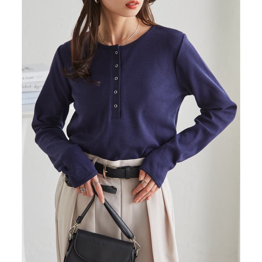 襟元はヘンリーネックデザインで程よい抜け感をプラスし女性らしいデザインに。
