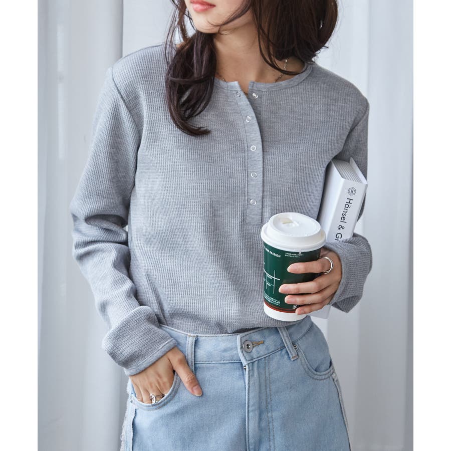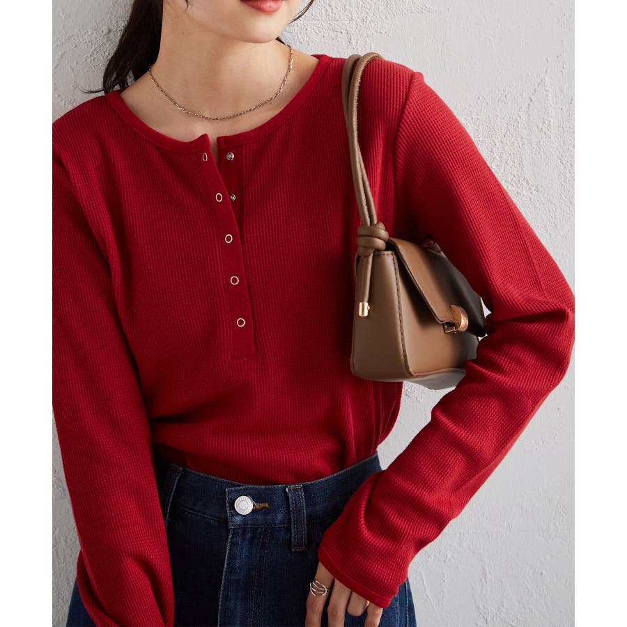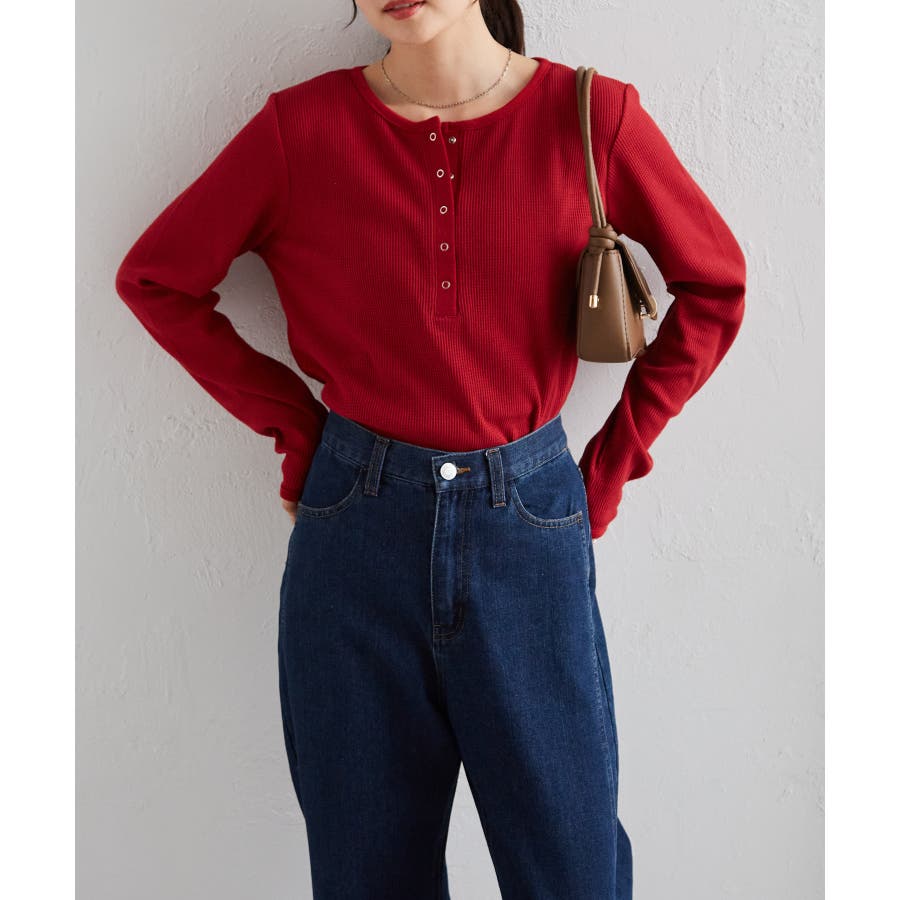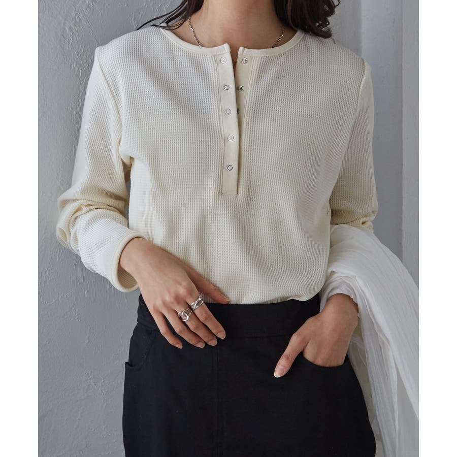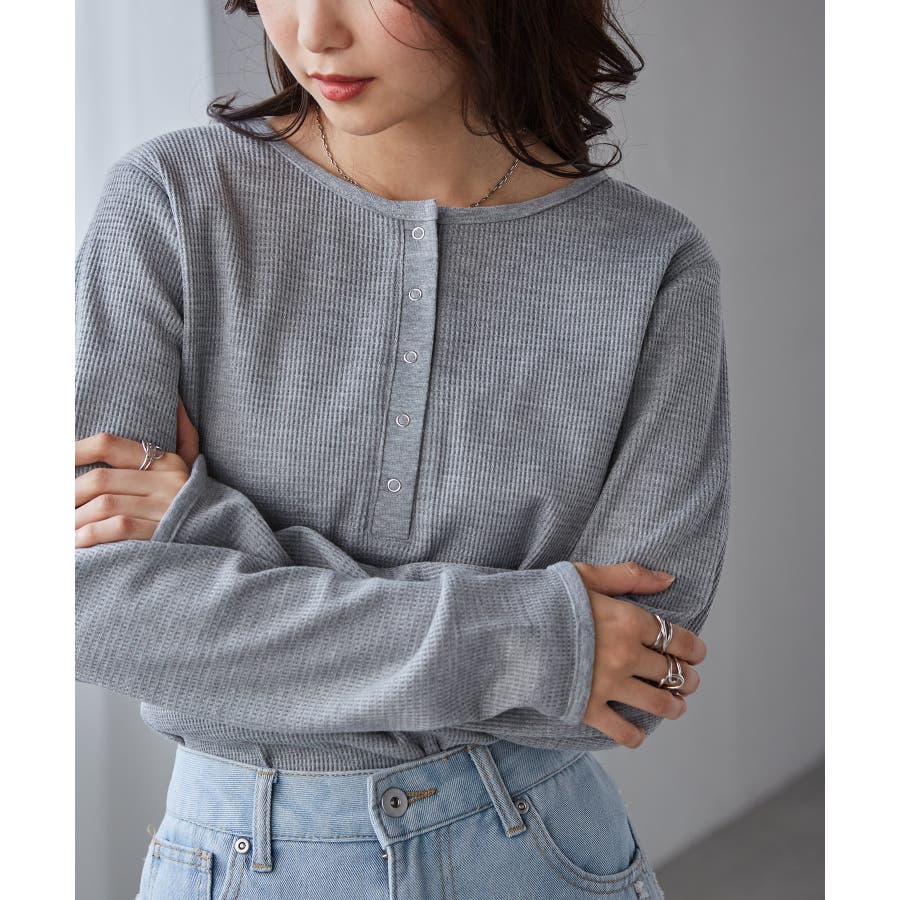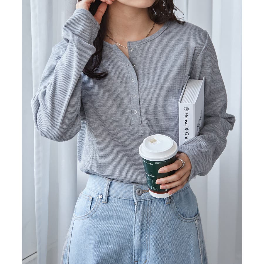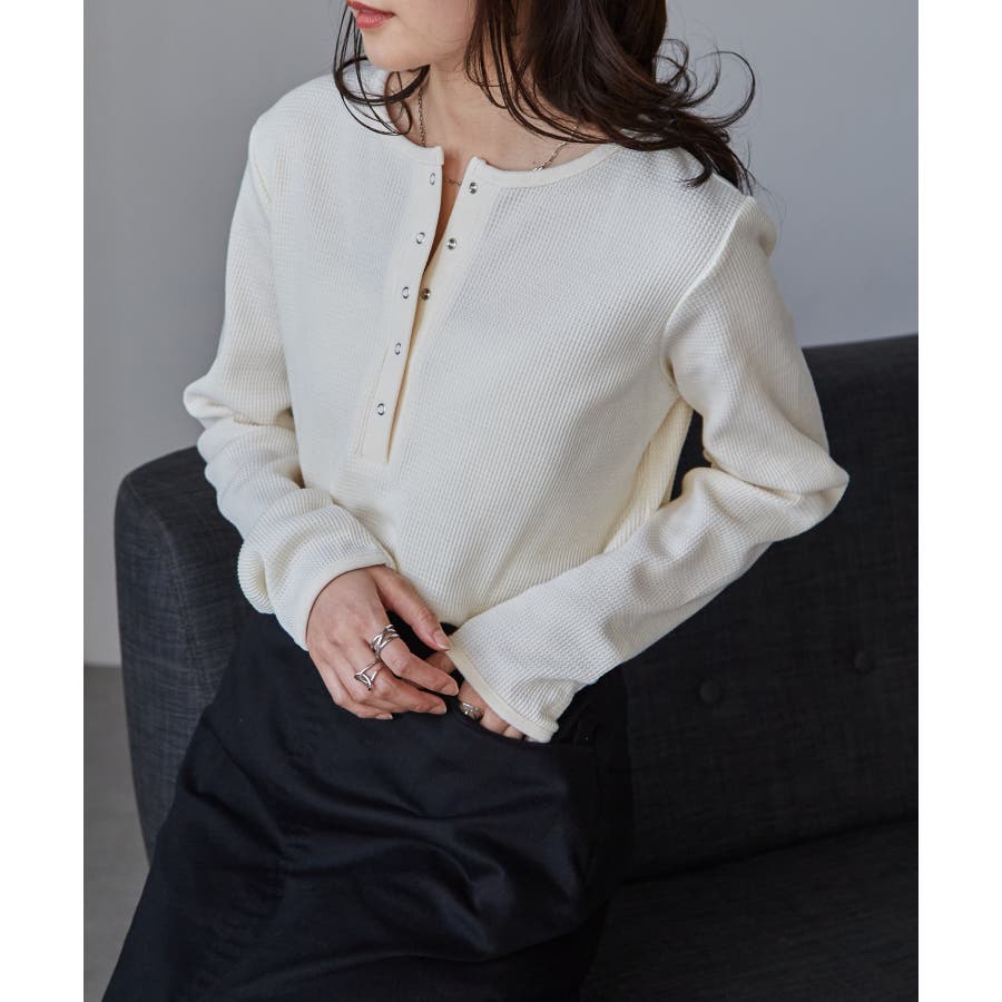 襟元はヘンリーネックデザインで程よい抜け感をプラスし女性らしいデザインに。