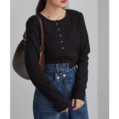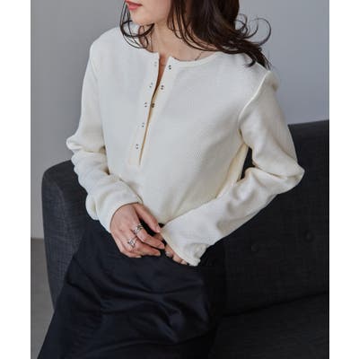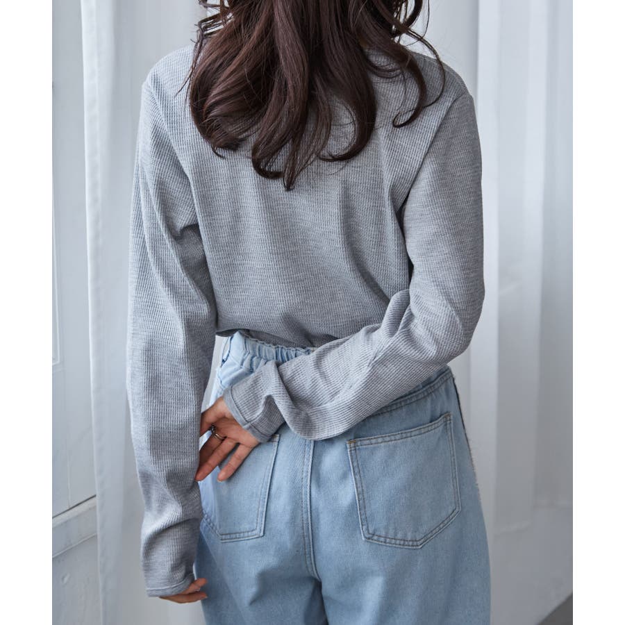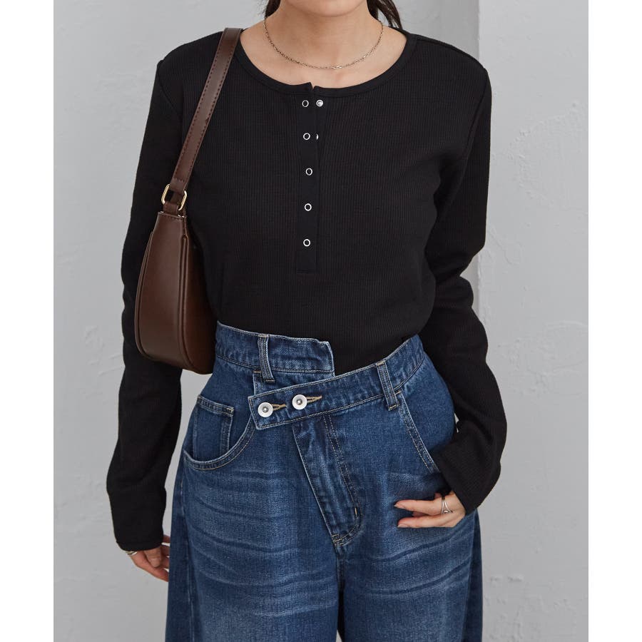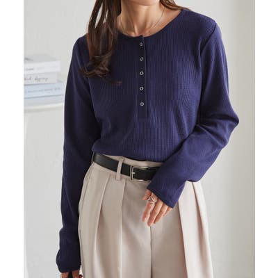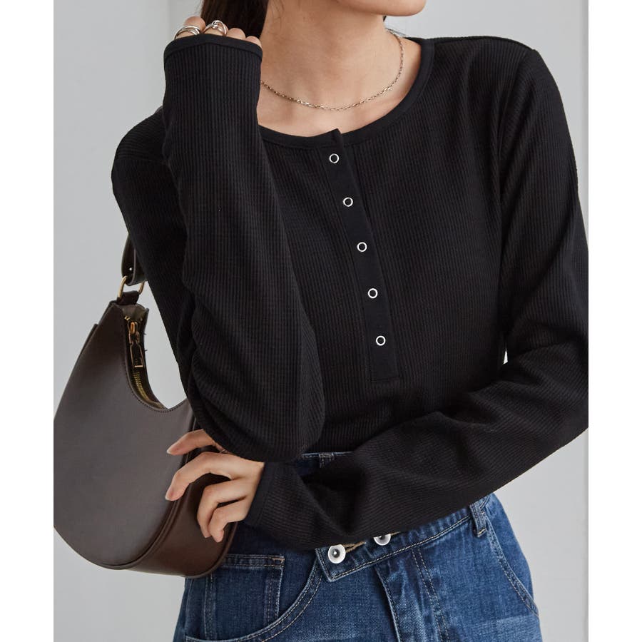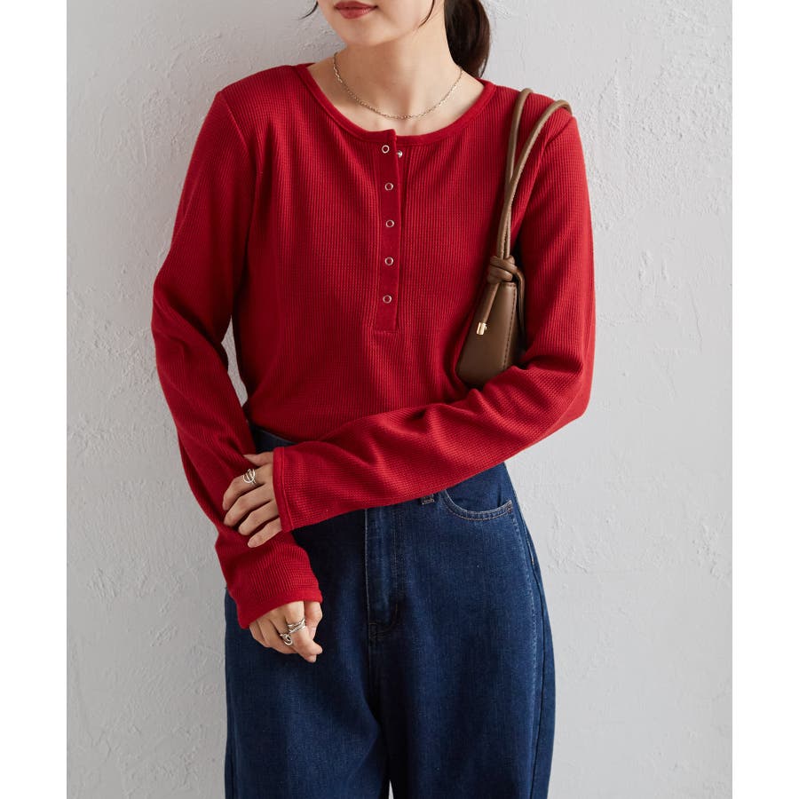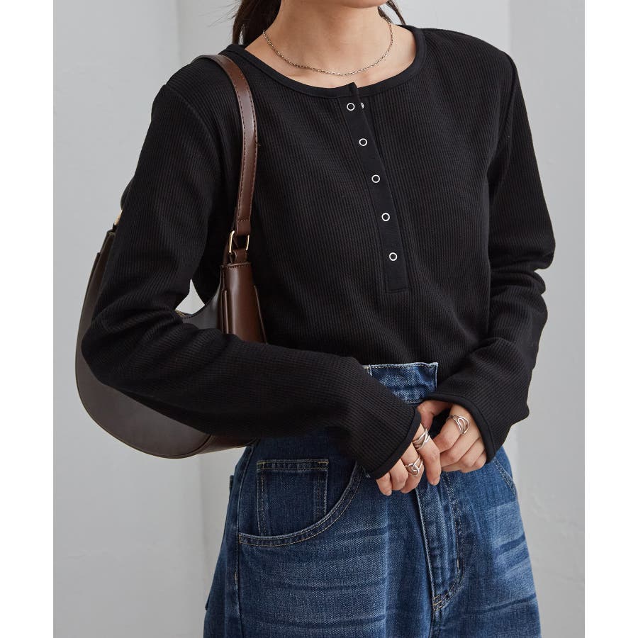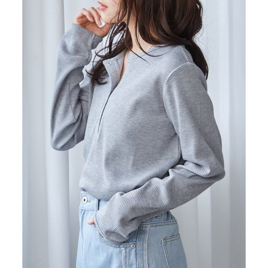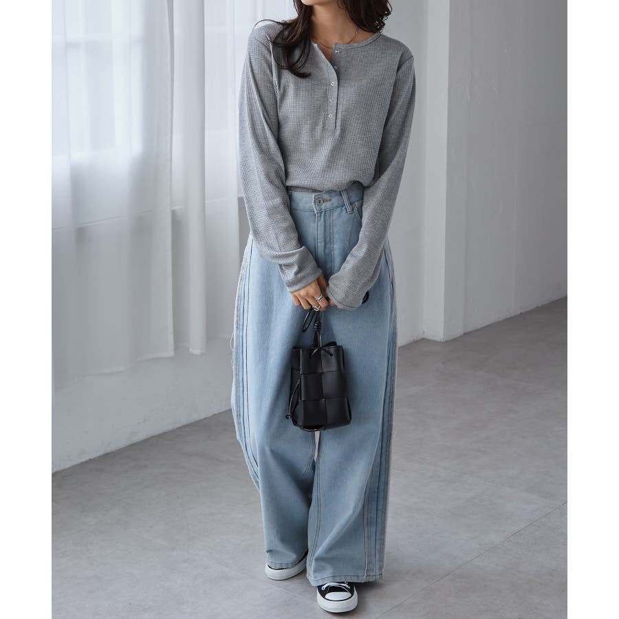 襟元はヘンリーネックデザインで程よい抜け感をプラスし女性らしいデザインに。