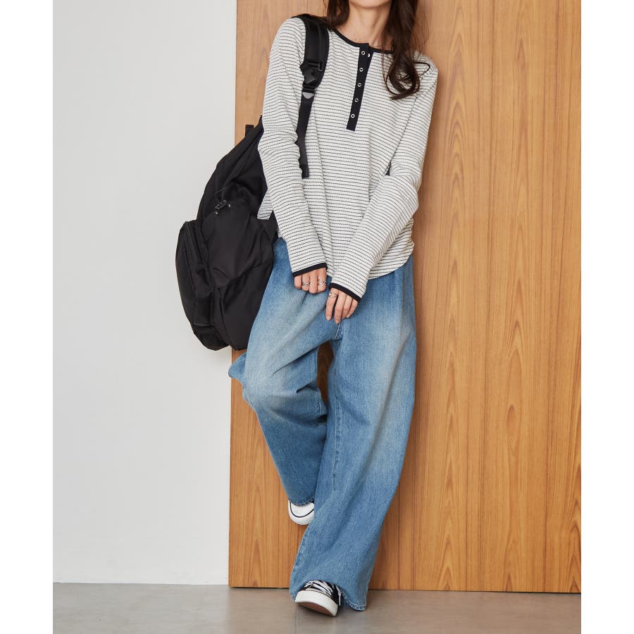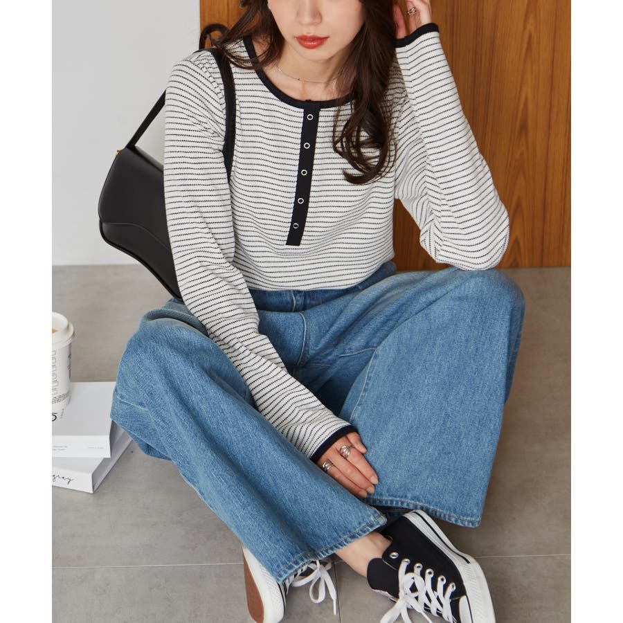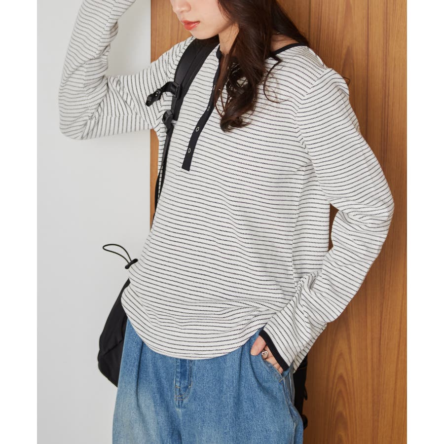 ・細めのボーダーで華奢見せ&襟元はヘンリーネックデザインで抜け感をプラス♪
