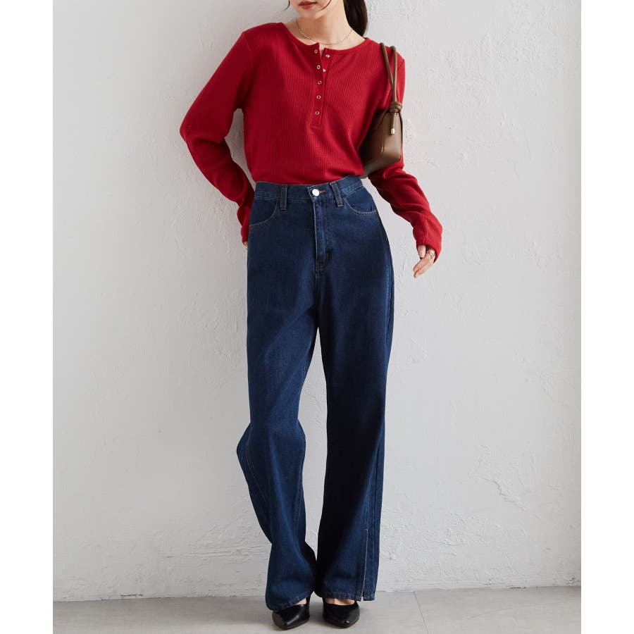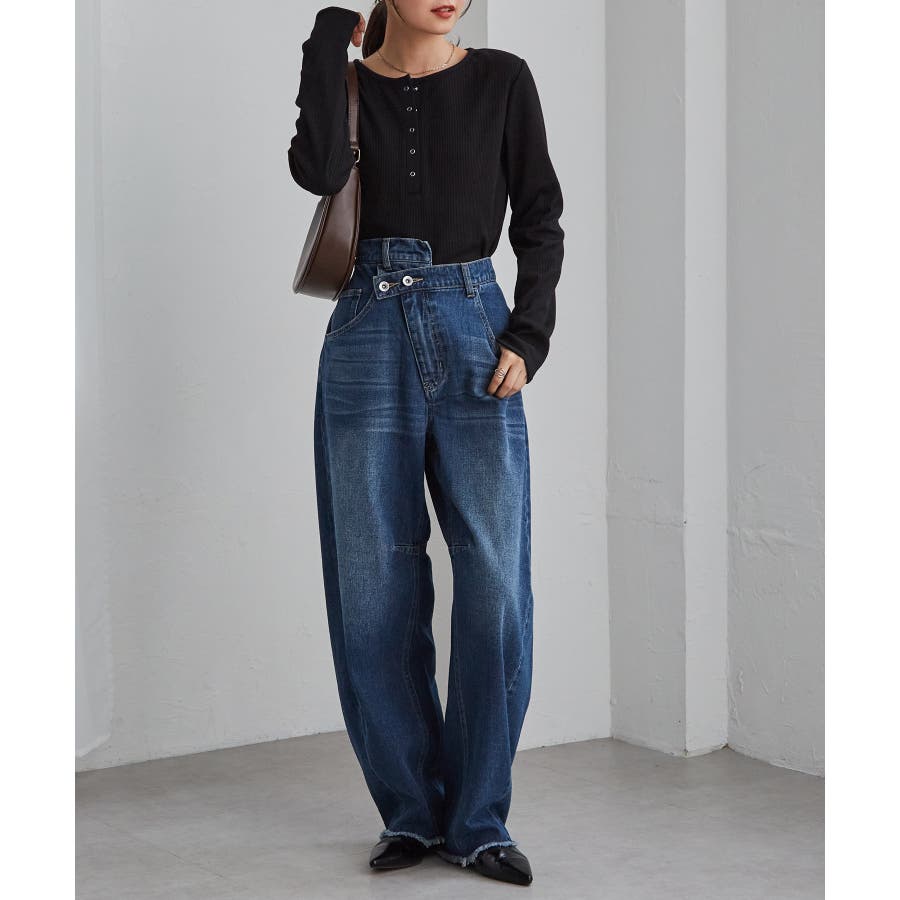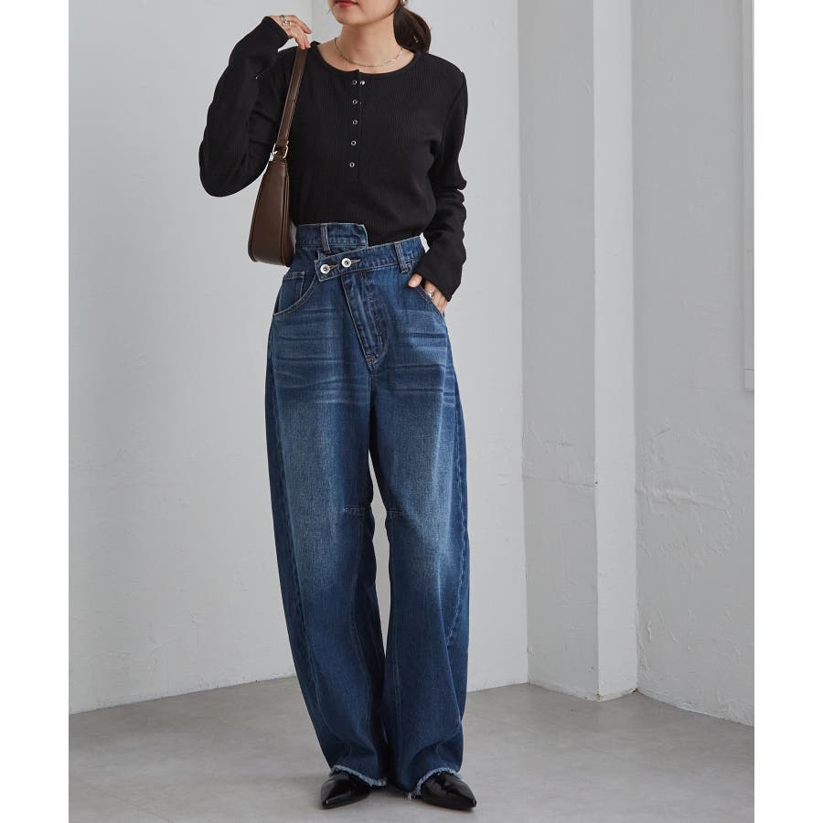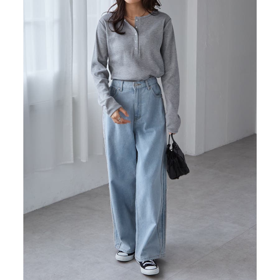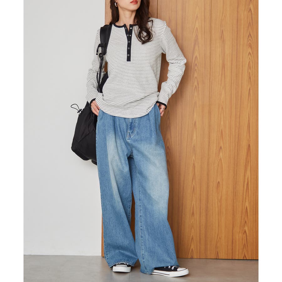 デニムコーデでカジュアルなスタイルにはもちろん、ボリュームのあるボトムスを合わせるとシルエットにメリハリあるトレンドスタイルも楽しめます。