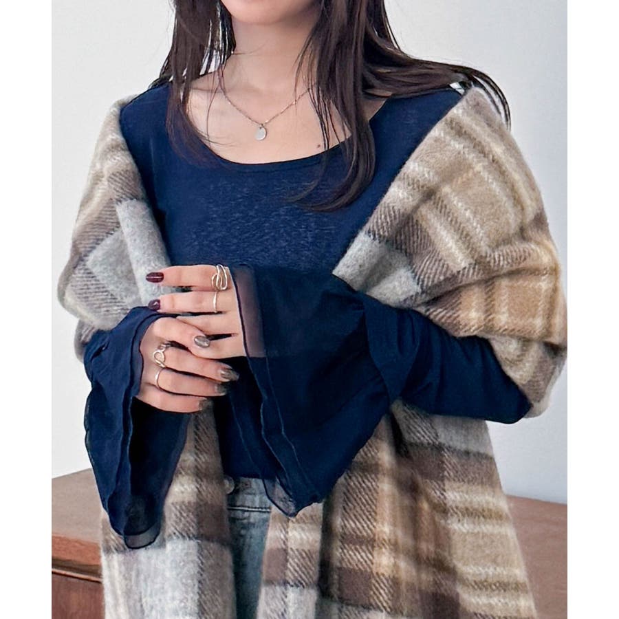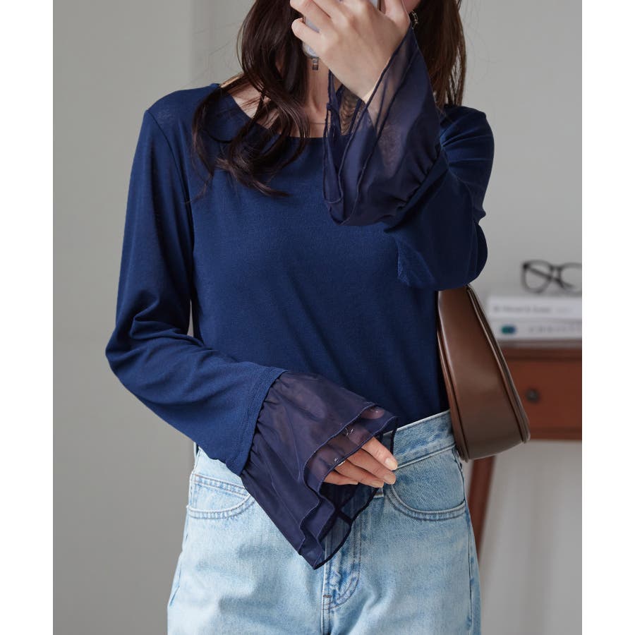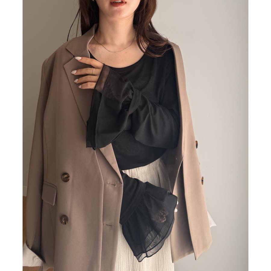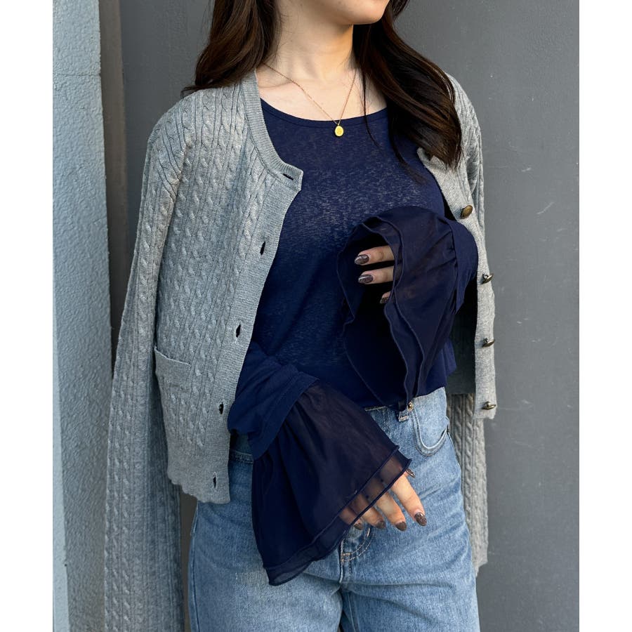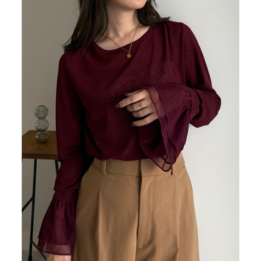 袖口のフレアー袖が女性らしさを演出しニットやスウェット合わせのレイヤードスタイルも決まります。