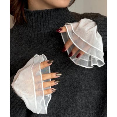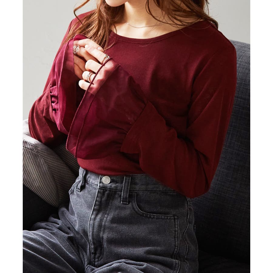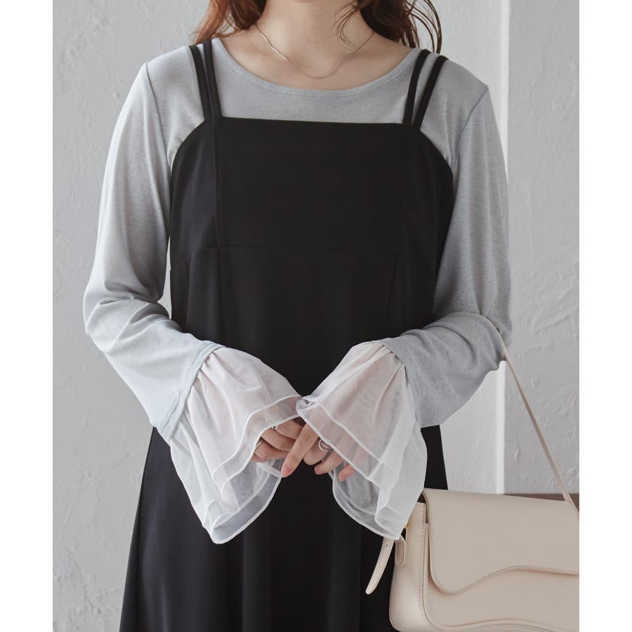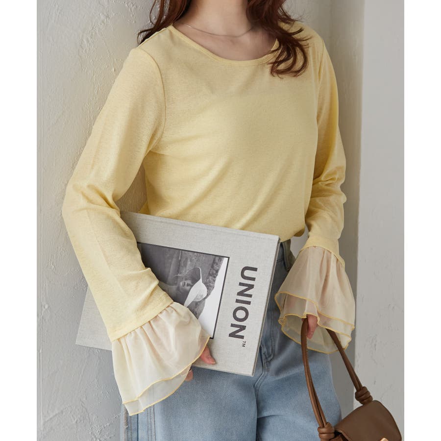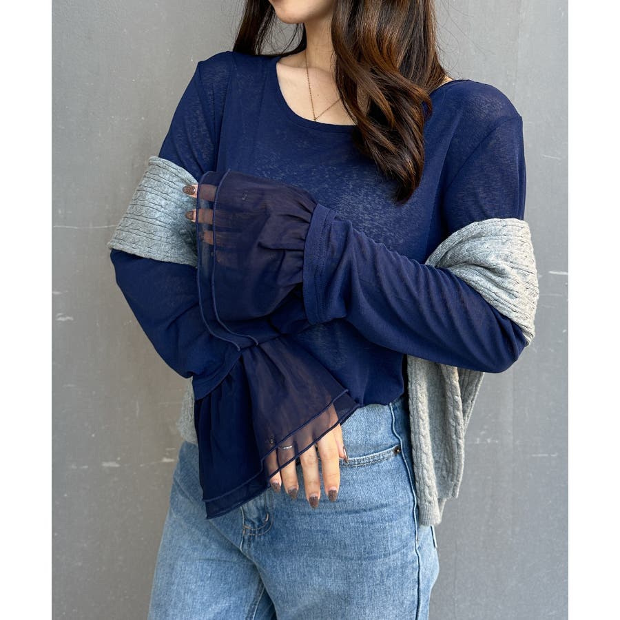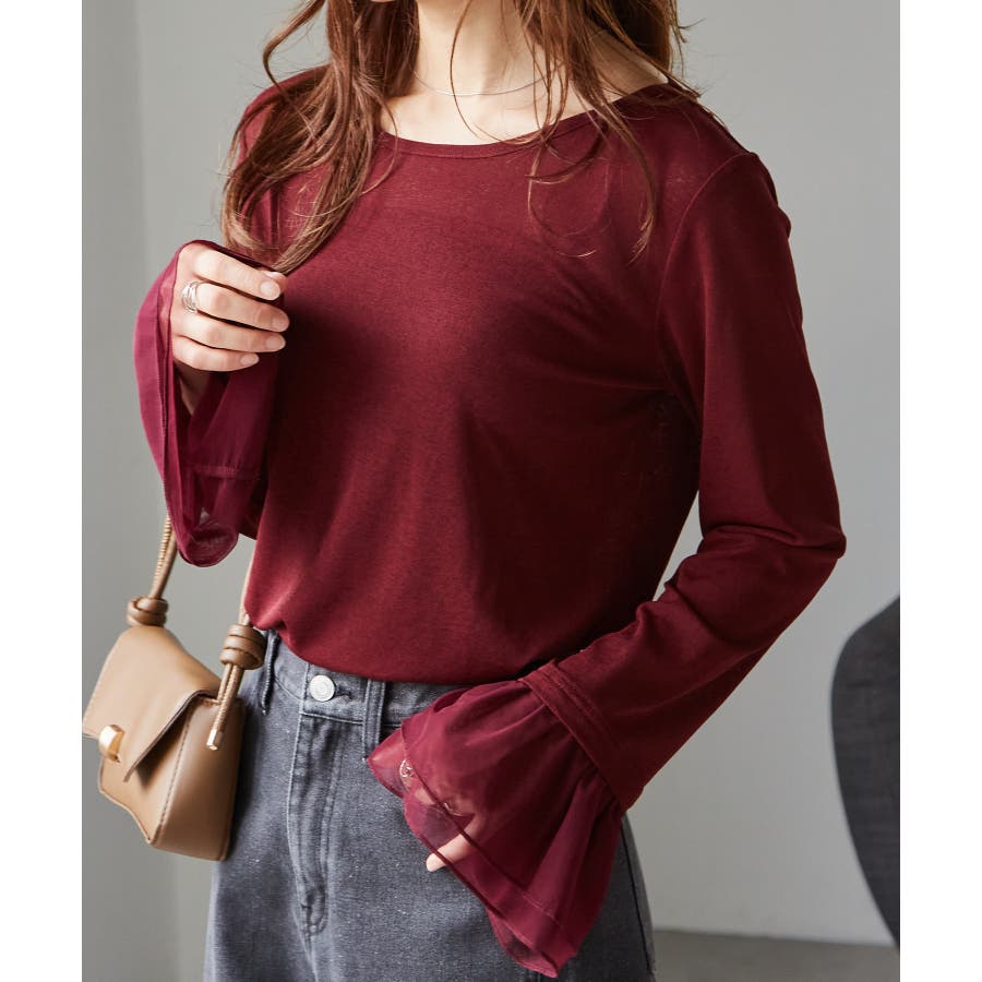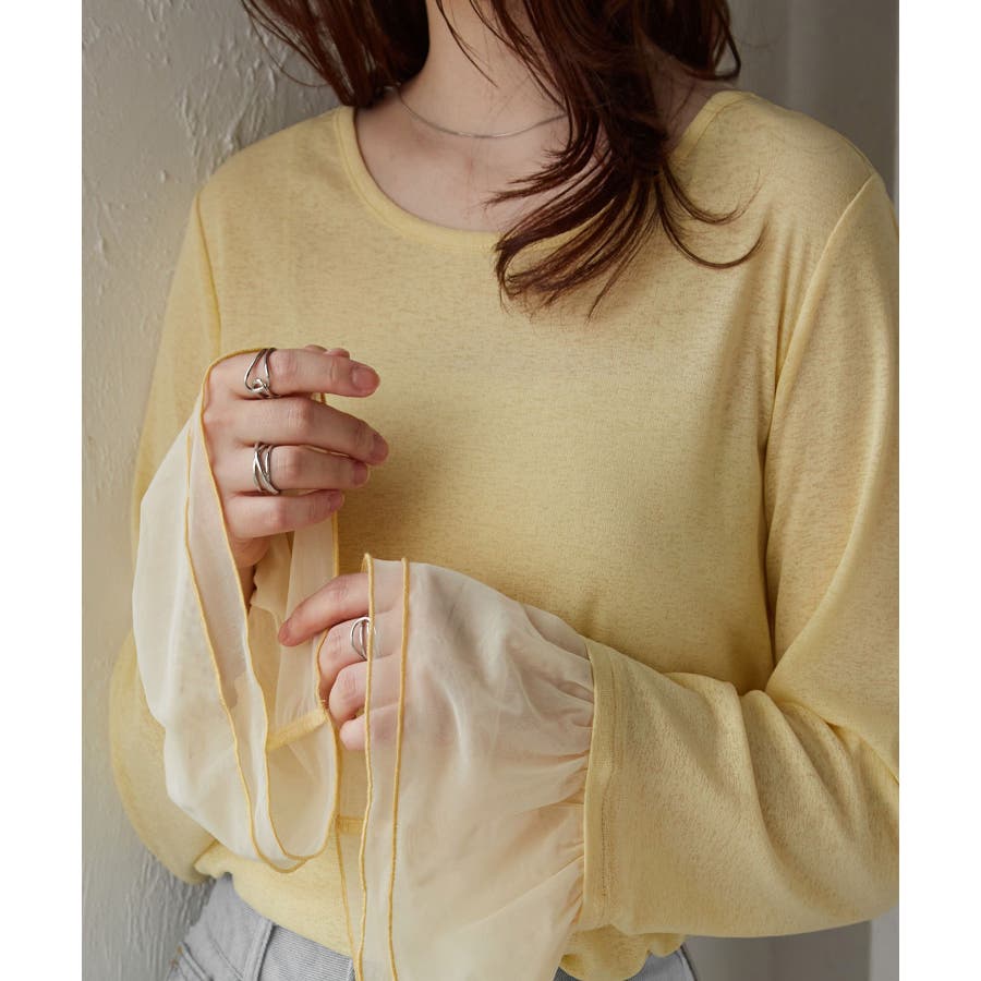 ・透け感あるシアー素材のフレアスリーブが女性らしさを演出。