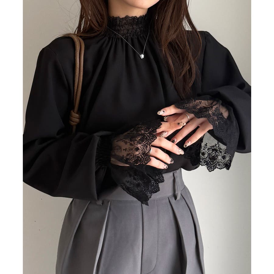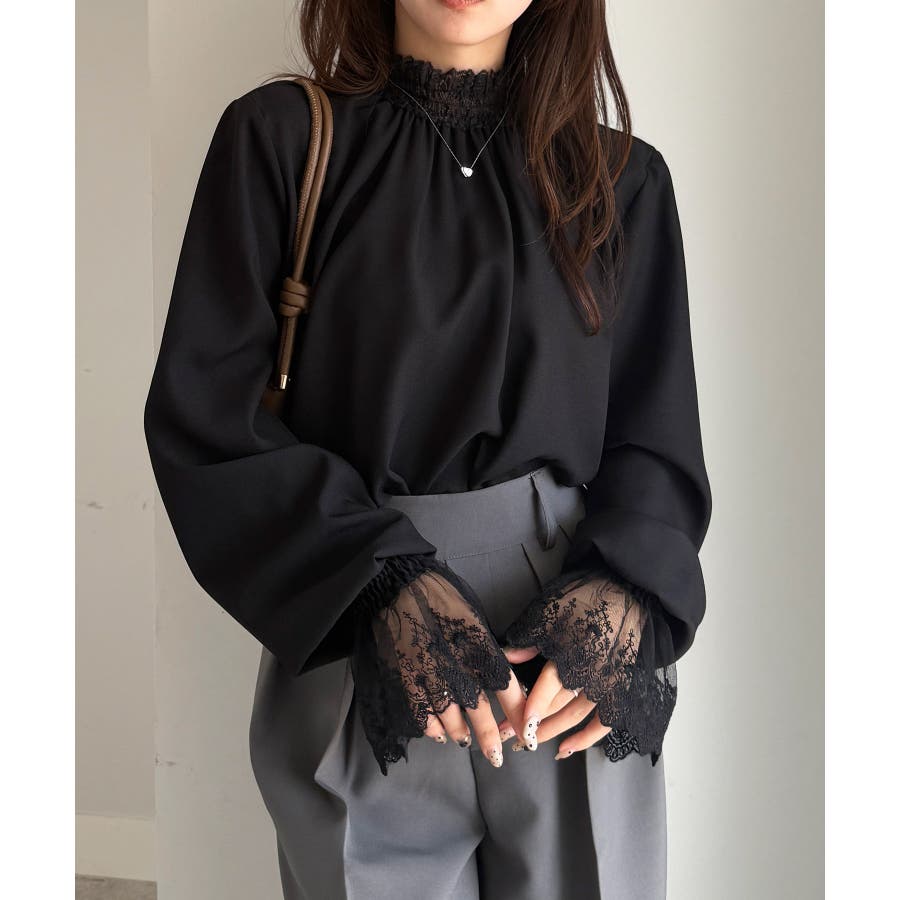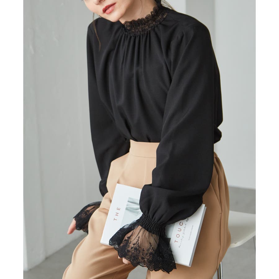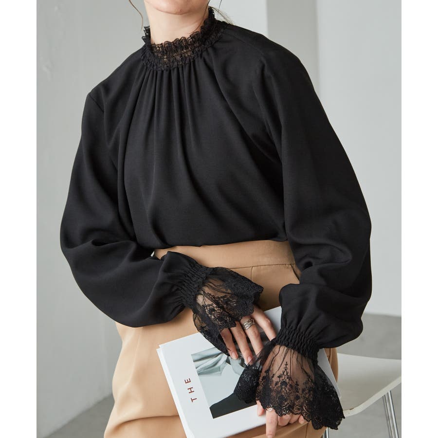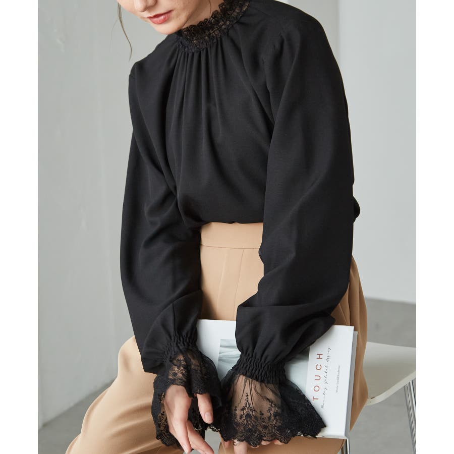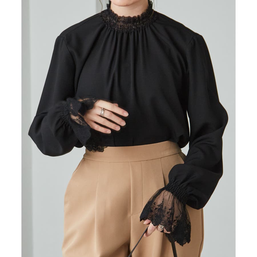 ・繊細レースをハイネックの衿と袖先に切替たブラウス。