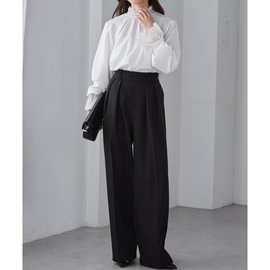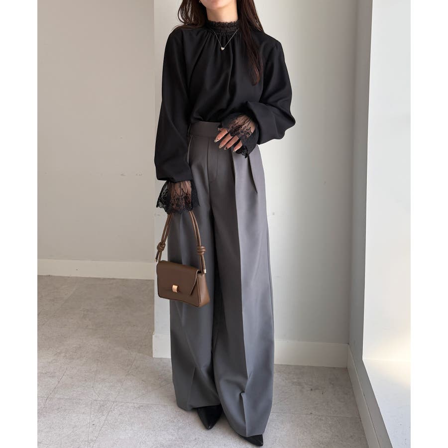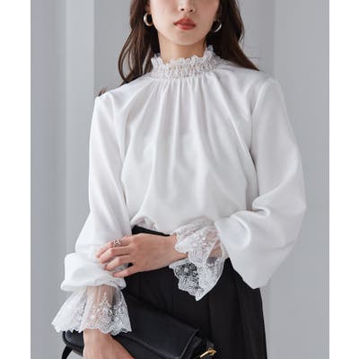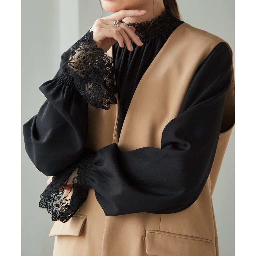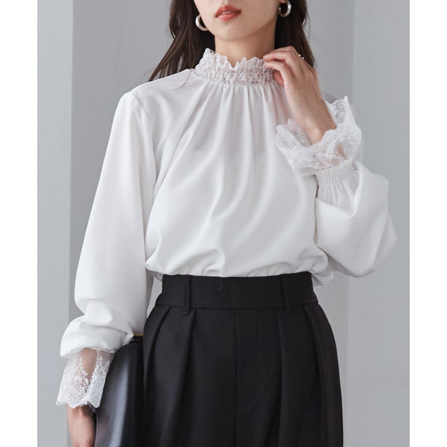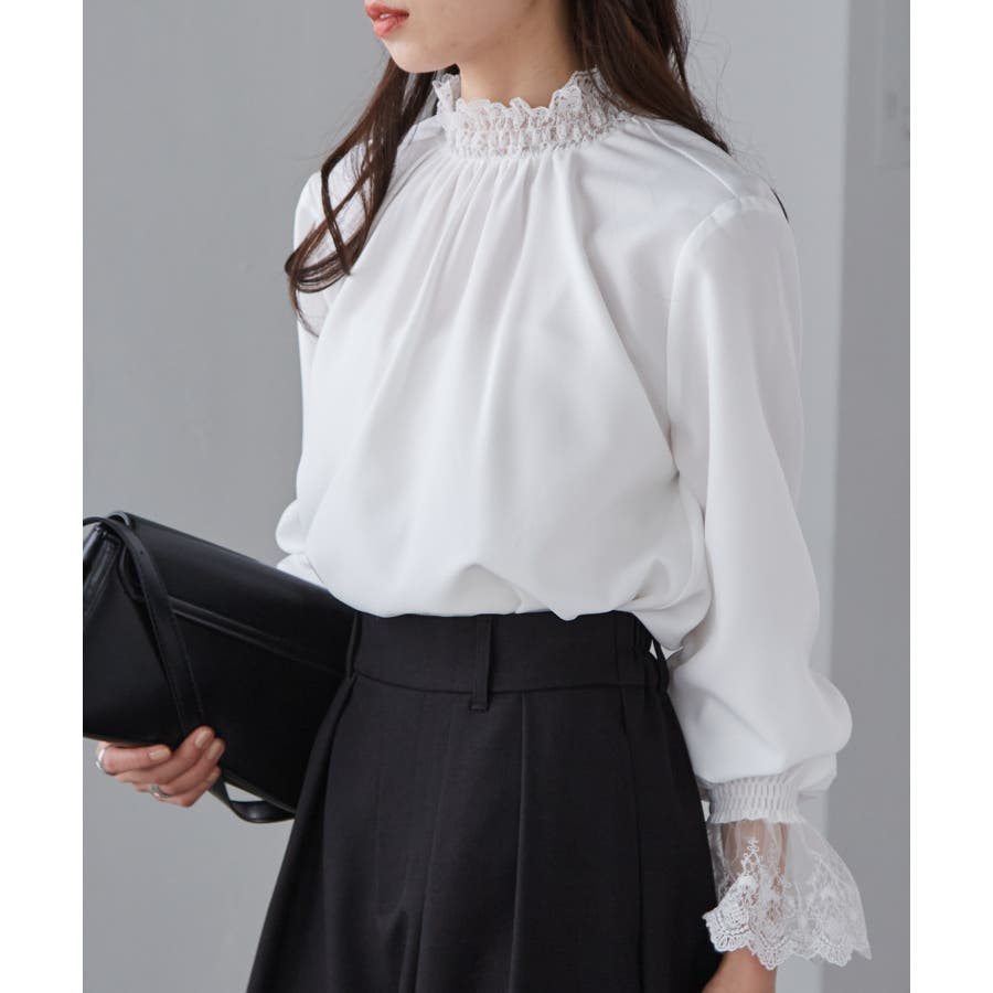 ・繊細レースをハイネックの衿と袖先に切替たブラウス。