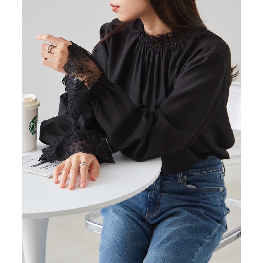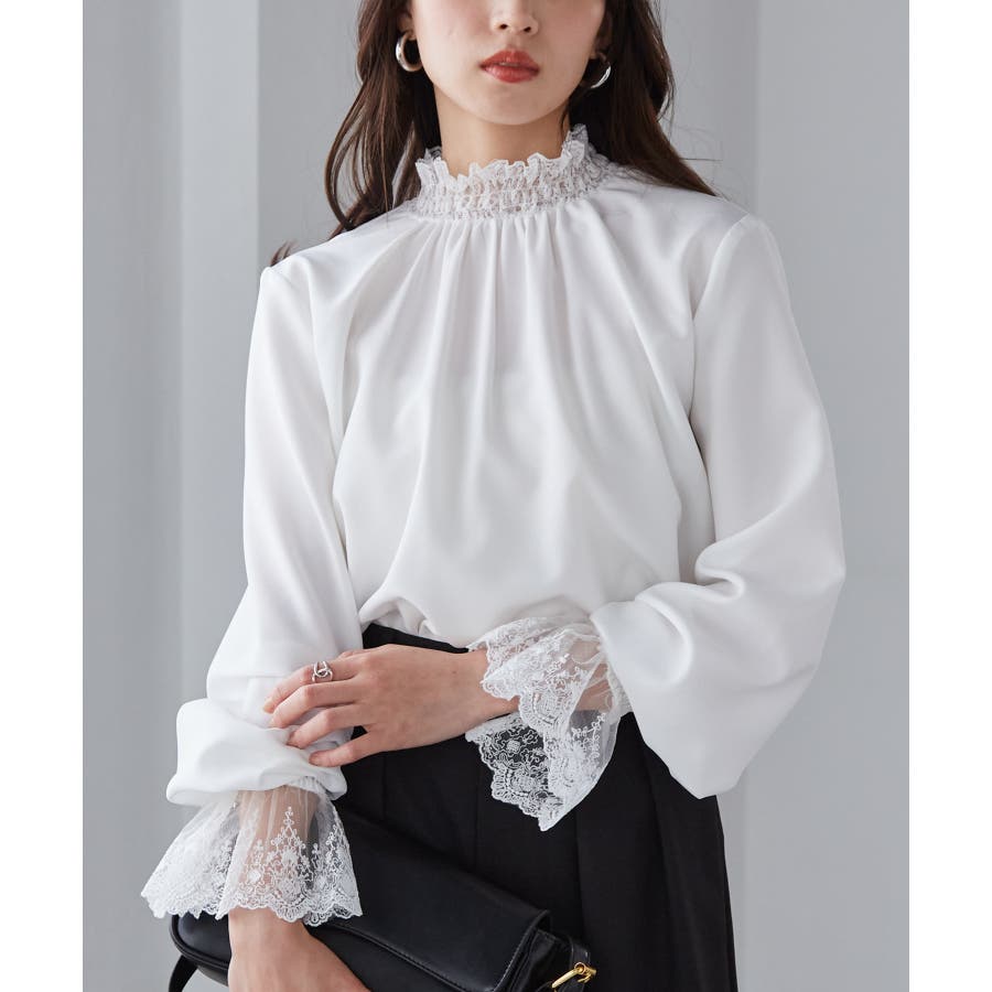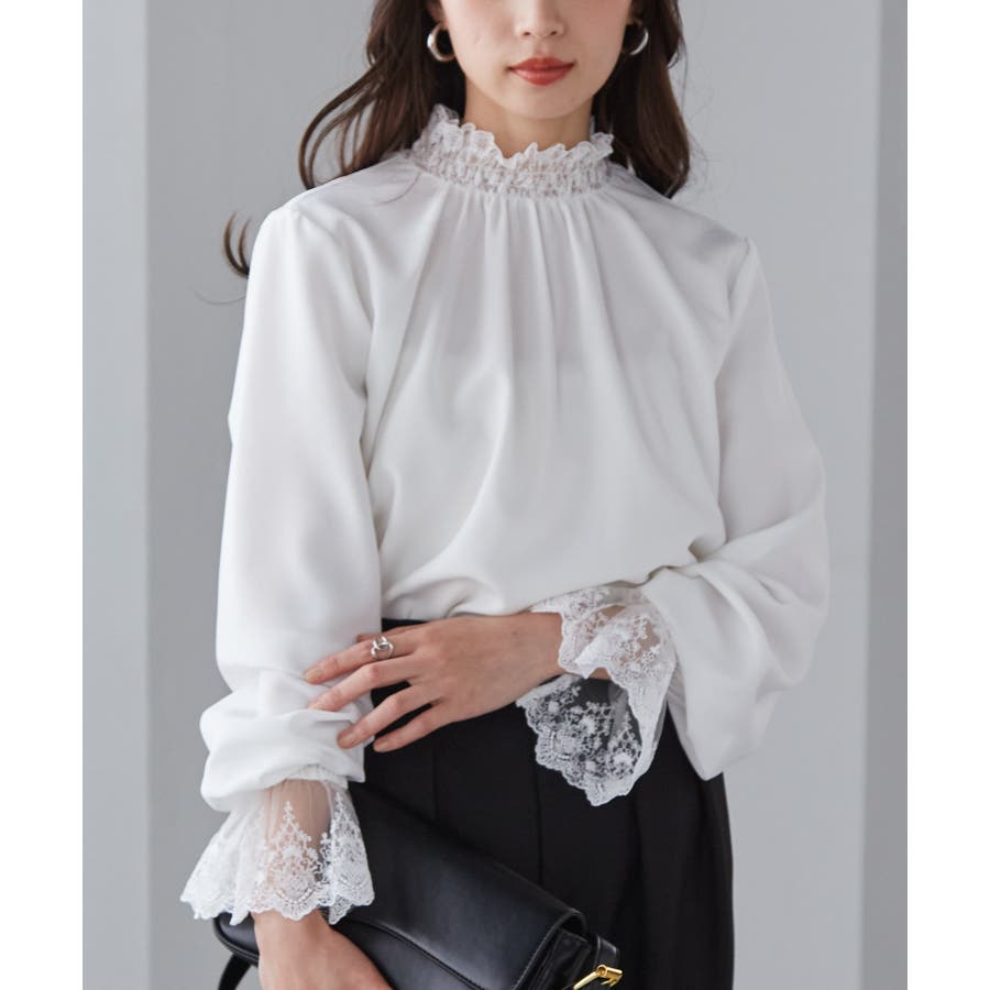 衿と袖それぞれ異なる繊細なレースを配し、スタイリングに華やかさを添える上品なプルオーバーブラウス。