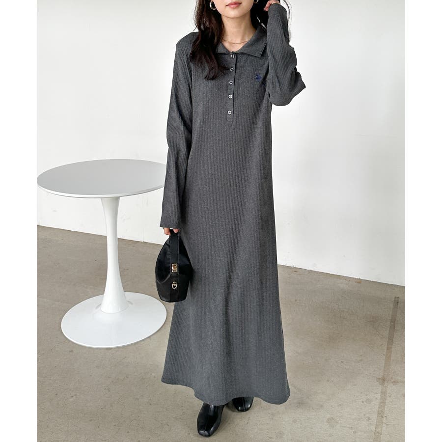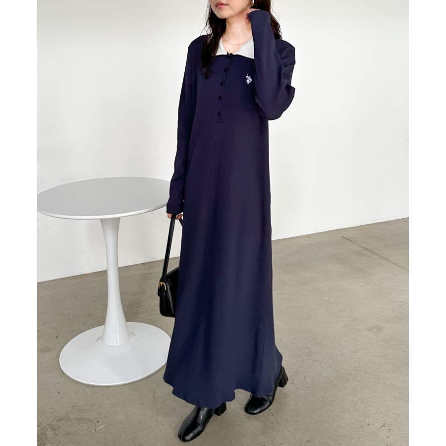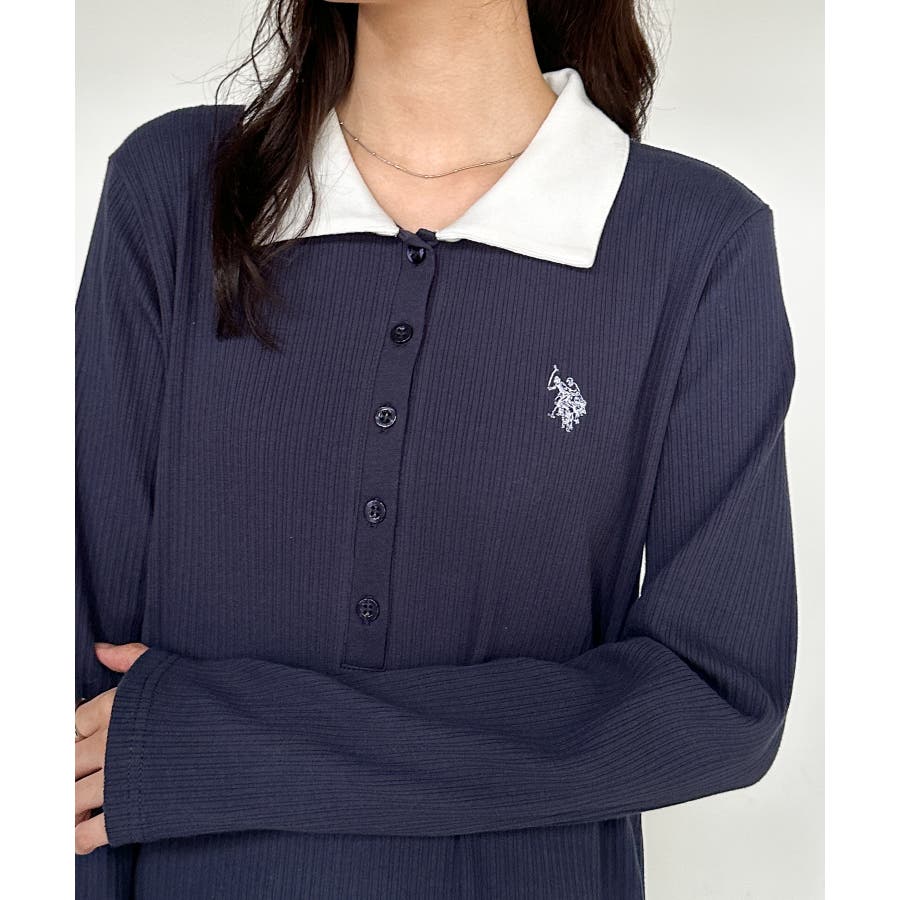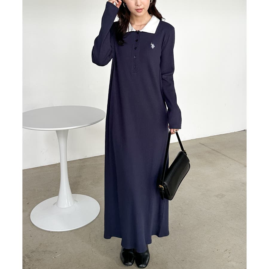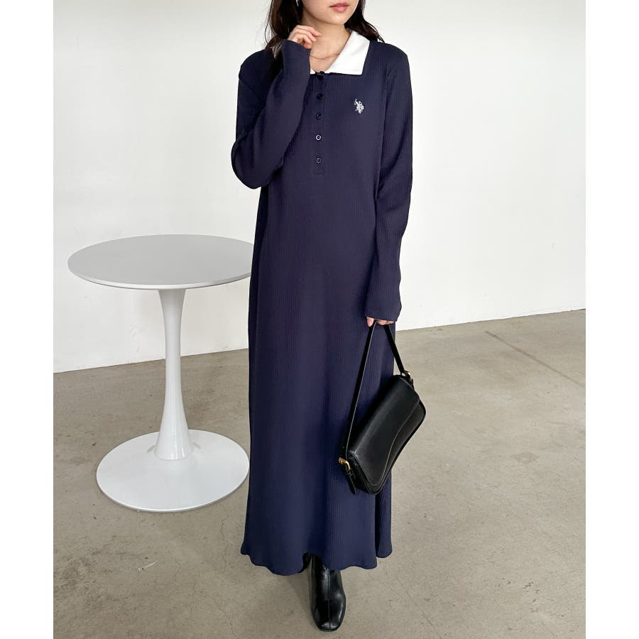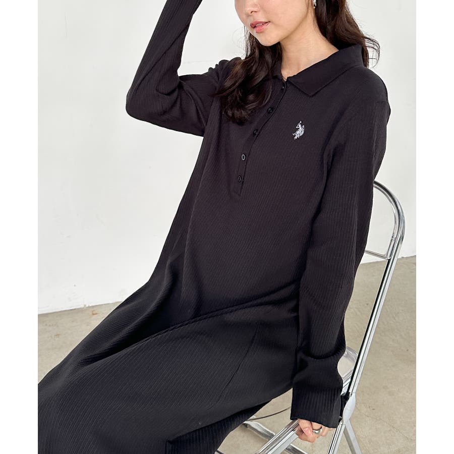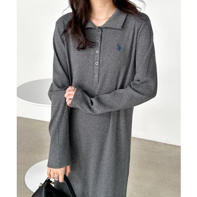 <U.S.P>ポロ衿長袖リブワンピース
