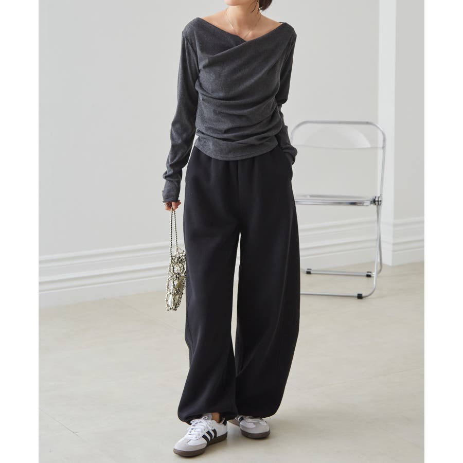 ゆったりしたワイドシルエットは、裾のドロストを絞ればバルーンシルエットにもなる2WAY♪