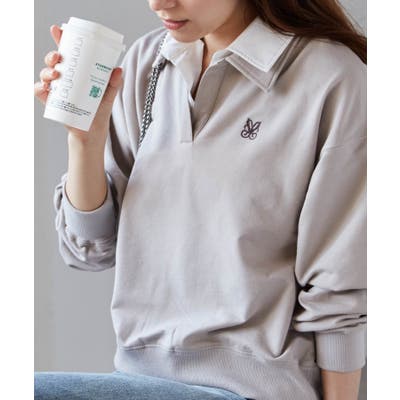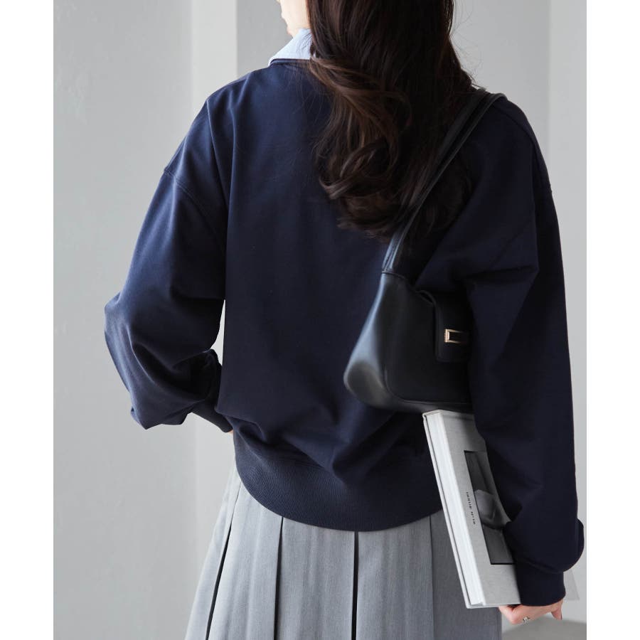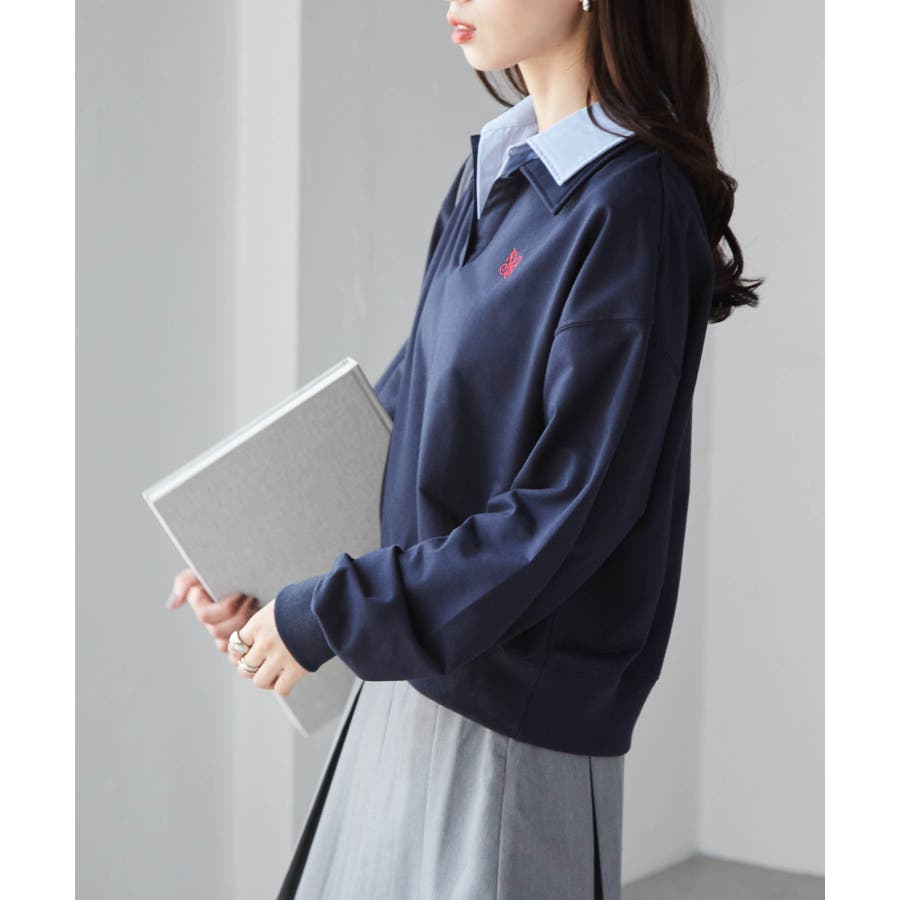 ・シャツの上にスウェットプルオーバーをレイヤードしたかのように見えるトップス。