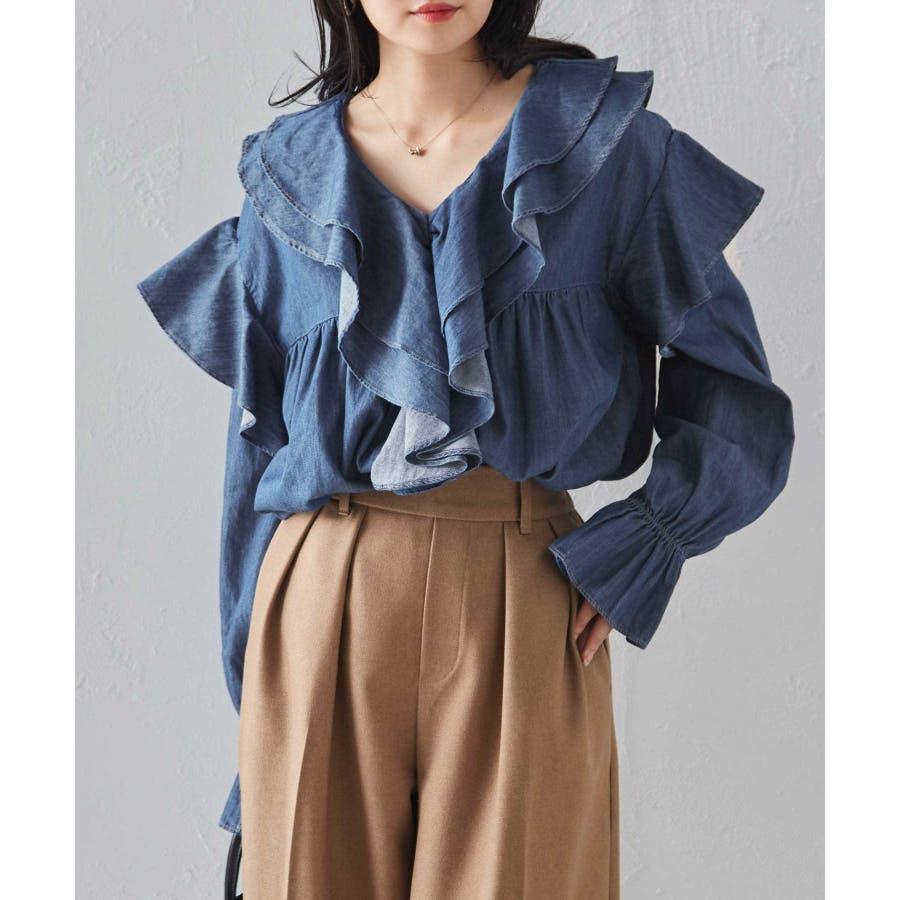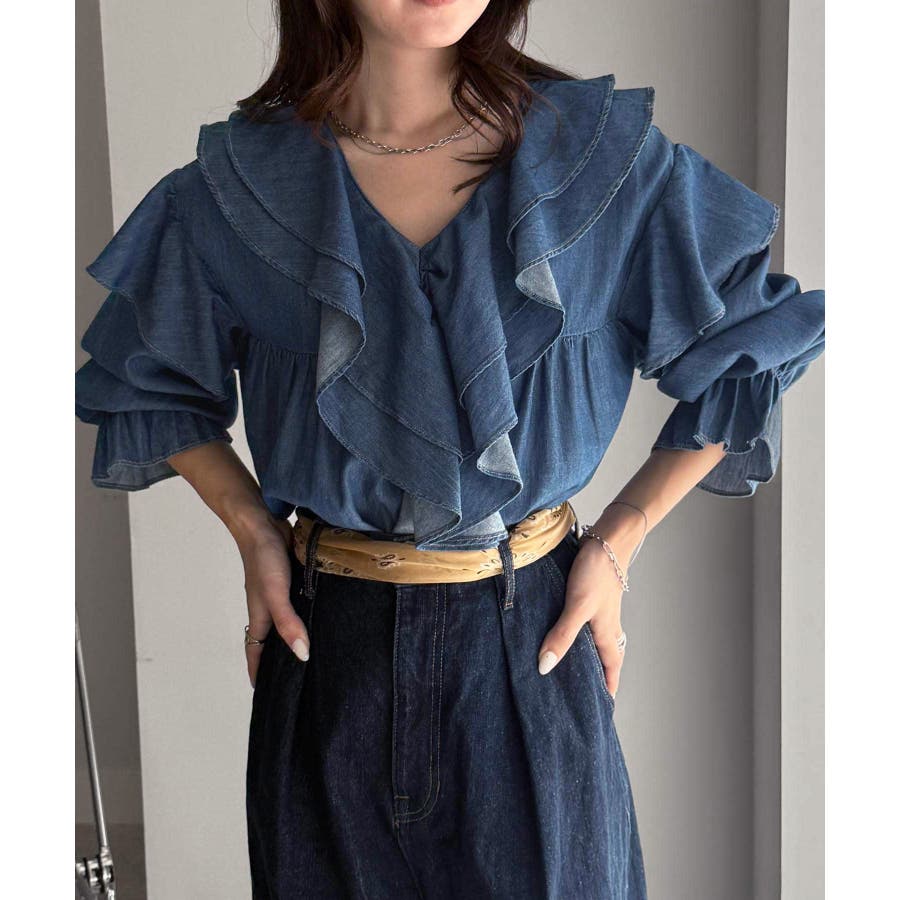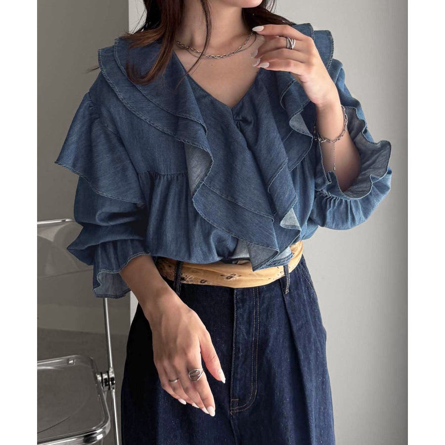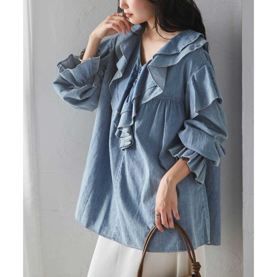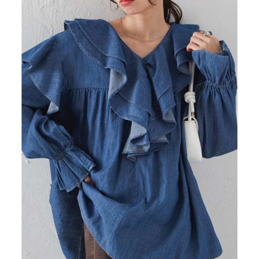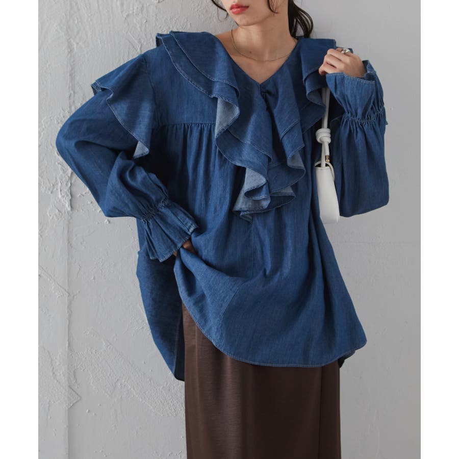 デニム素材のフリルデザインが印象的なチュニックブラウス♪