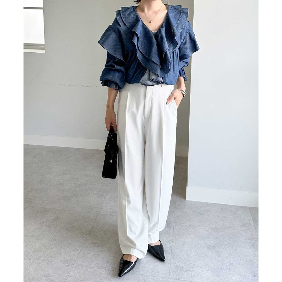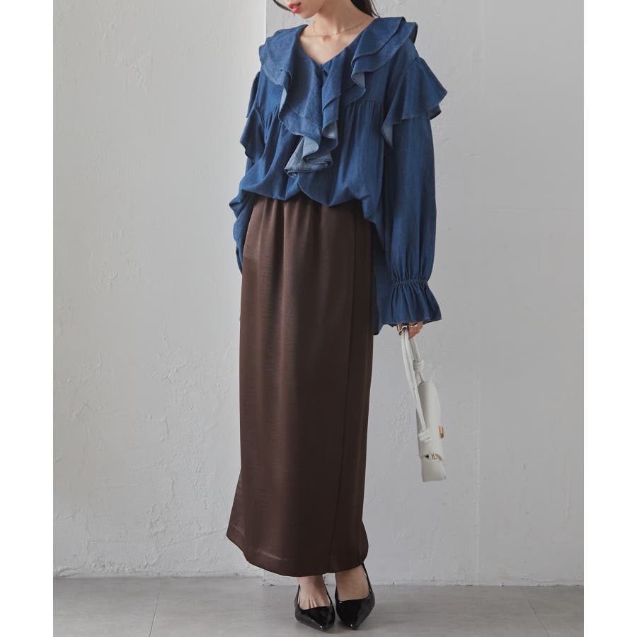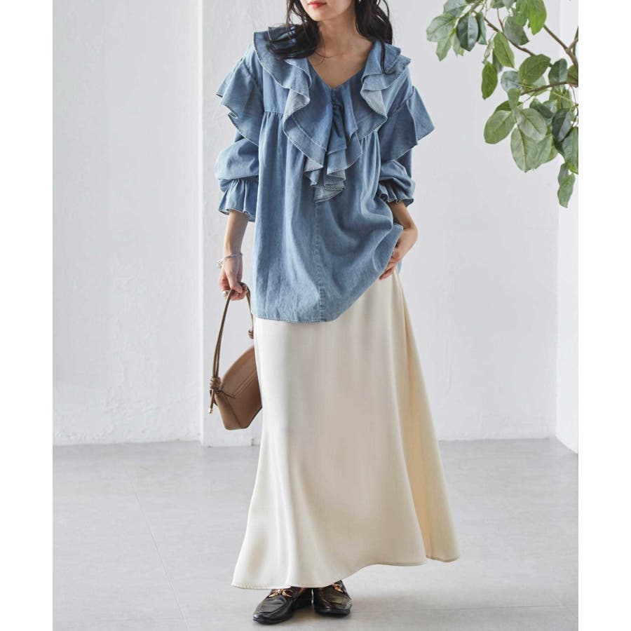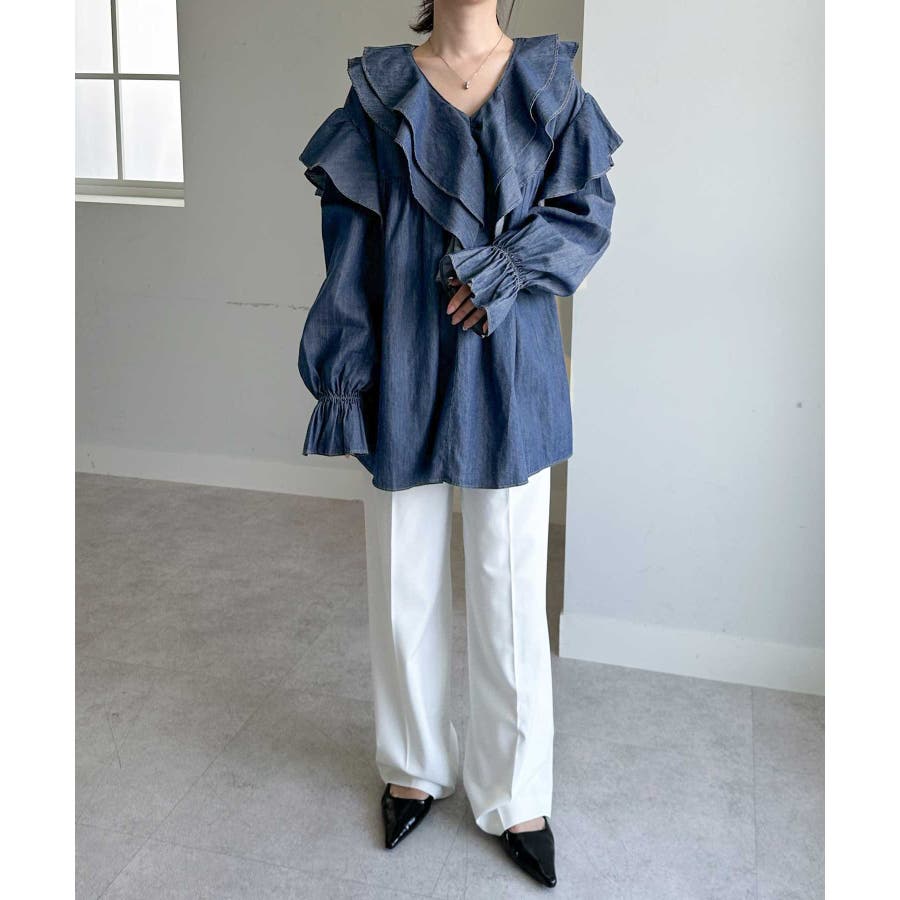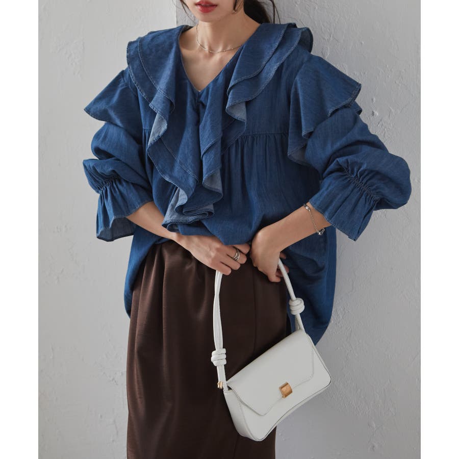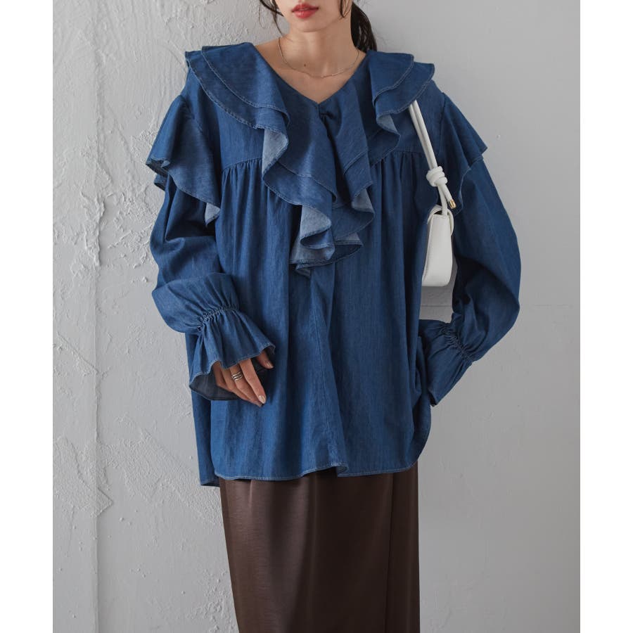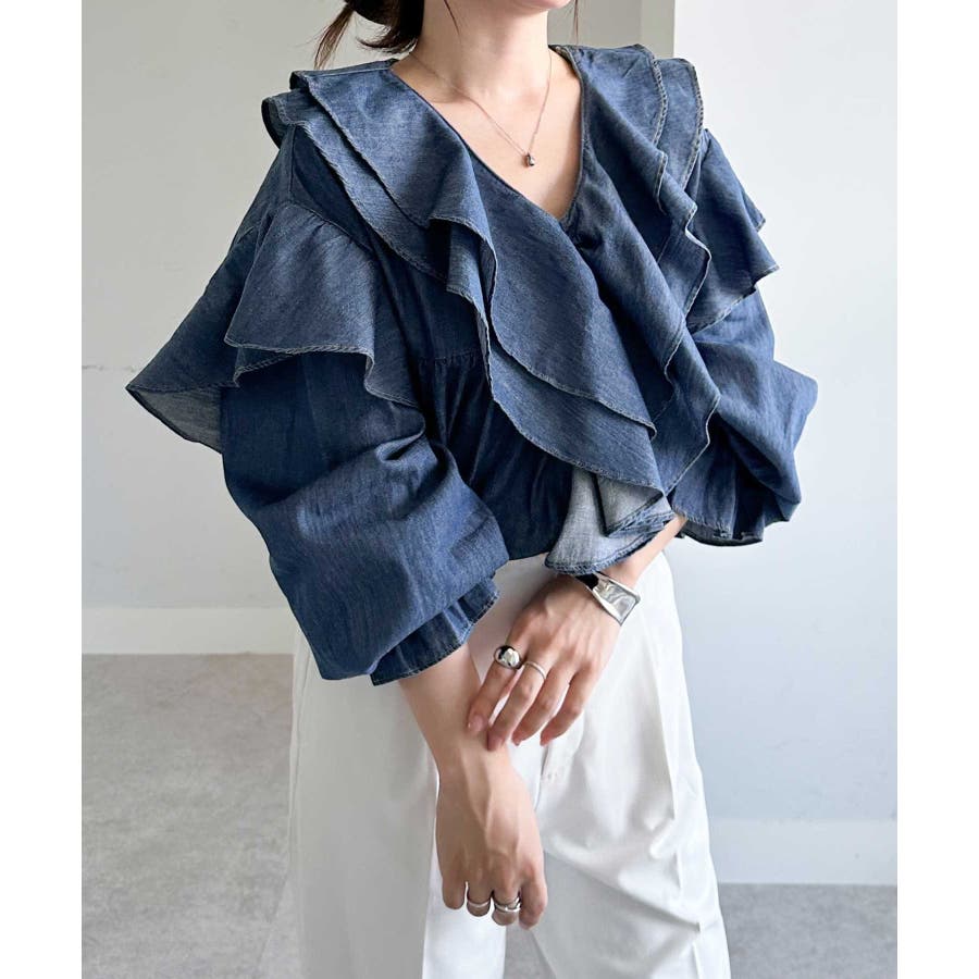 デニム素材のフリルデザインが印象的なチュニックブラウス♪