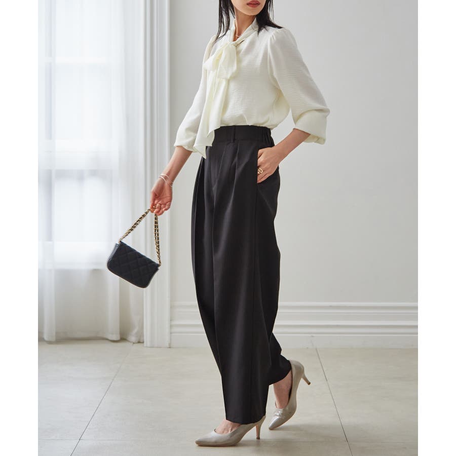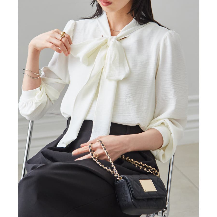 多機能付き素材でオフィスカジュアルにもデイリーユースにも◎長袖ボウタイリボンブラウス