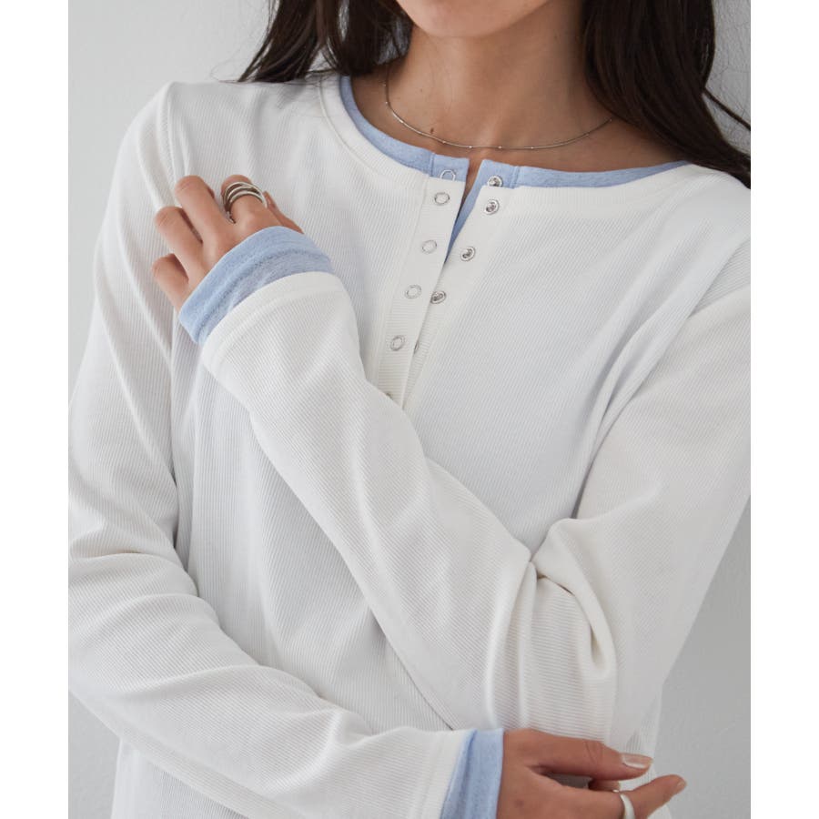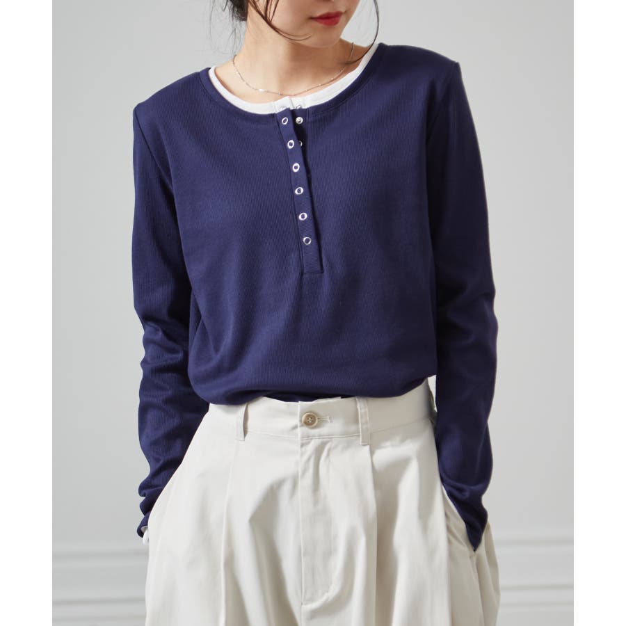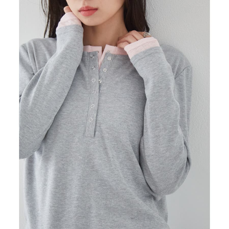 ほどよく効いた差し色がワンポイントになり、一枚でも着映えするヘンリーネックプルオーバー。