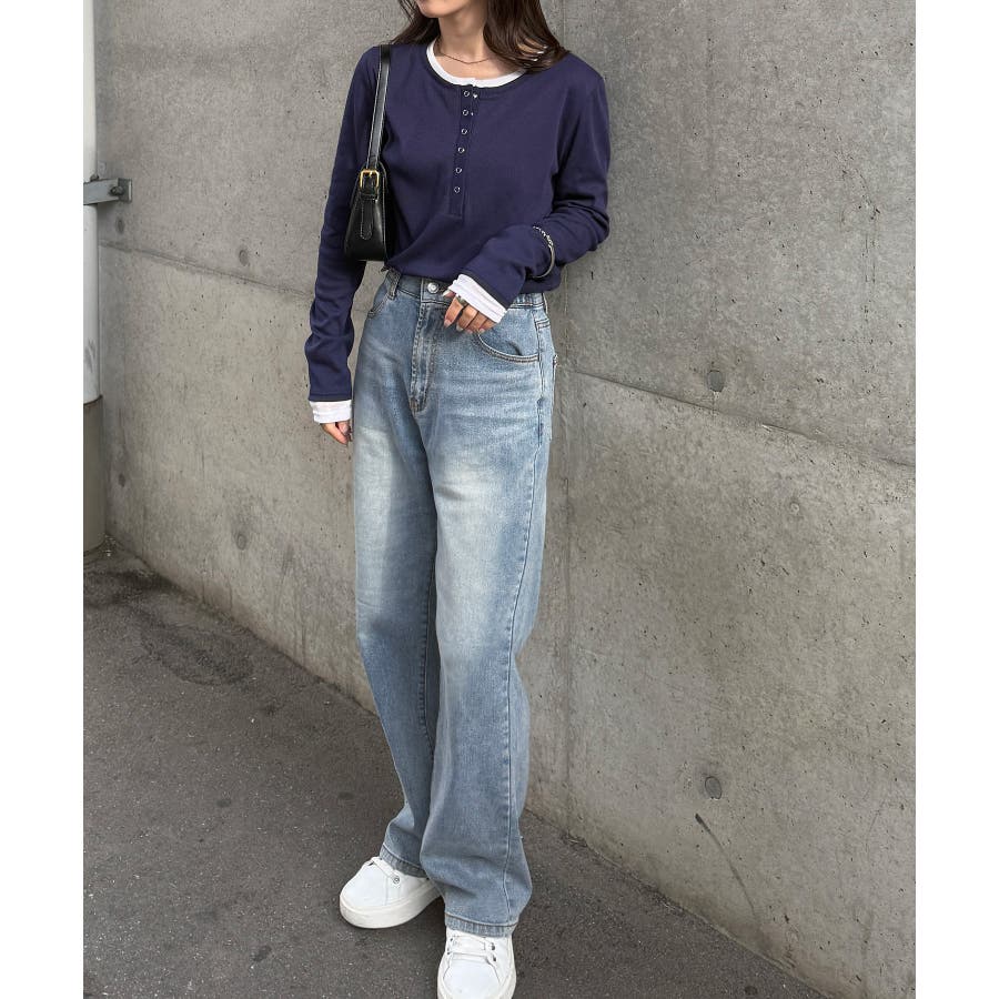 ヘンリーネックのボタンは自由に調整でき、首元の見え方を自在にアレンジ可能!