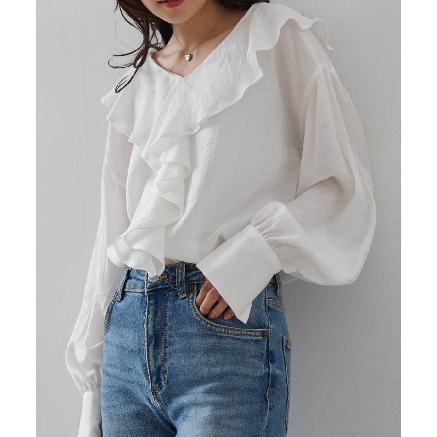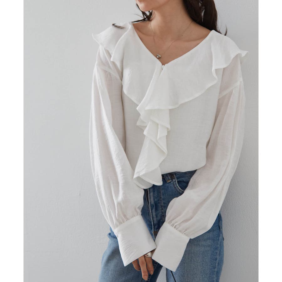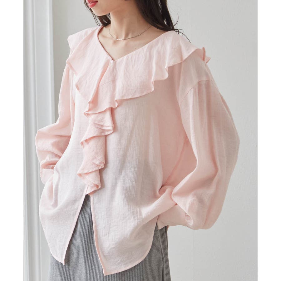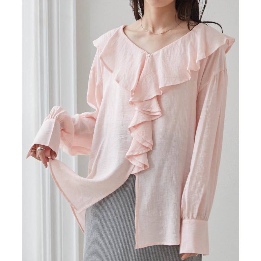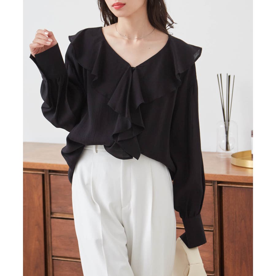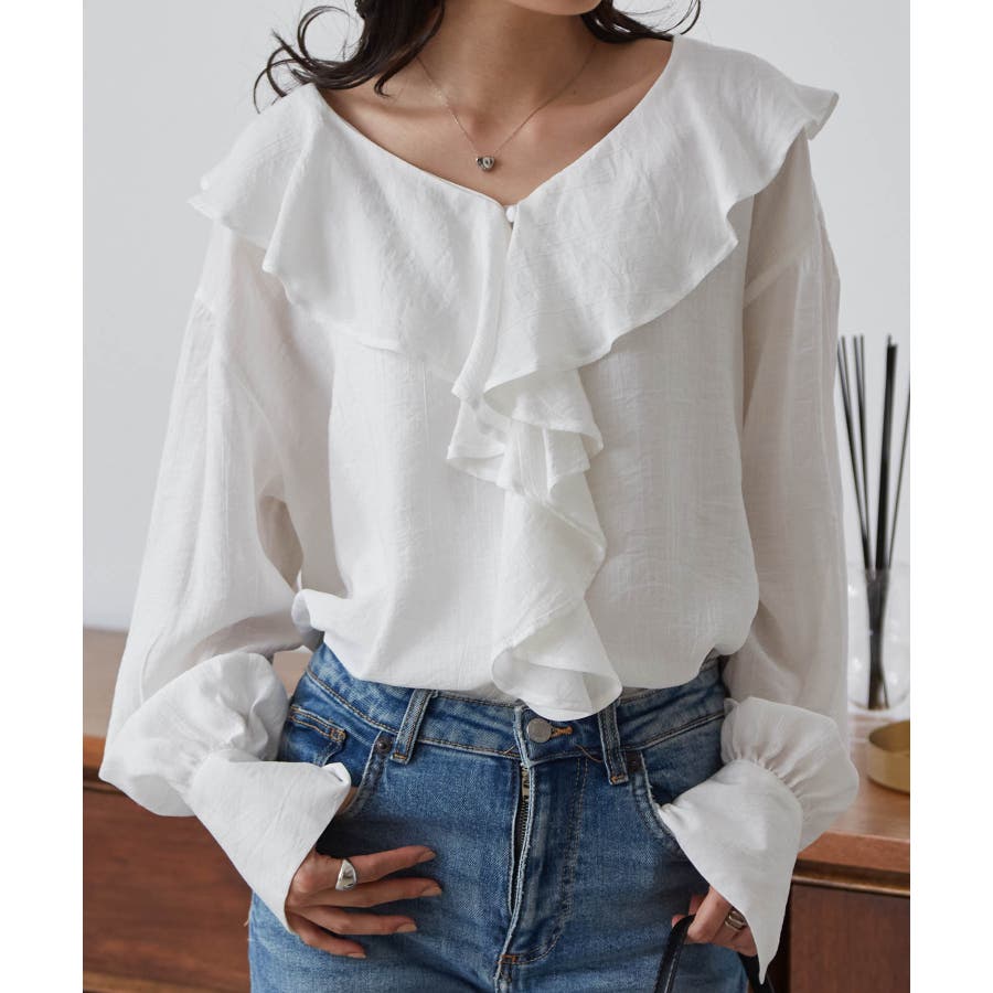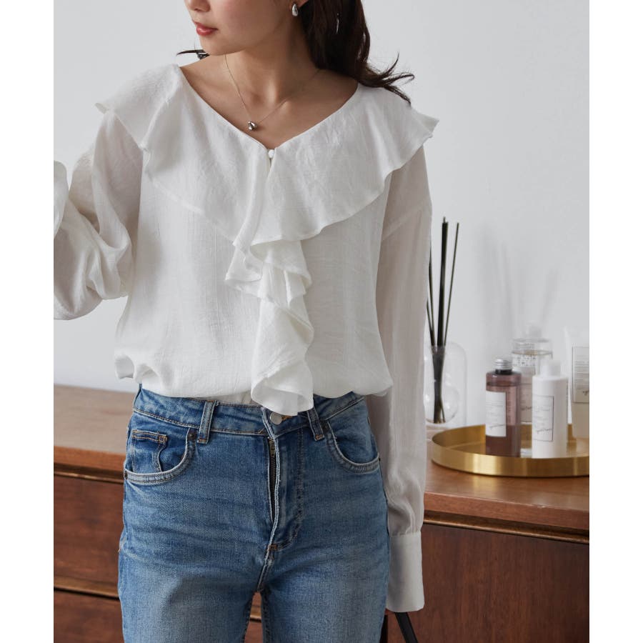 デコルテが見えるVネックで、フリルデザインでも顔まわりがすっきり見えます。