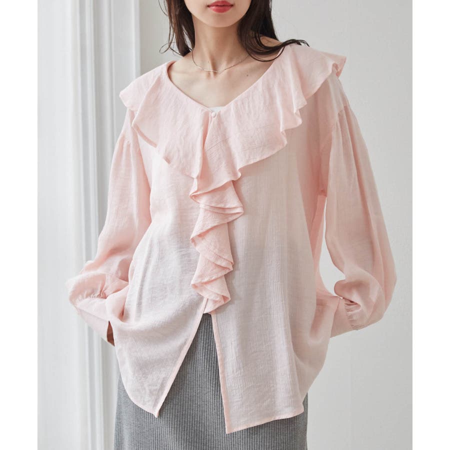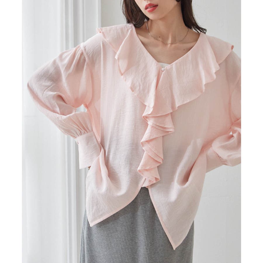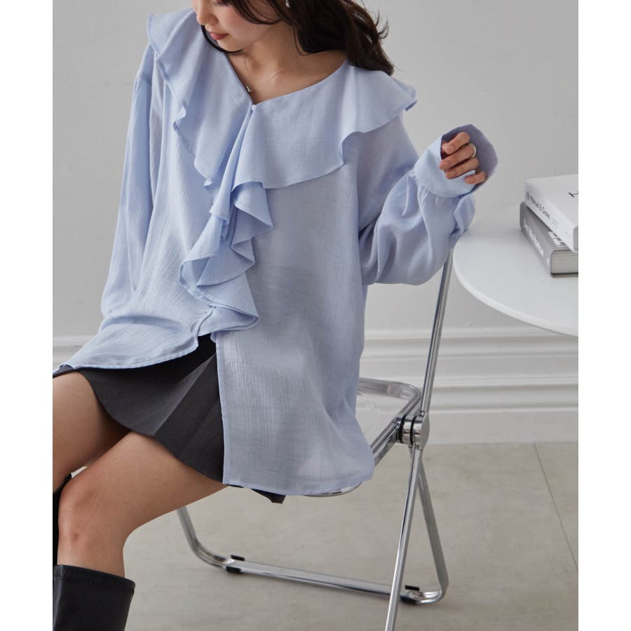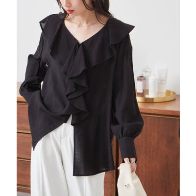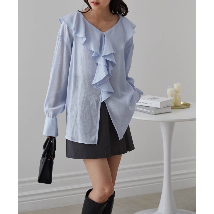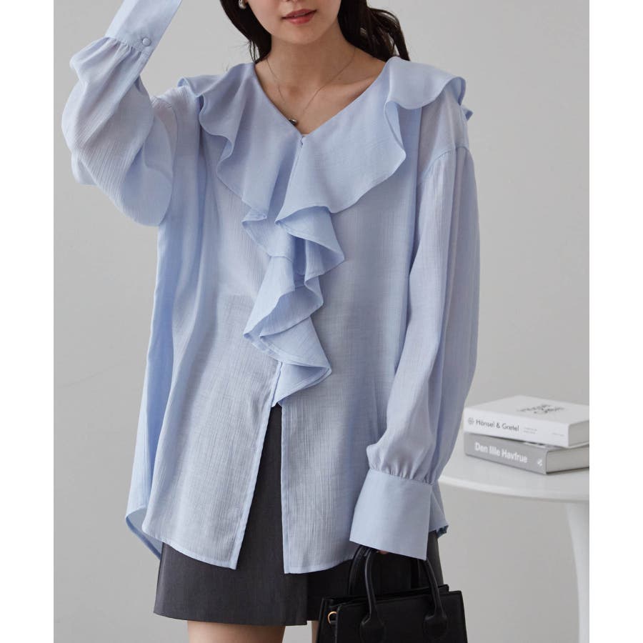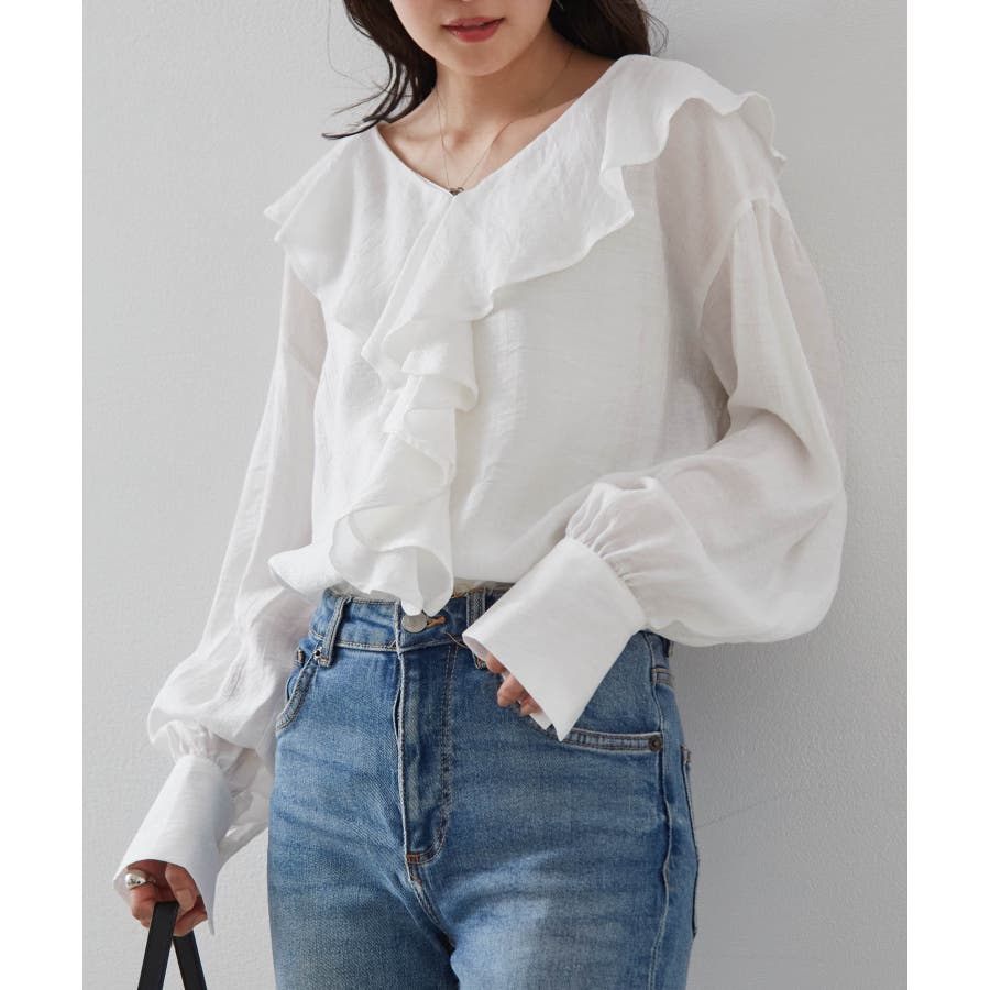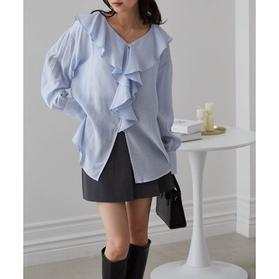 デコルテが見えるVネックで、フリルデザインでも顔まわりがすっきり見えます。